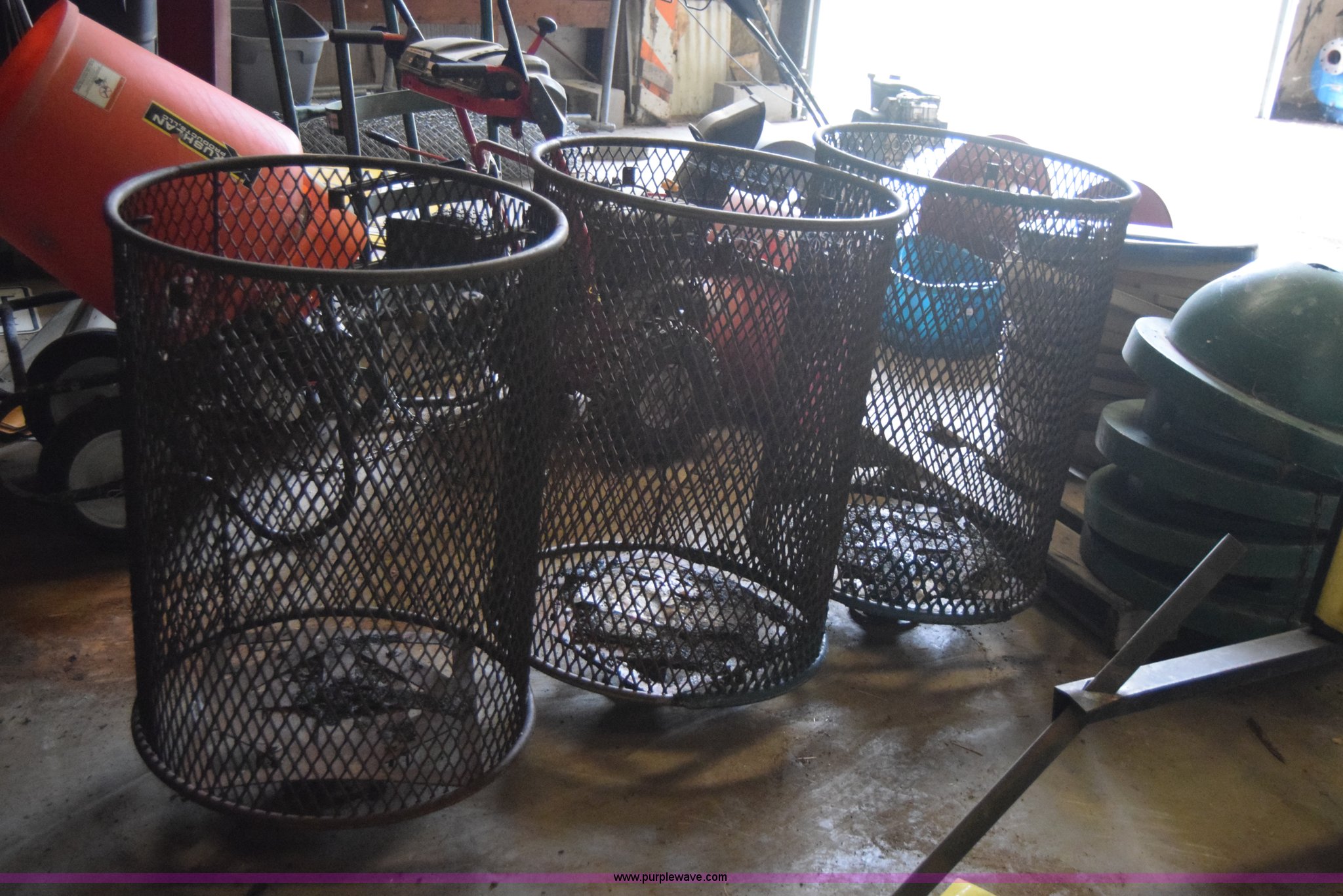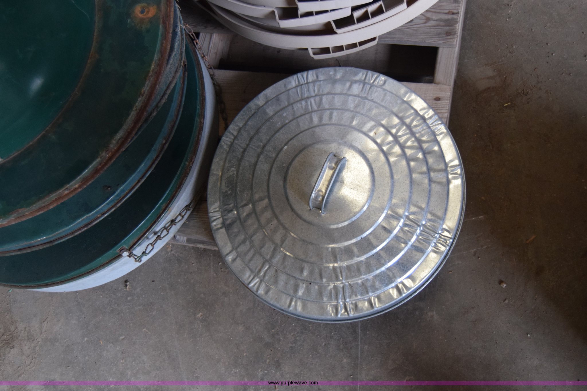 Purple Wave is selling a used All Other Household Items in Kansas. This item is a Assorted trash cans with the following: (3) metal trash cans, 24" diameter x 38"H, (10) metal trash can lids, (10) plastic trash can lids, Conditions vary