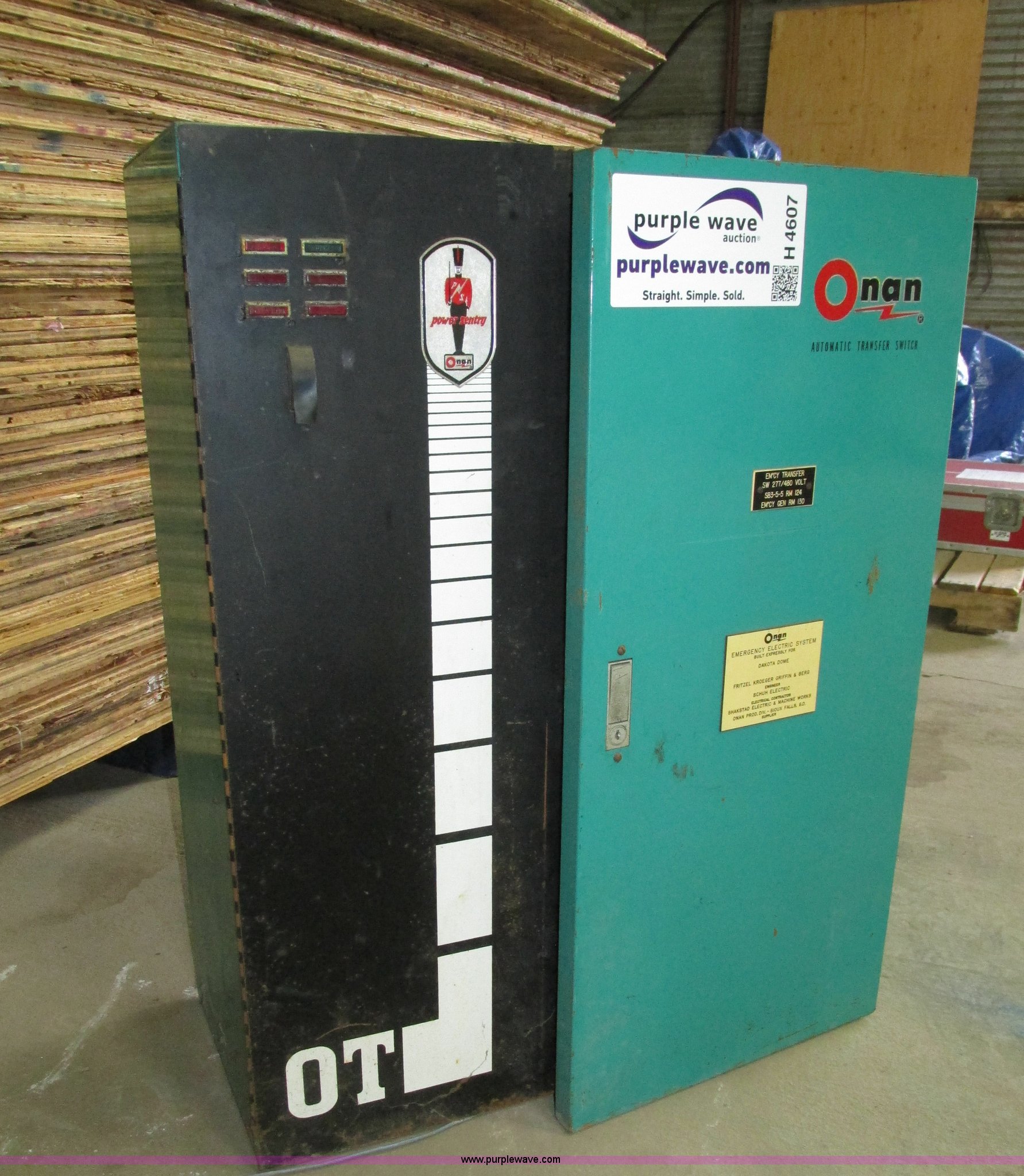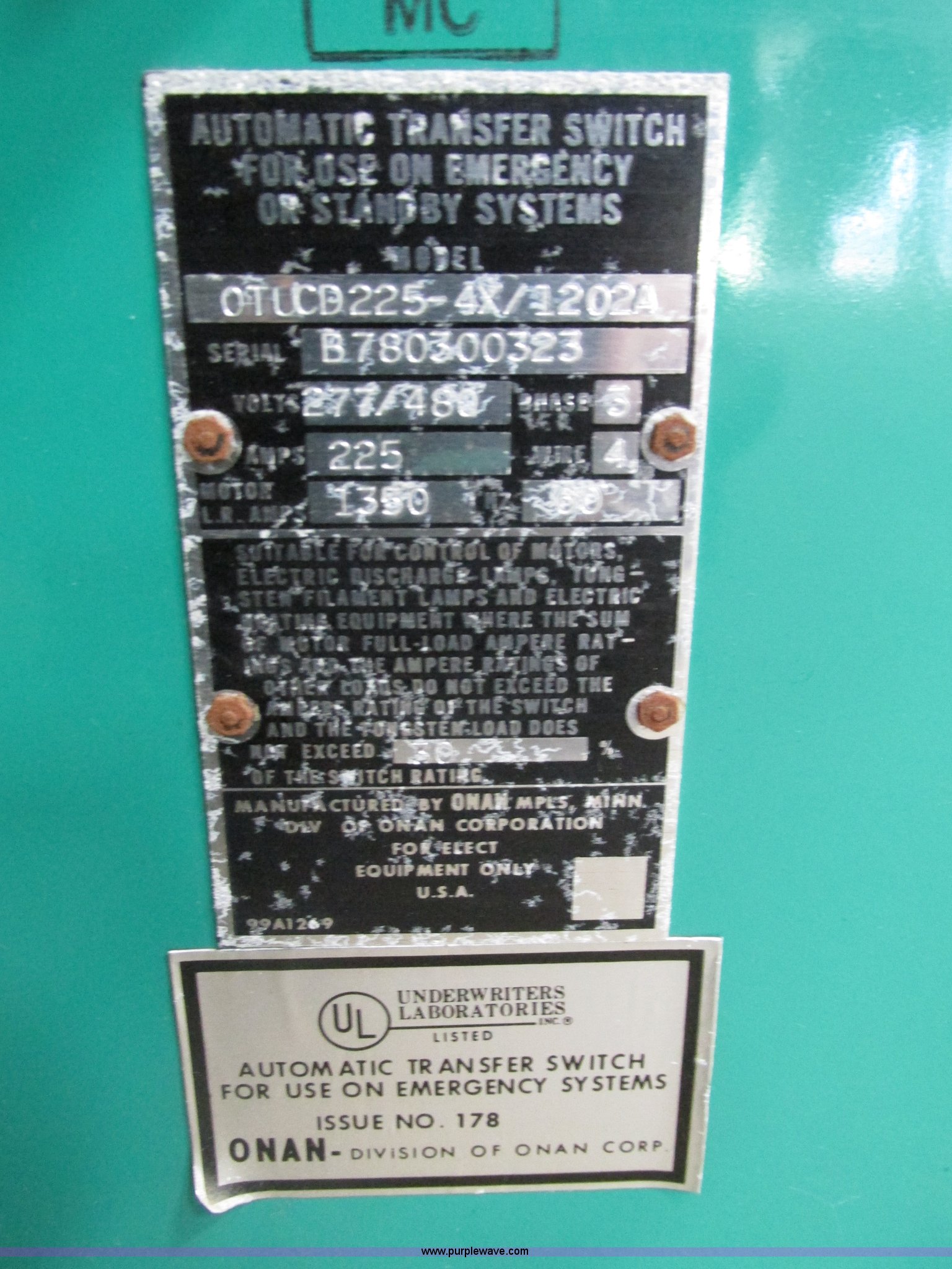 Purple Wave is selling a used Generator Set in South Dakota. This item is a Onan automatic transfer switch with the following: Model 0TUCD225-4X/1202A, Approximately 29"W x 15"D x 36"H, 277/480V, Three phase, Four prong twist lock plug, Serial B780300323