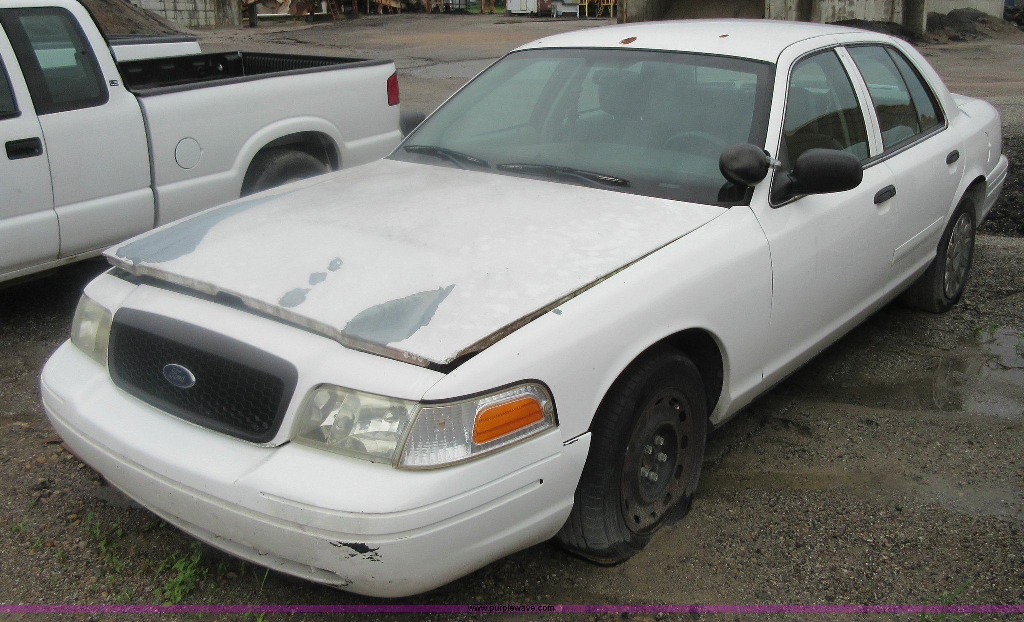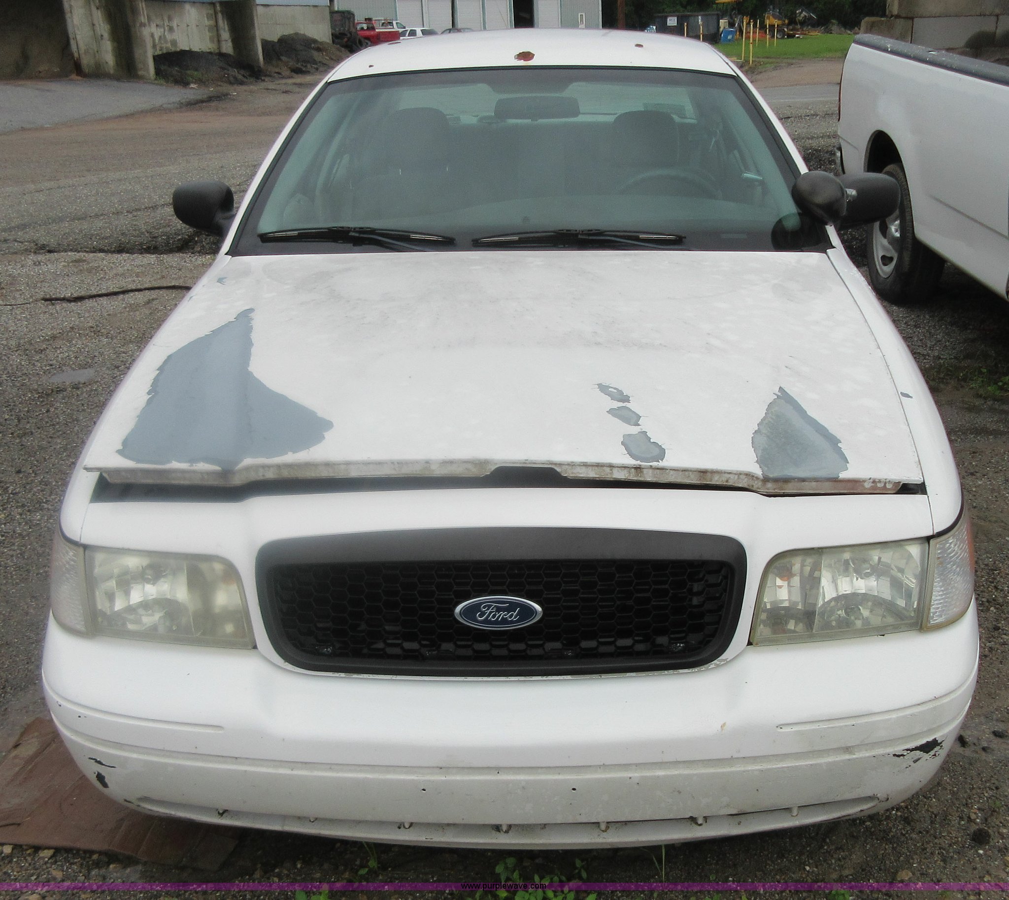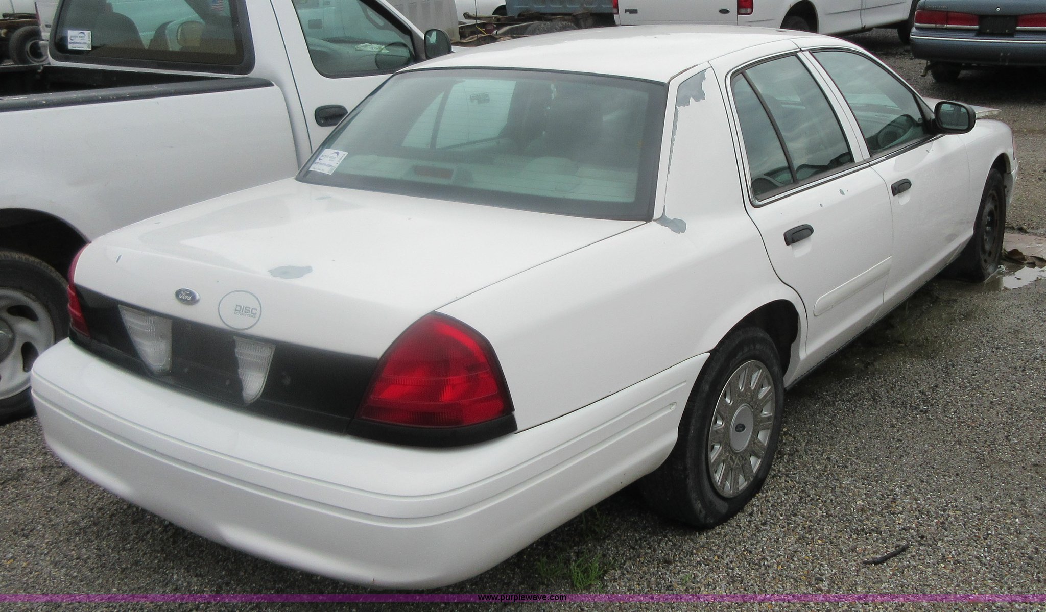 Purple Wave is selling a used Passenger Vehicle in Kansas. This item is a 2004 Ford Crown Victoria Police Interceptor with the following: 148,134 miles on odometer, 4.6L V8 SOHC 16V gas engine, Automatic transmission, AC and heat, Tilt, Cruise, AM/FM/cassette, Power windows, locks, mirrors, and seat, Cloth interior, Spot light, 225/60R16 tires, Interior/exterior cosmetic damage, Tires need to be replaced, Differential whine, Windshield cracked, Paint peeling, Dead battery, Unit # 334-001