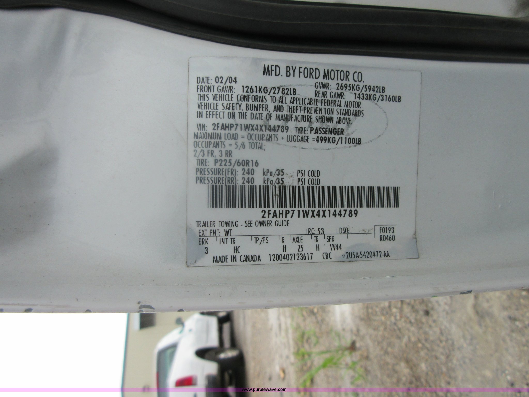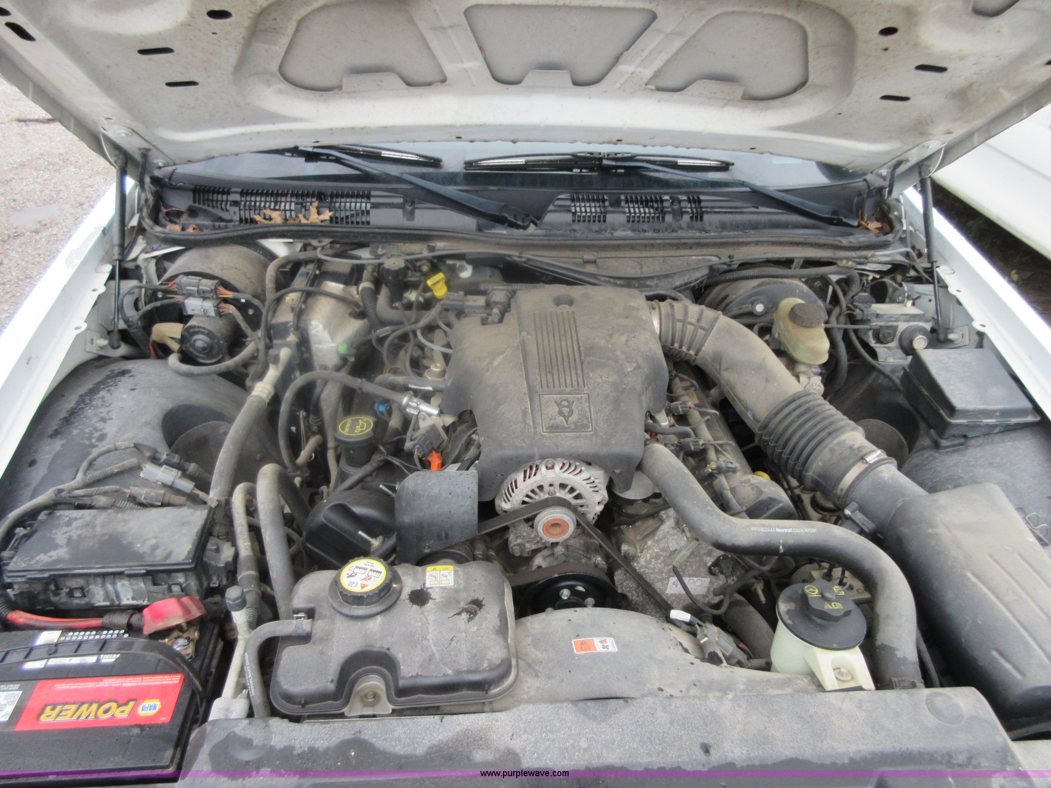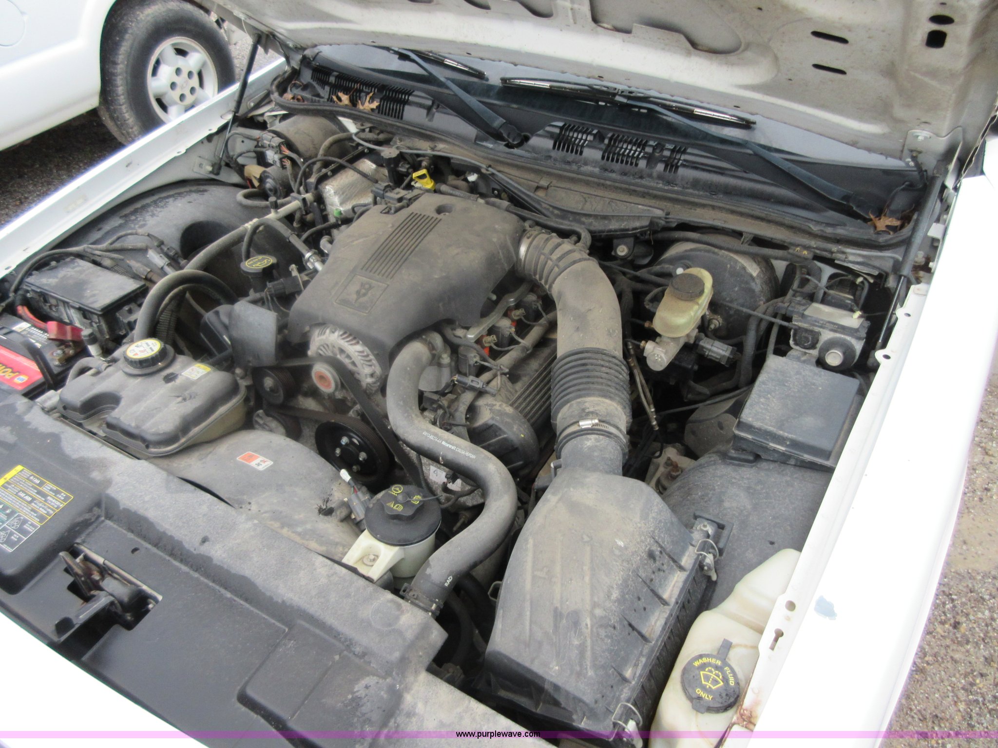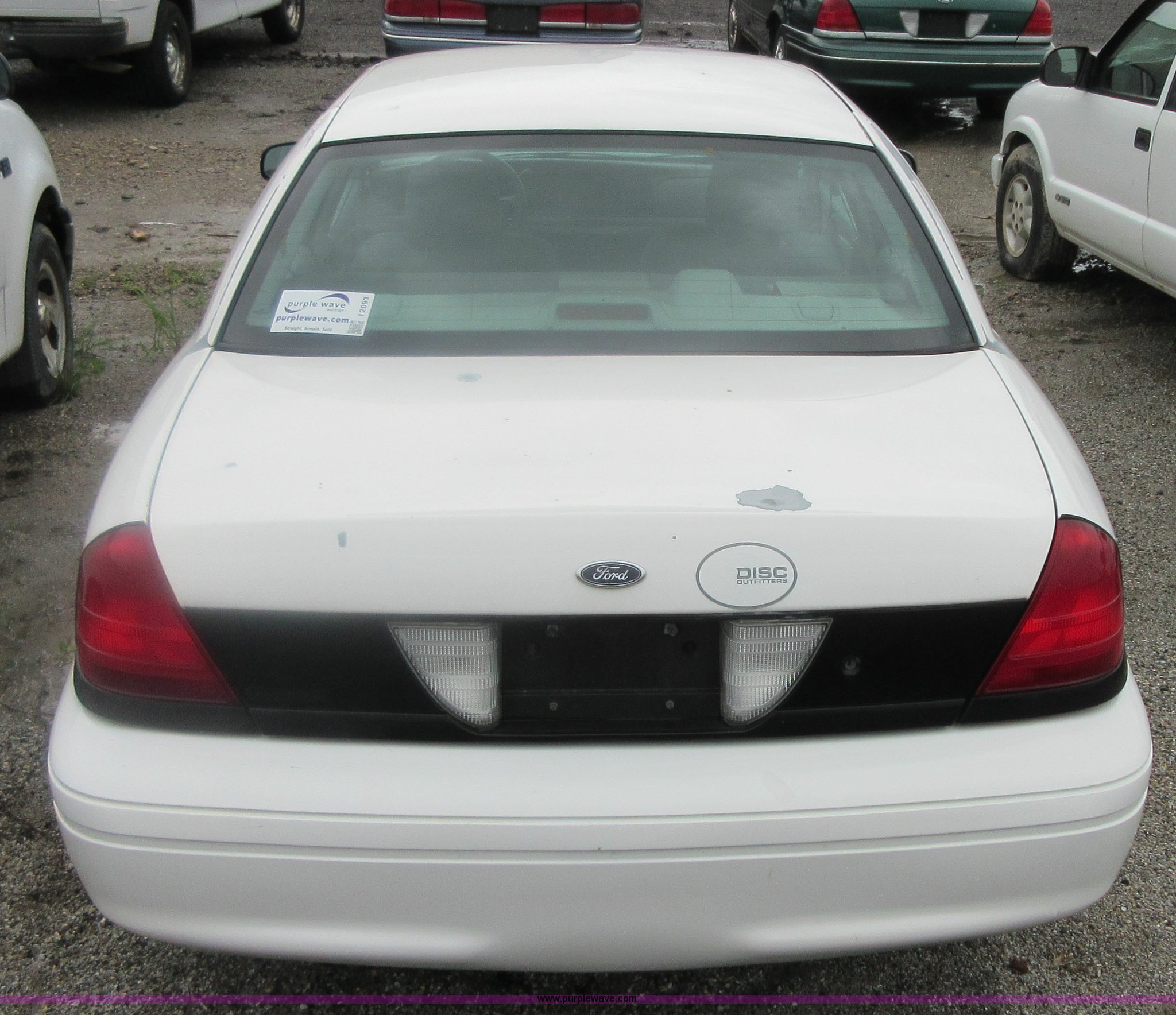 Purple Wave is selling a used Passenger Vehicle in Kansas. This item is a 2004 Ford Crown Victoria Police Interceptor with the following: 148,134 miles on odometer, 4.6L V8 SOHC 16V gas engine, Automatic transmission, AC and heat, Tilt, Cruise, AM/FM/cassette, Power windows, locks, mirrors, and seat, Cloth interior, Spot light, 225/60R16 tires, Interior/exterior cosmetic damage, Tires need to be replaced, Differential whine, Windshield cracked, Paint peeling, Dead battery, Unit # 334-001
