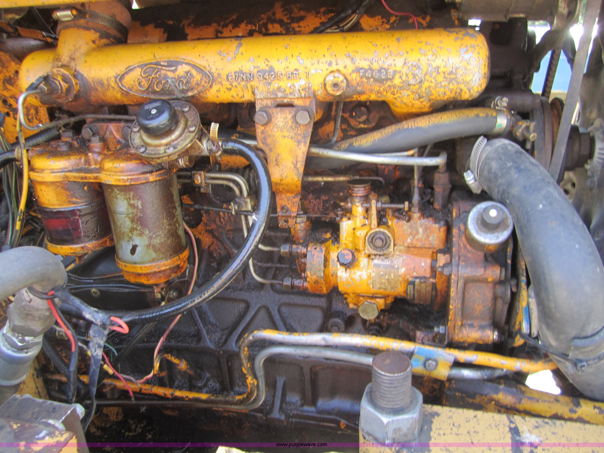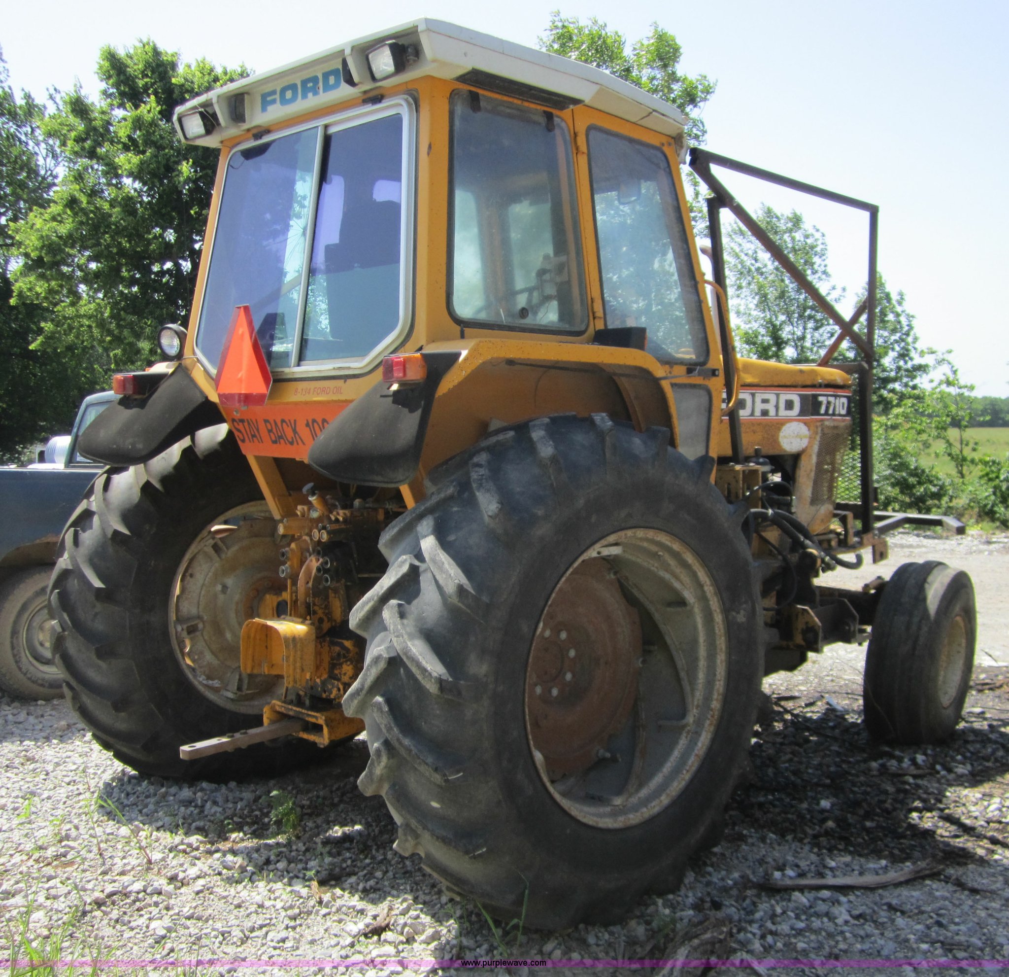 Purple Wave is selling a used Tractor in Kansas. This item is a 1990 Ford 7710 tractor with the following: 5,493 hours on meter, Ford four cylinder turbo diesel engine, 12F-4R gears, Transmission inoperable, Differential lock, AC and heat, Air suspension seat, Tilt steering wheel, Shades, Front mount live PTO, 540 PTO, (3) rear hydraulic remote sets, Tiger mower chassis kit, 11.00-16 front tires, 18.4-34 rear tires, Serial BC54413, Unit# 4