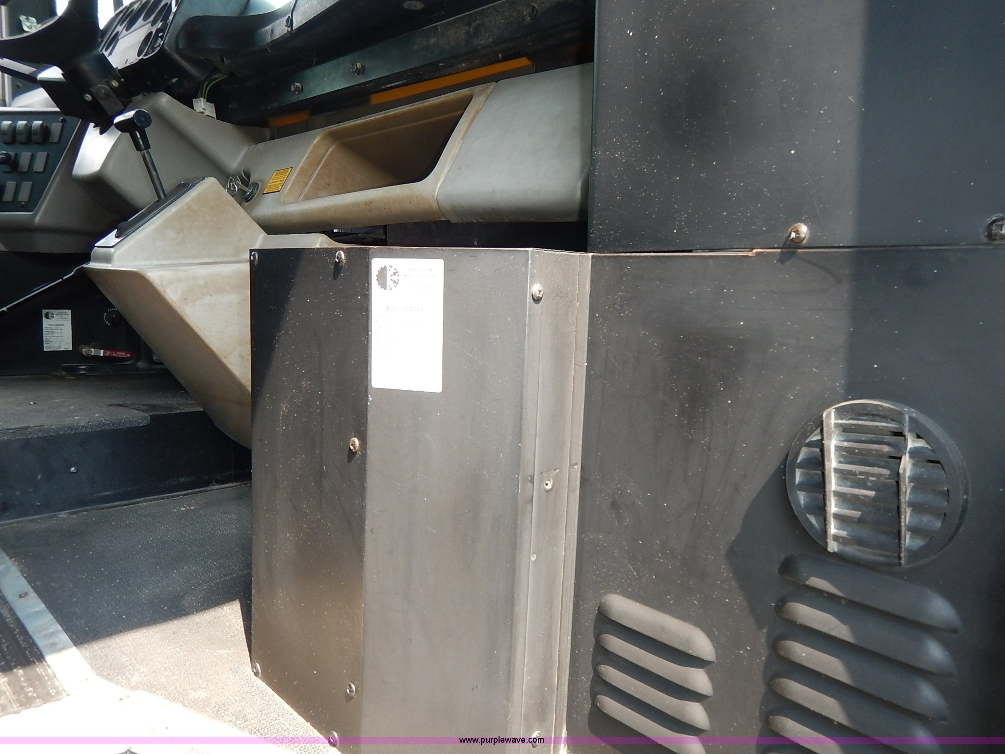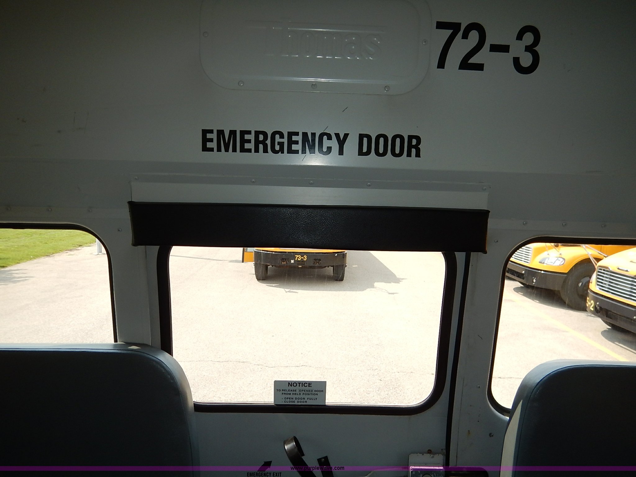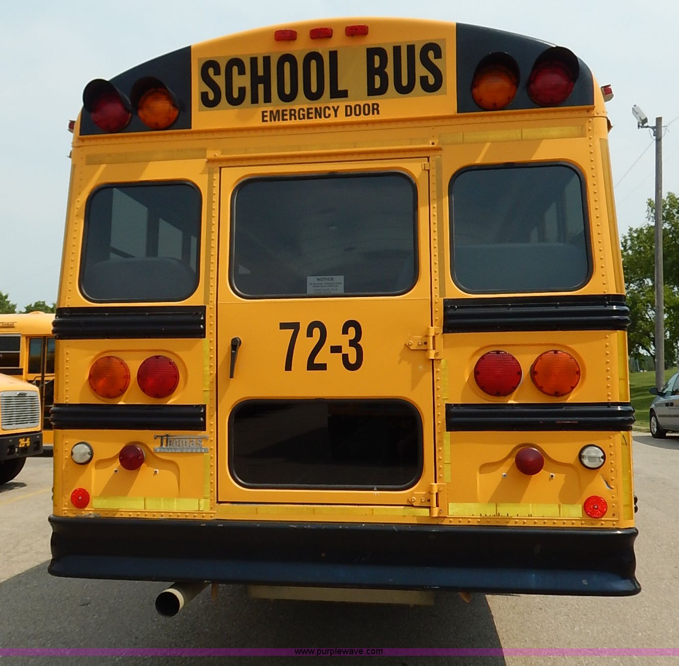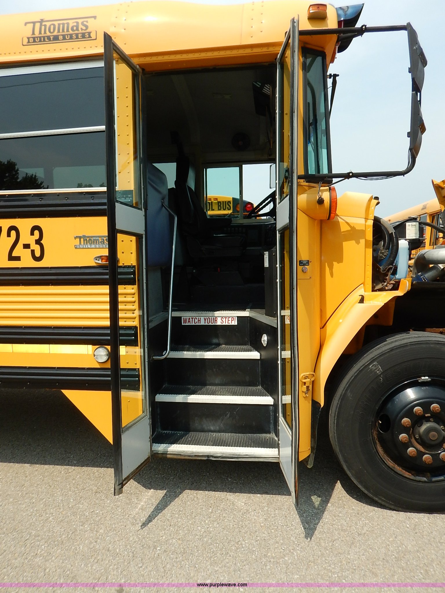 Purple Wave is selling a used Bus in Kansas. This item is a 2003 Thomas Built FS65 school bus with the following: 154,700 miles on odometer, Caterpillar 3126 7.2L L6 turbo diesel engine, 246 HP, Automatic transmission, Heat, AM/FM/cassette, Manual windows and locks, Cloth driver interior, Vinyl passenger interior, RPM control, 65 passenger capacity, Heated mirrors, Block heater, 11R22.5 tires, GVWR 30,000 lbs, FAWR 10,000 lbs, RAWR 21,000 lbs, Dents, Scratches, Unit# 72-3