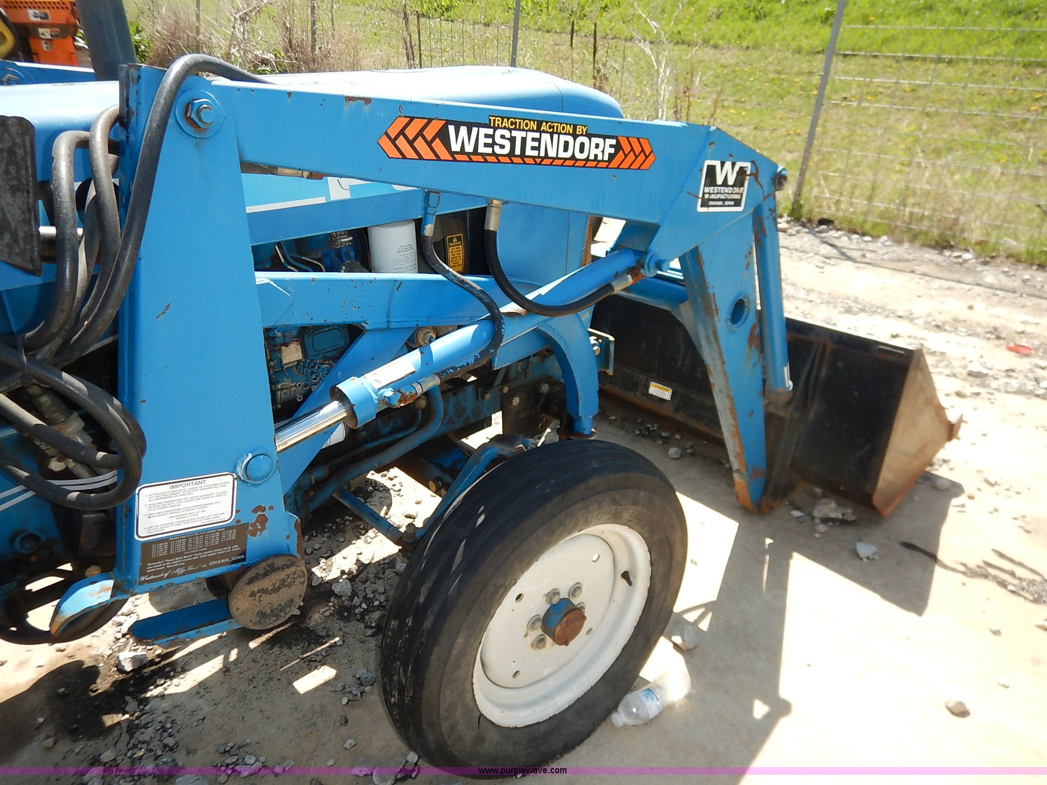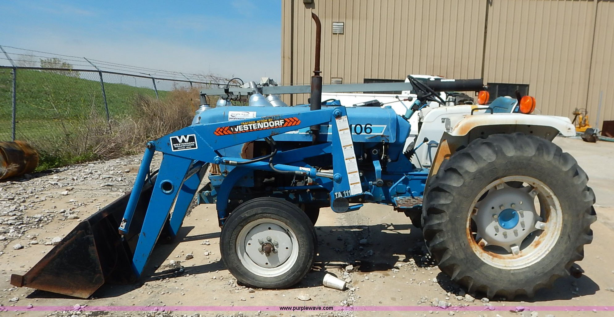 Purple Wave is selling a used Tractor in Kansas. This item is a 1985 Ford 1910 tractor with the following: 2,163 hours on meter, Ford three cylinder diesel engine, Serial T853A-13617, Manual transmission, 4F-1R gears, Flashers, Westendorf TA111 loader, 5'W bucket, Smooth cutting edge, Joystick controls, Three point, 540 PTO, 6.00-16 front tires, 13.6-24 rear tires, Clutch stuck, Water in oil, Dents, Scratches, Serial UP03323