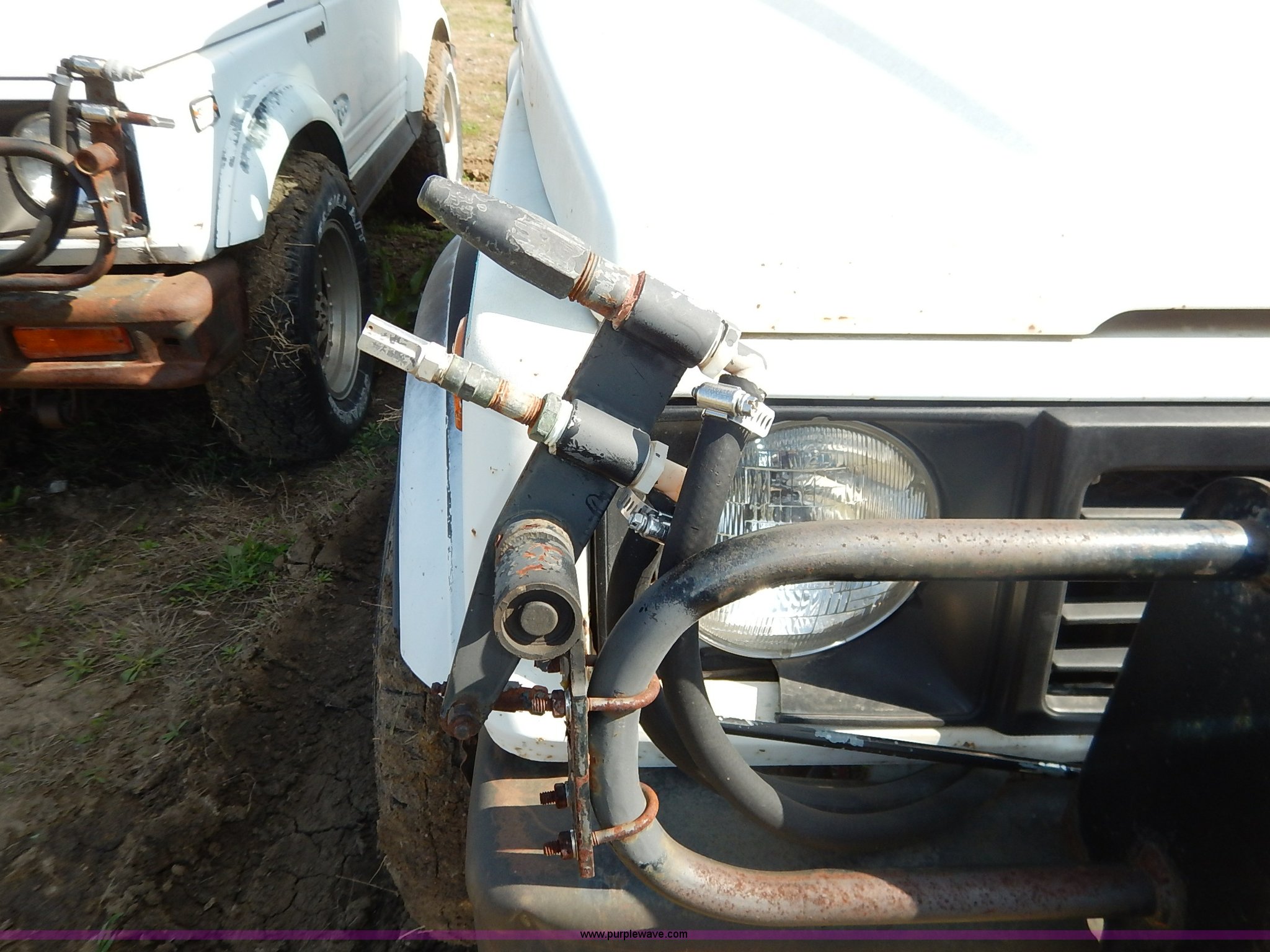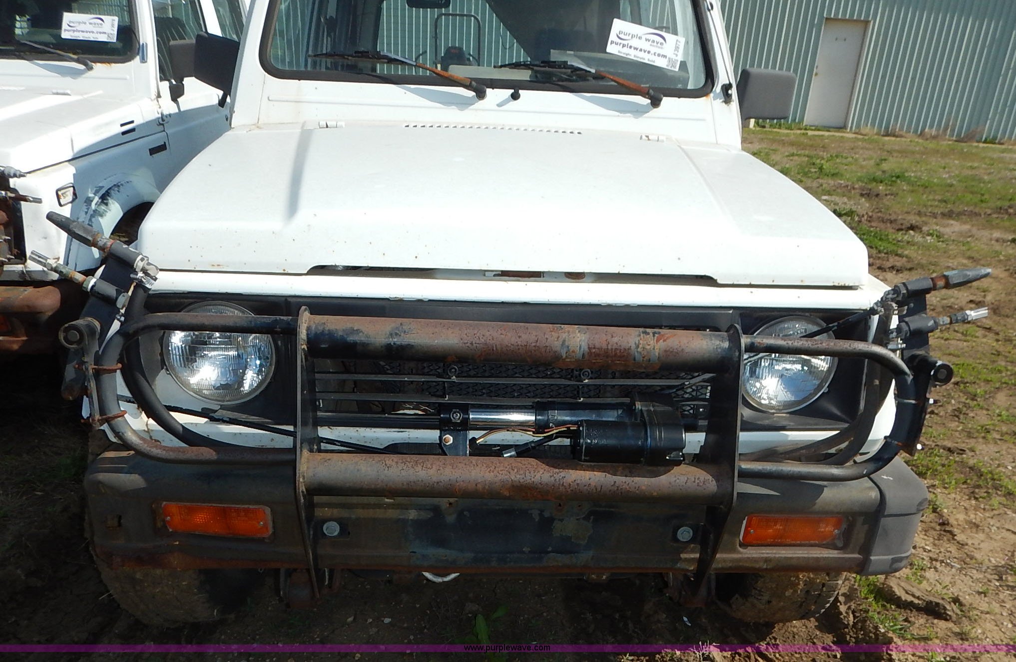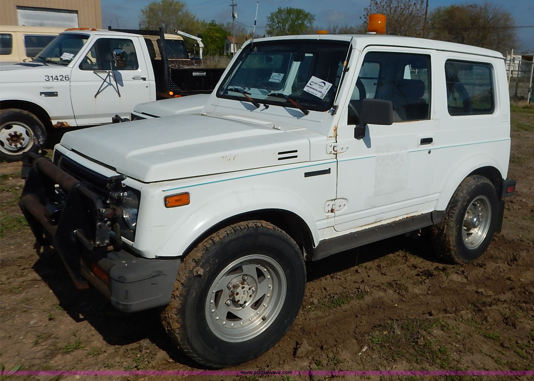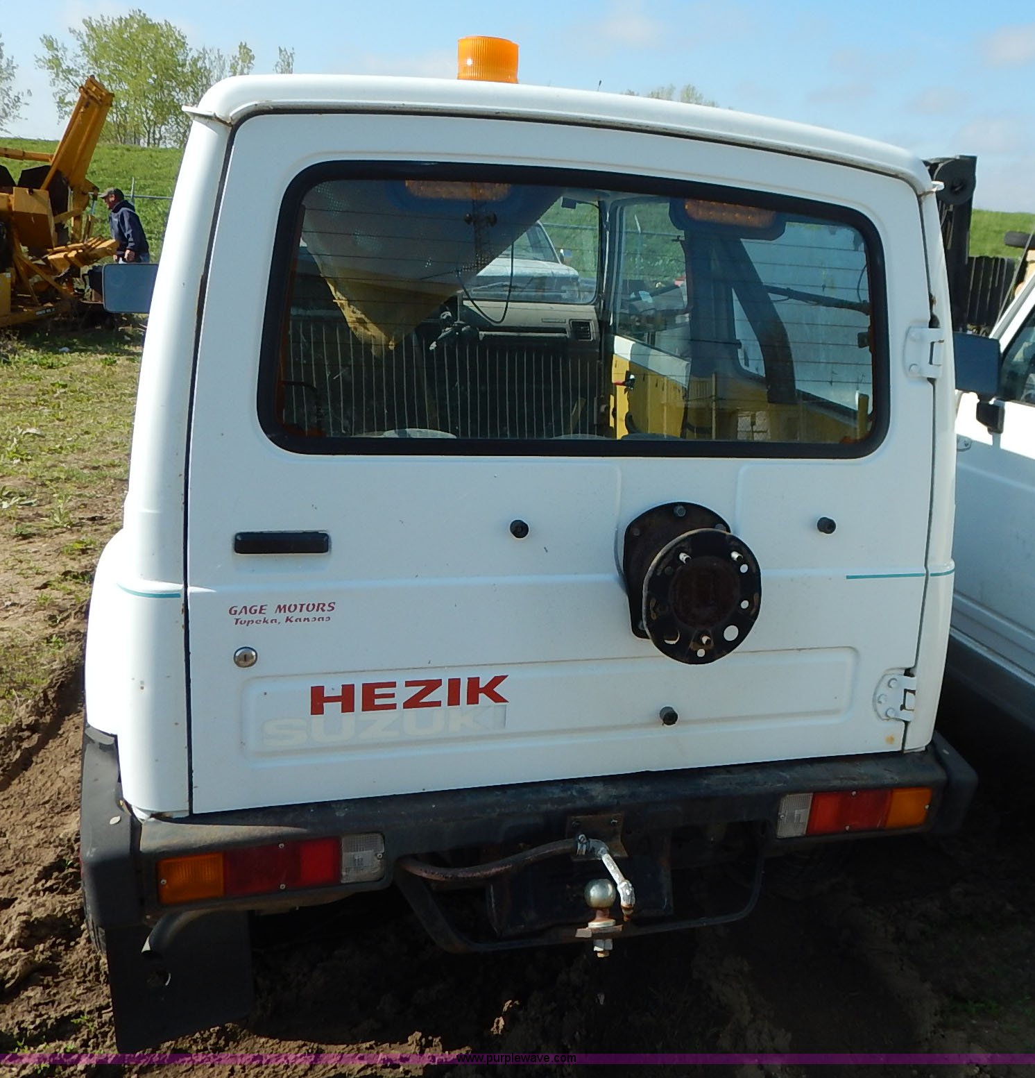 Purple Wave is selling a used Passenger Vehicle in Kansas. This item is a 1988 Suzuki Samurai Hezik SUV with the following: 5,333 miles on odometer, 1.3L L4 SOHC 8V gas engine, Five speed manual transmission, Four wheel drive, Heat, AM/FM/cassette, Cloth interior, Sunroof, Grill guard, Strobe light, Ball hitch, Sprayer controls, Electric pump for spray nozzles, (2) 25 gallon sprayer tanks, 225/70R15 tires, No brakes, Clutch issues, Dents, Scratches, No passenger or rear seats, No keys, Rust, Unknown operating condition