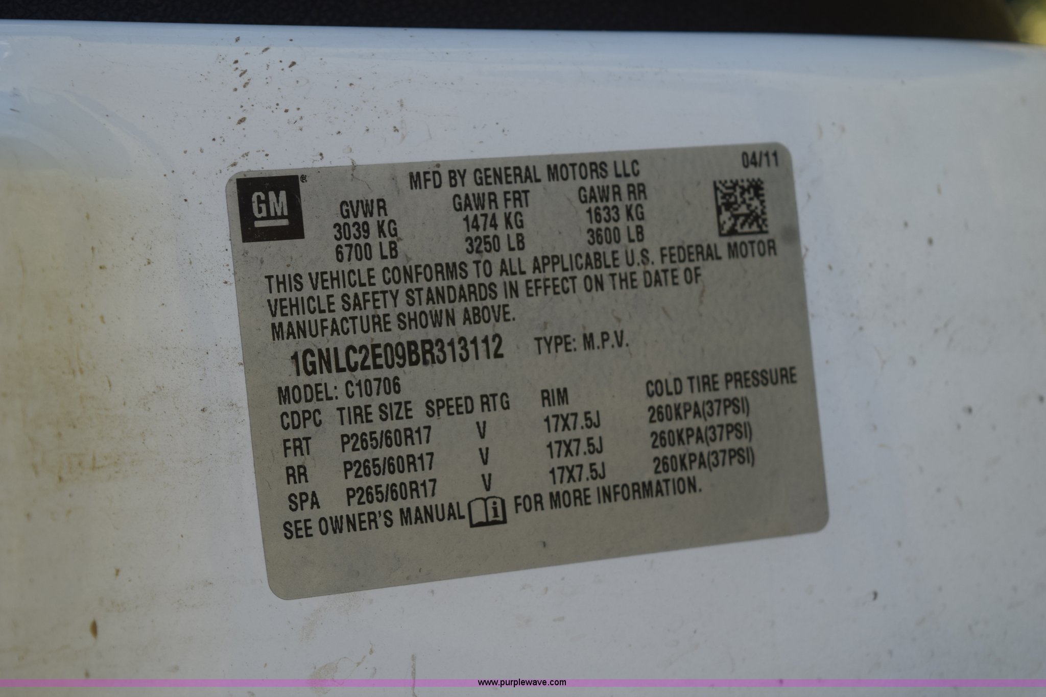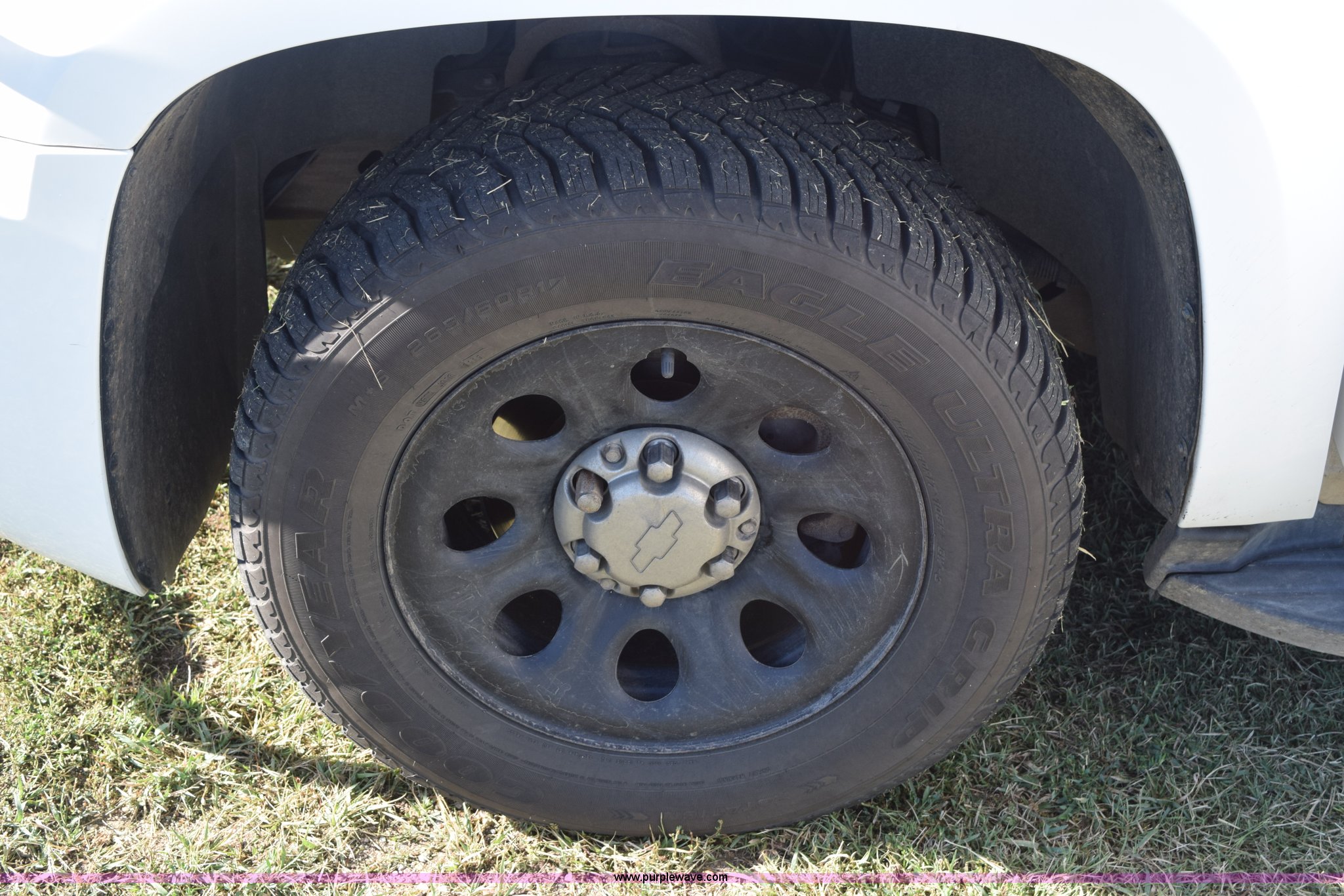 Purple Wave is selling a used Passenger Vehicle in Kansas. This item is a 2011 Chevrolet Tahoe Police SUV with the following: 117,326 miles on odometer, 5.3L V8 OHV 16V FFV gas engine, Automatic transmission, AC and heat, Tilt, Cruise, AM/FM/CD, Power windows, locks, mirrors, and seat, Cloth interior, Running boards, Front tow hooks, Grill guard, 265/60R17 tires