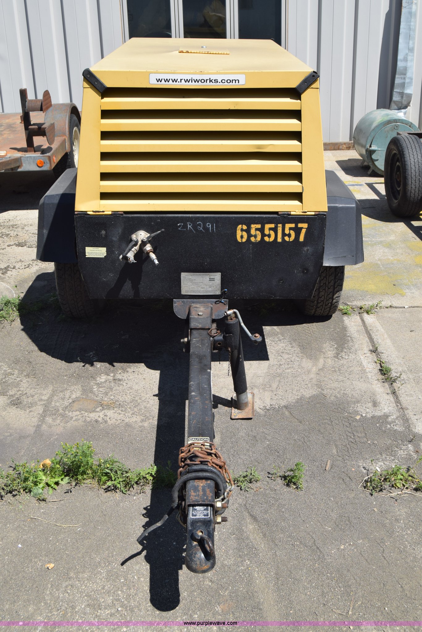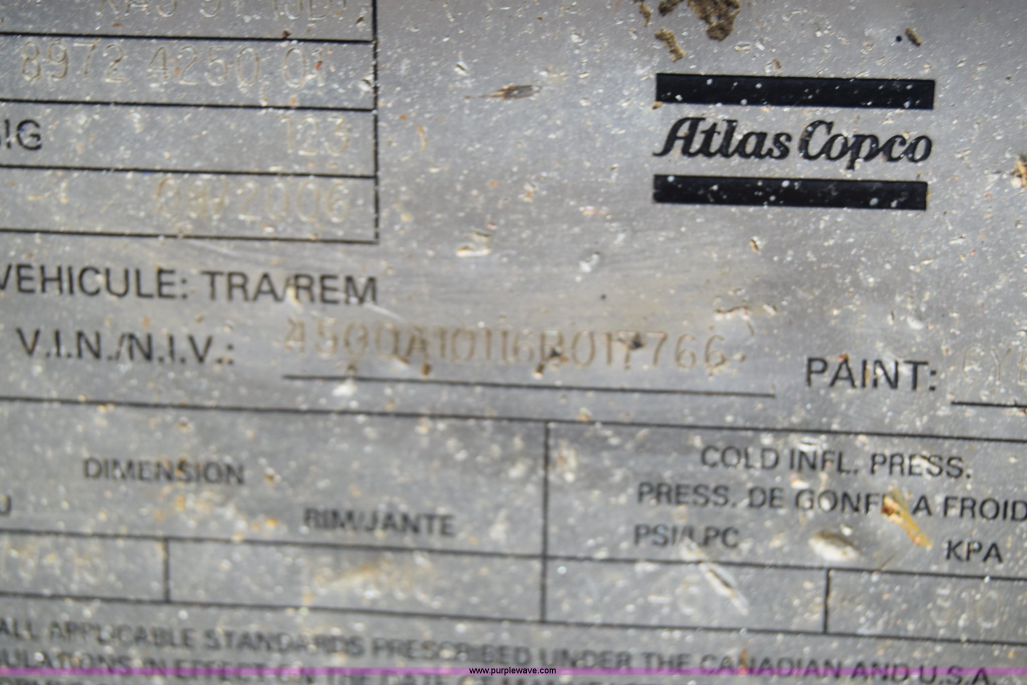 Atlas Copco XAS97JD air compressor. 2,562 hours on meter, John Deere 2.4L four cylinder diesel engine Serial PE4024T102293, Giancsi Edilio compressor, 160 psi, Tongue jack, 2" ball hitch, 205/75R15 tires. 4500A10116R017766. RWI Welding. 1011 11th Avenue N.E.. East Grand Forks, MN 56721
