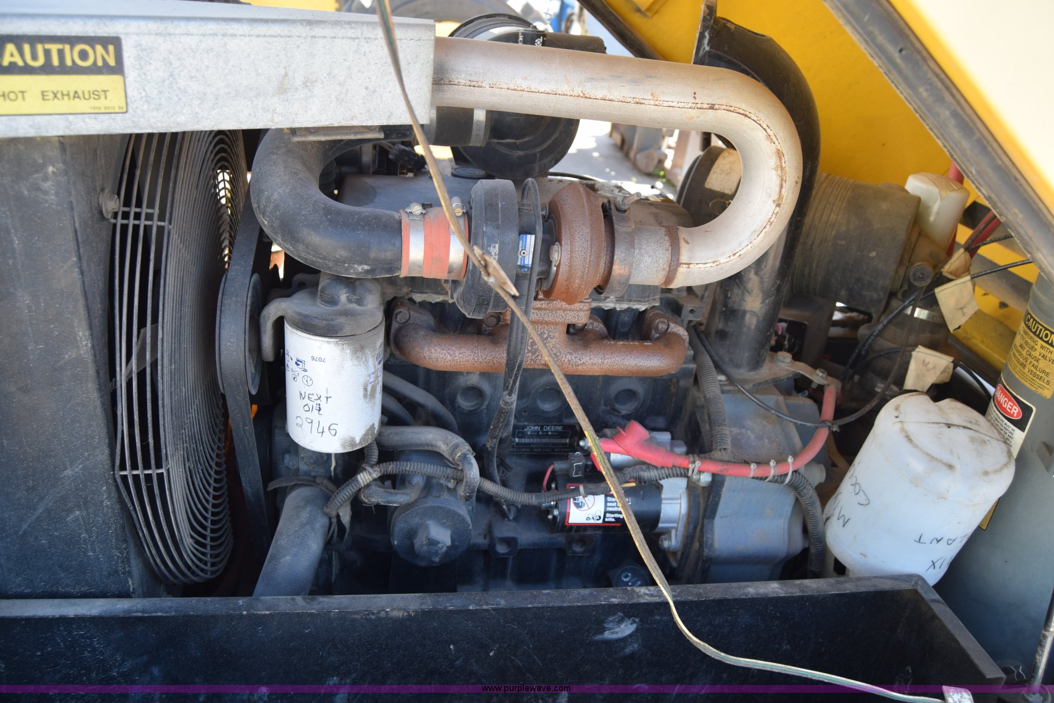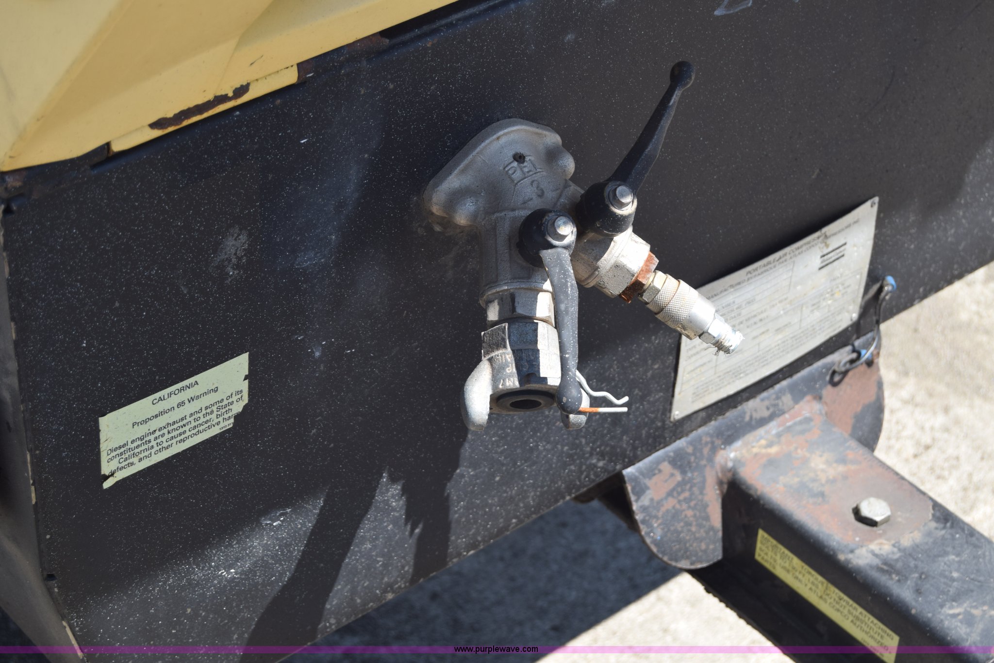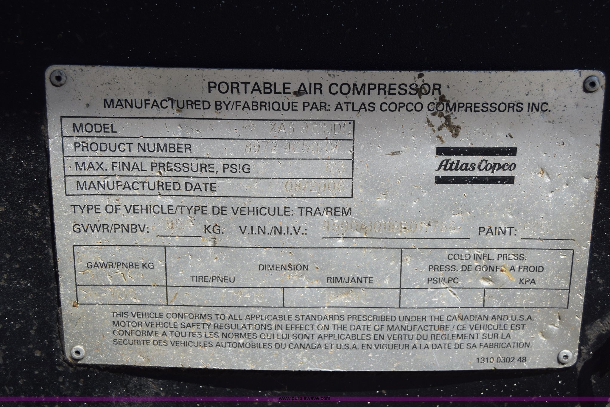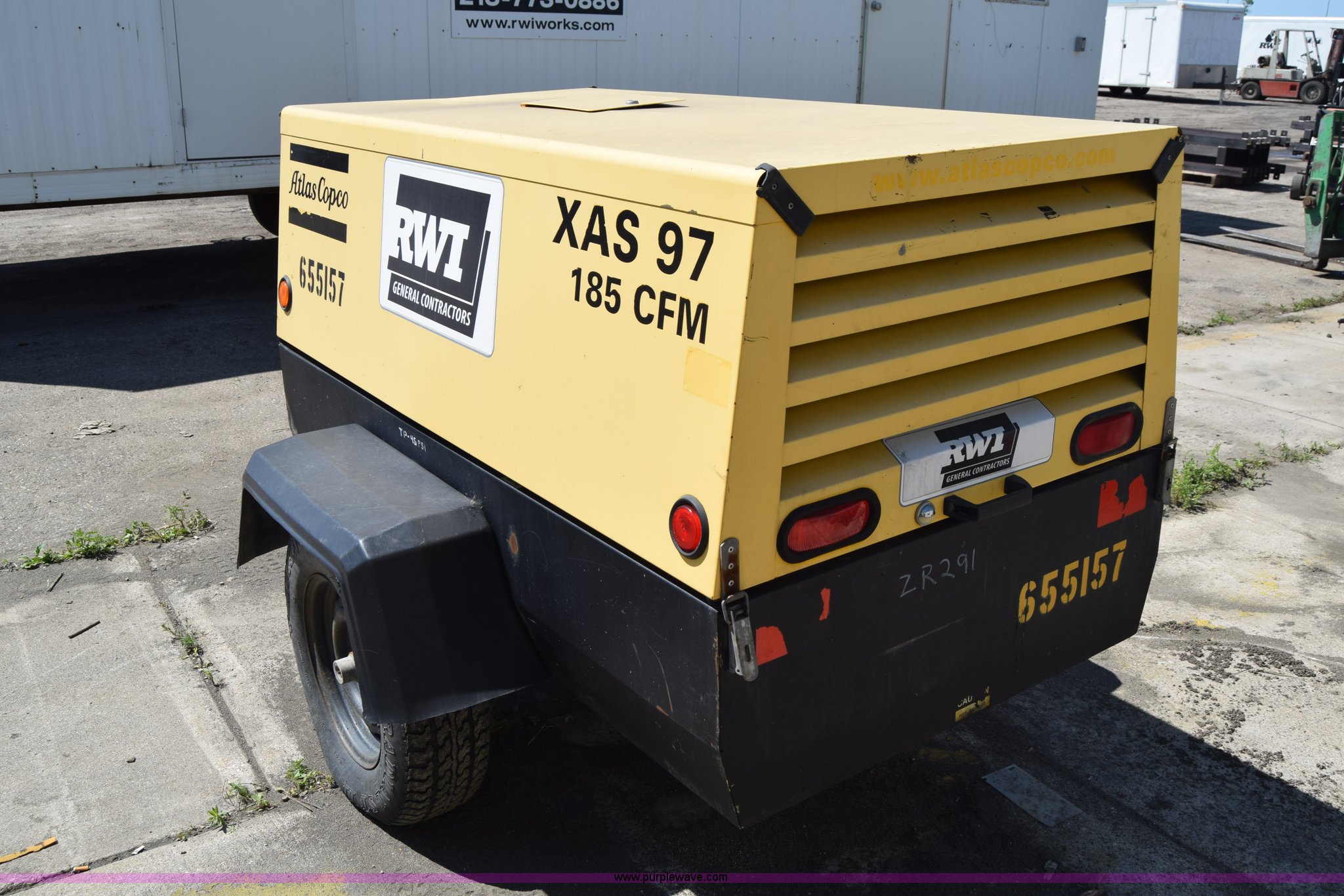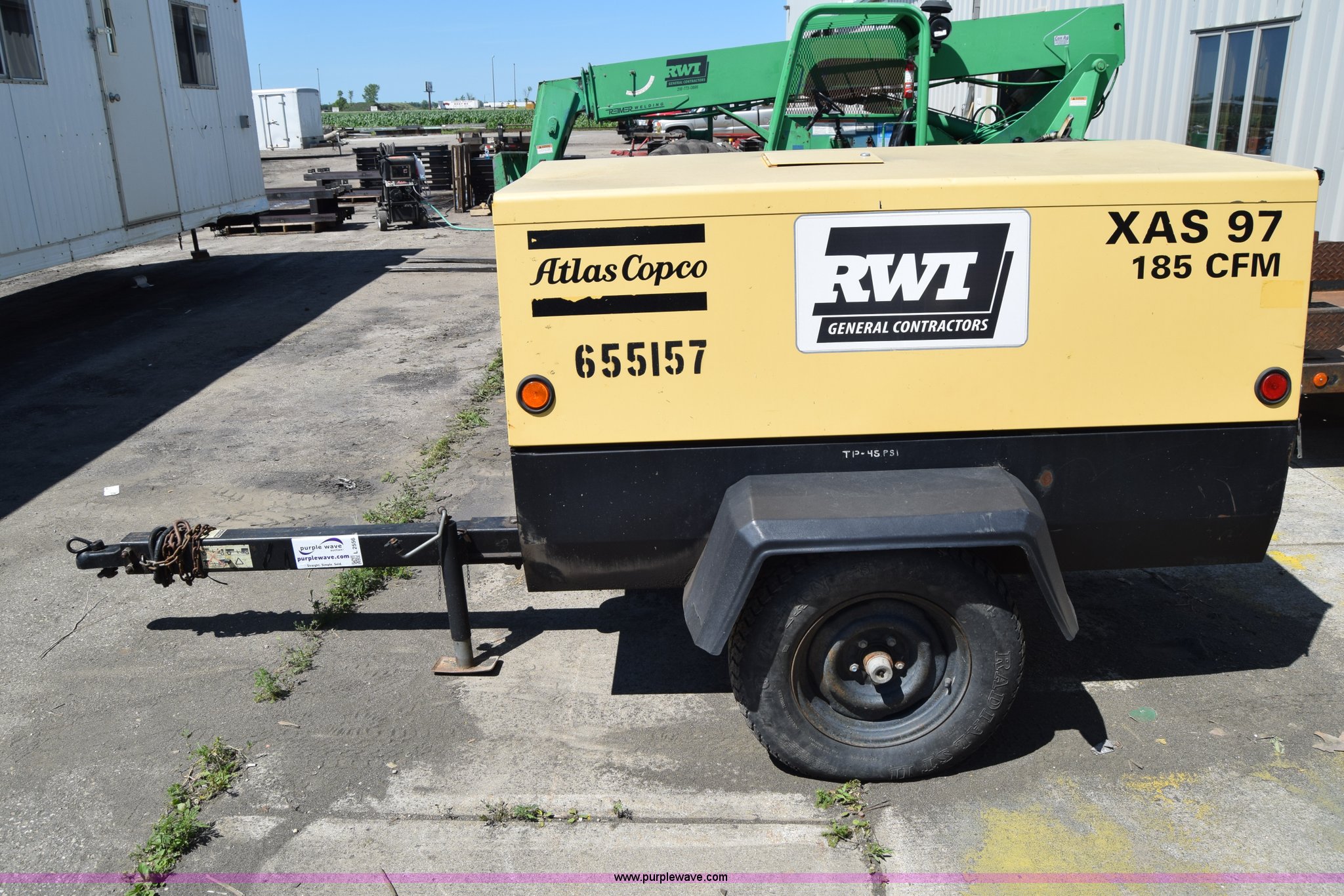 Purple Wave is selling a used Air Compressor in Minnesota. This item is a Atlas Copco XAS97JD air compressor with the following: 2,562 hours on meter, John Deere 2.4L four cylinder diesel engine, Serial PE4024T102293, Giancsi Edilio compressor, 160 psi, Tongue jack, 2" ball hitch, 205/75R15 tires