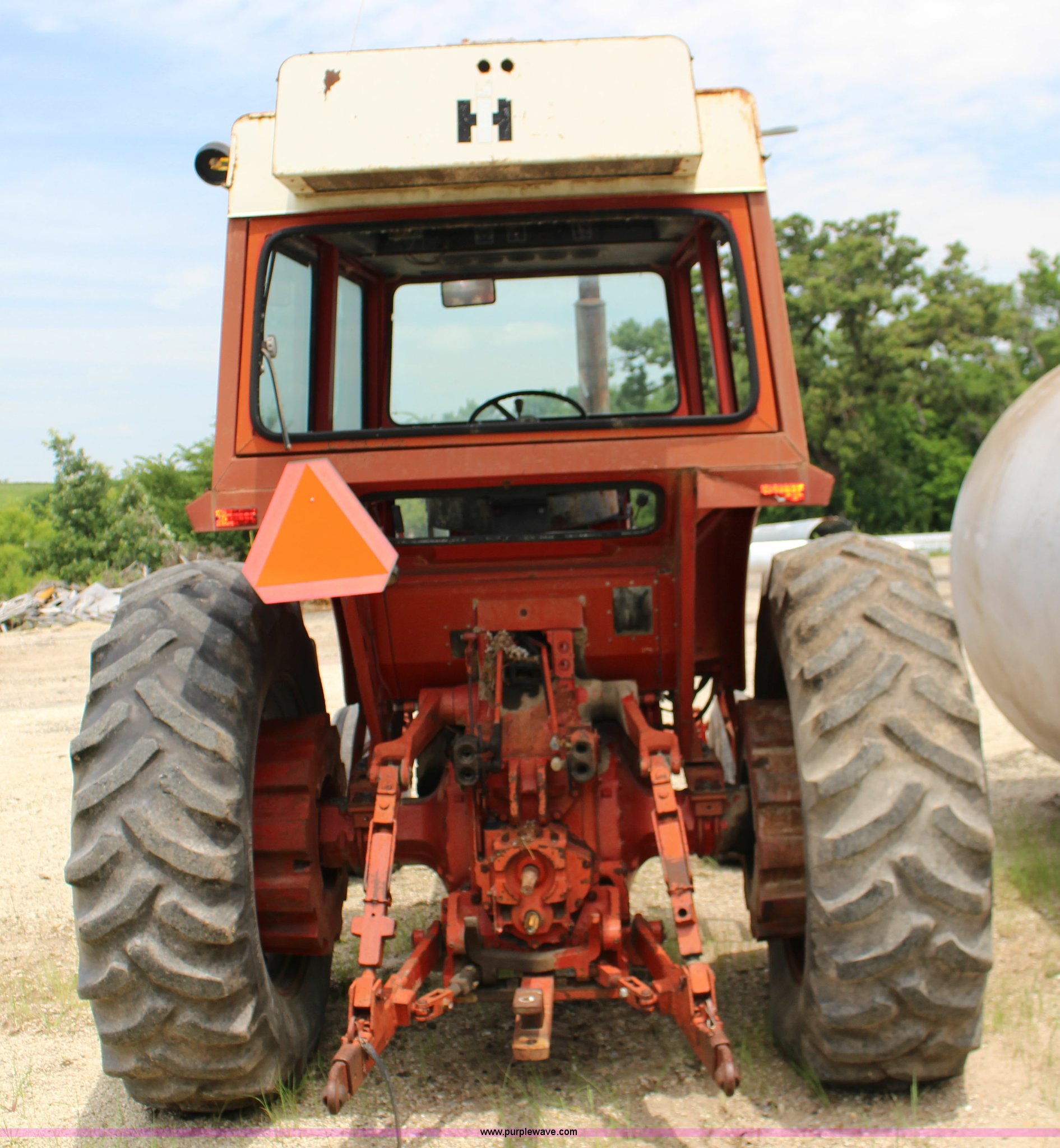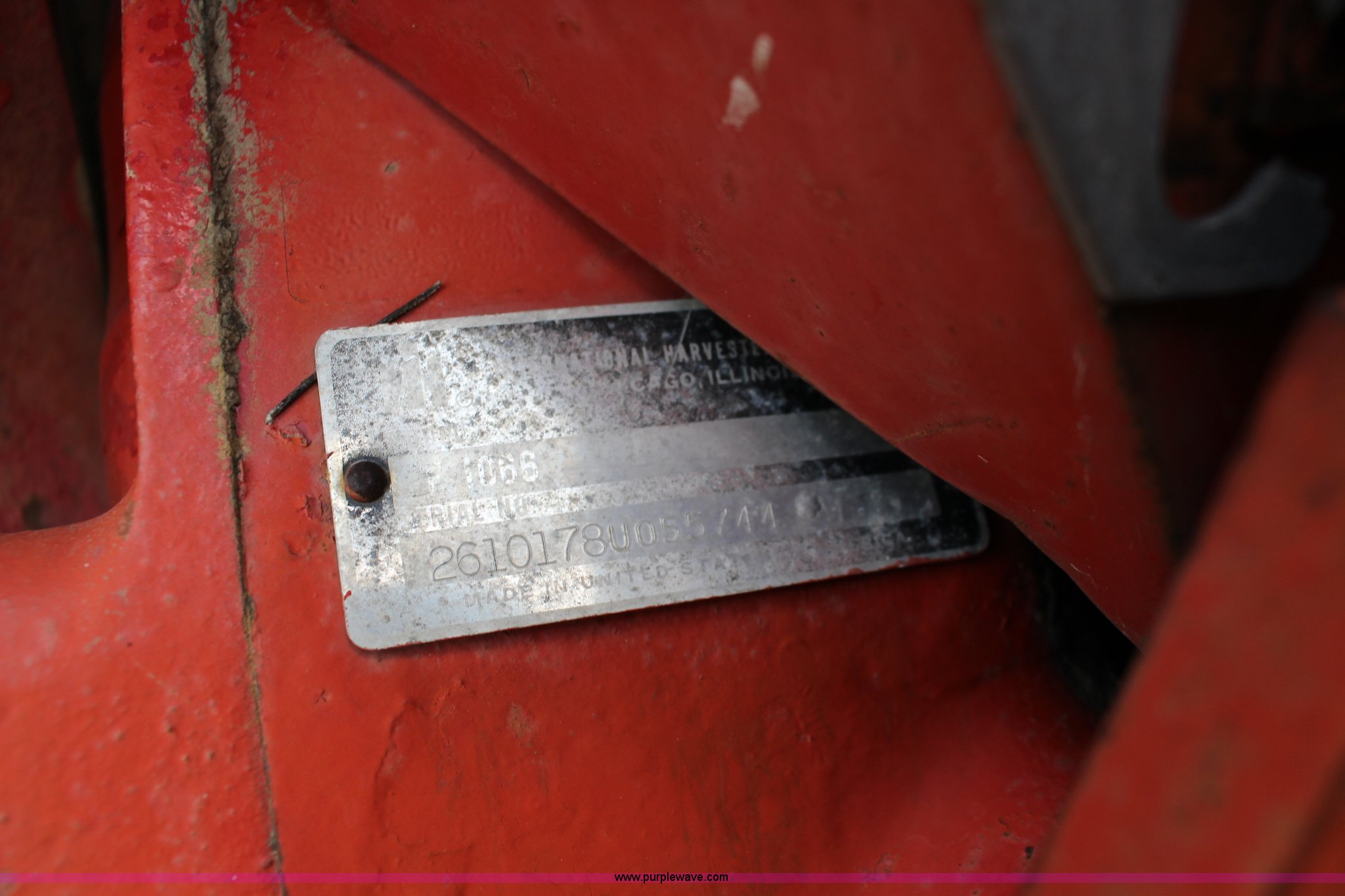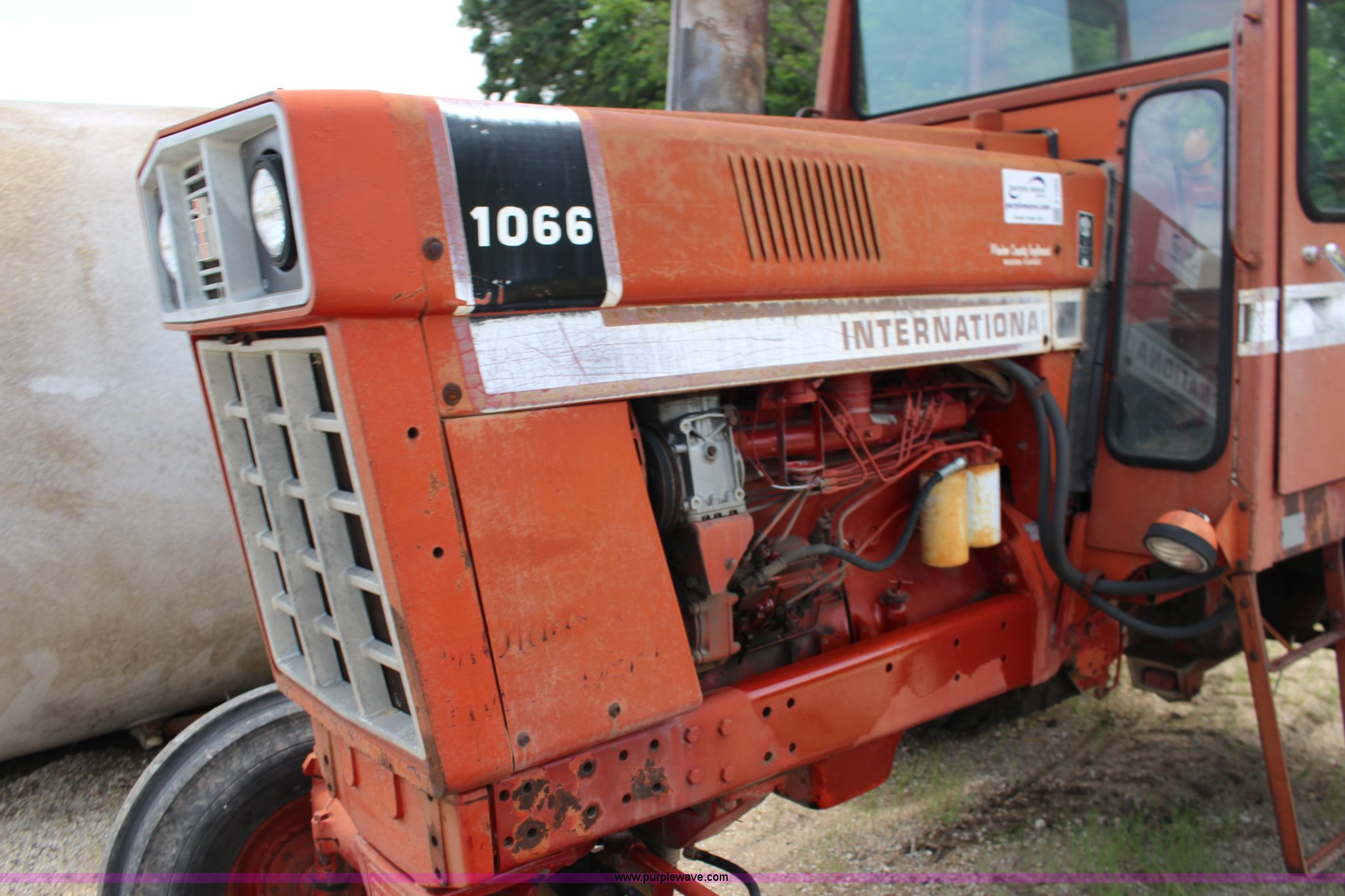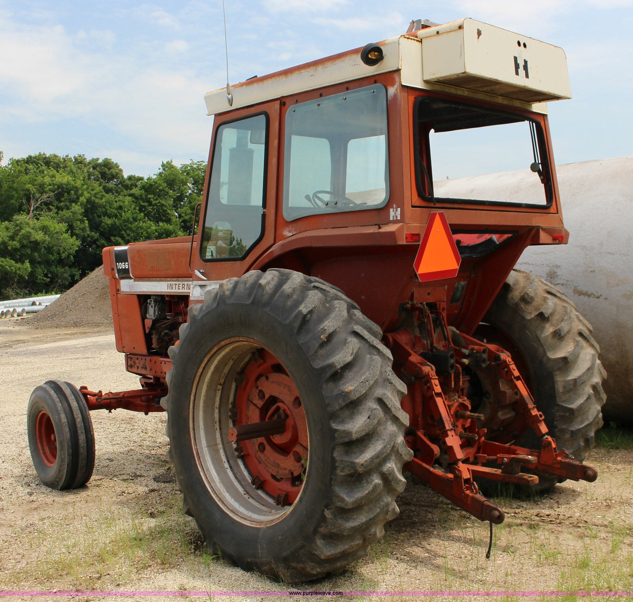 Purple Wave is selling a used Tractor in Kansas. This item is a 1975 International 1066 tractor with the following: 6,378 hours on meter, International six cylinder diesel engine, Partial powershift transmission, 16F-8R gears, Torque amplifier, Unknown operating condition, Heat, Three point, 540/1000 PTO, Draw bar, (2) rear hydraulic remotes, Rear wheel weights, 10.00-16 front tires, 18.4-38 rear tires, Fuel leak, Serial 2610178U055744
