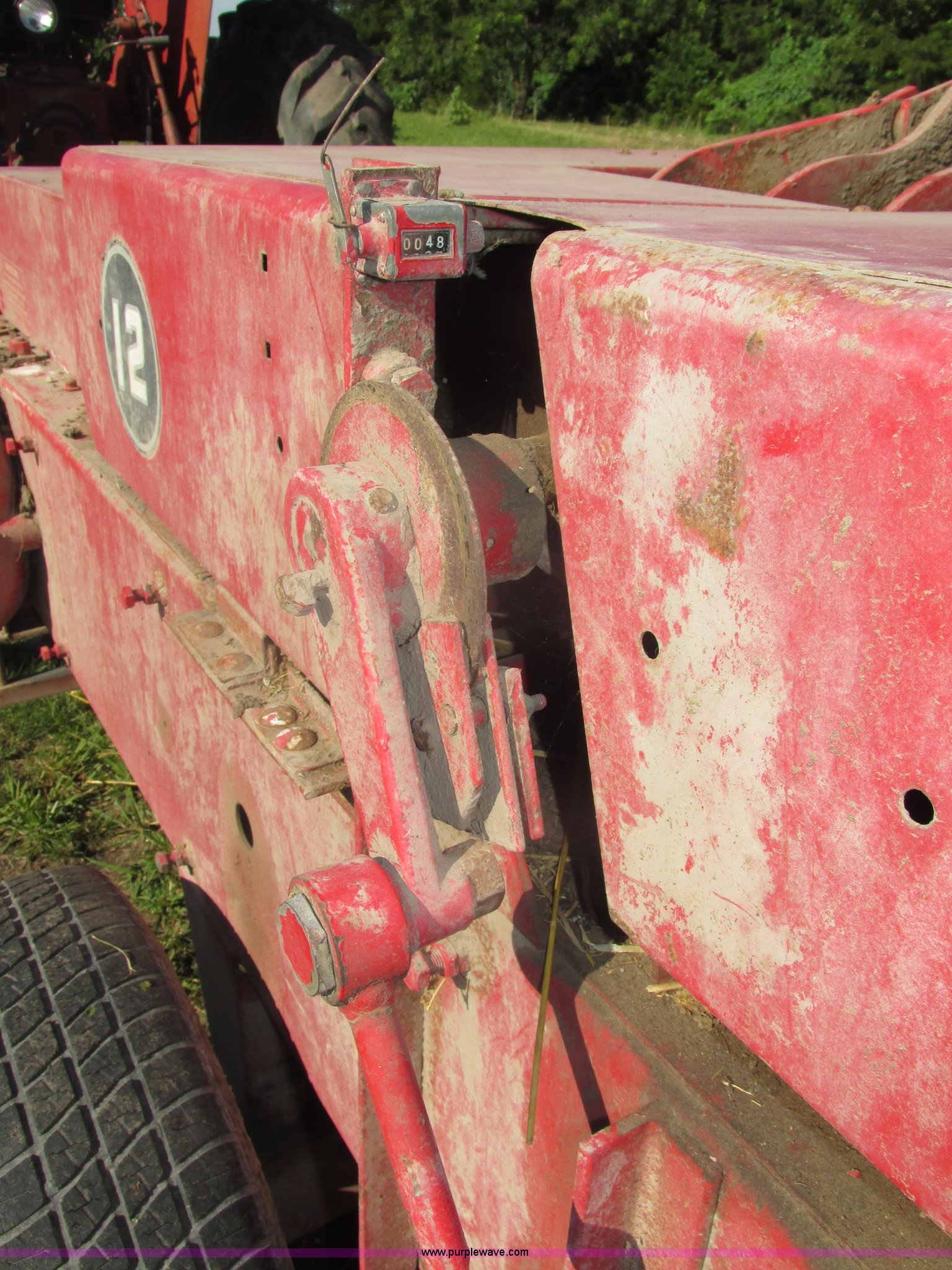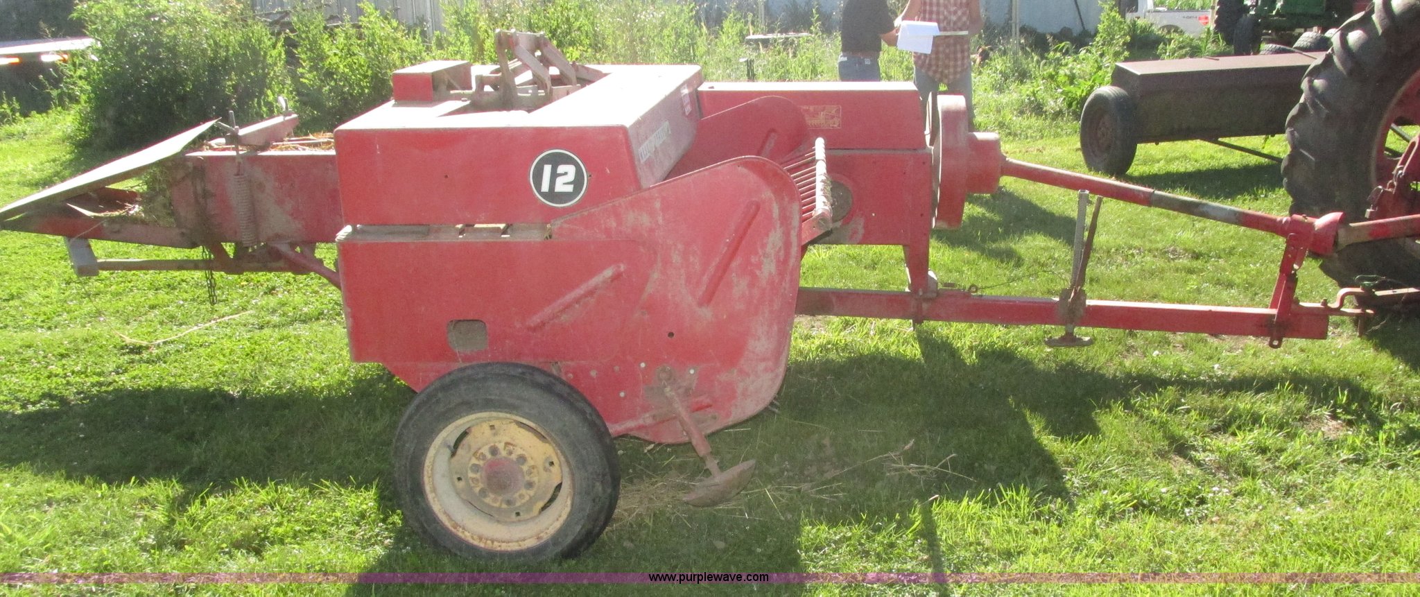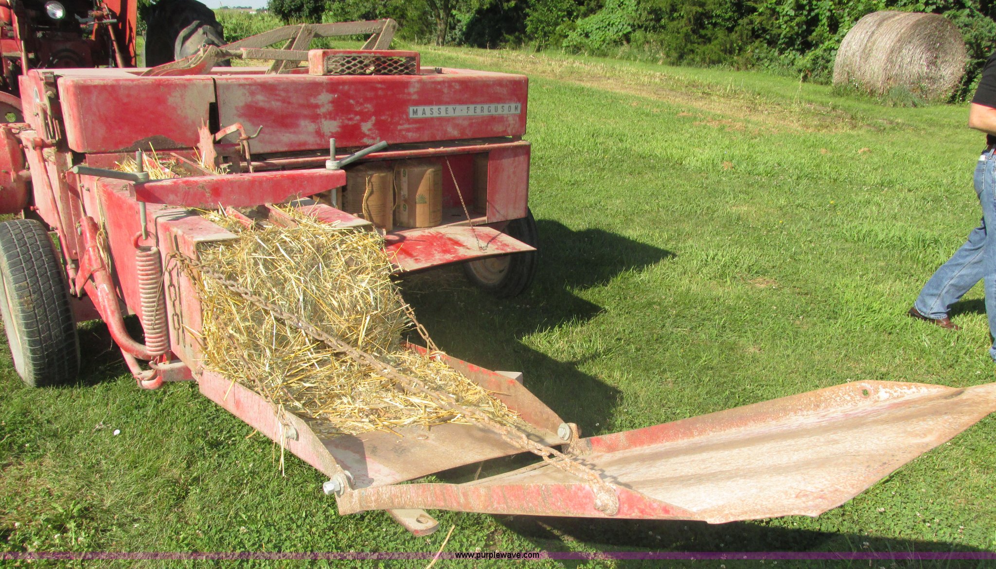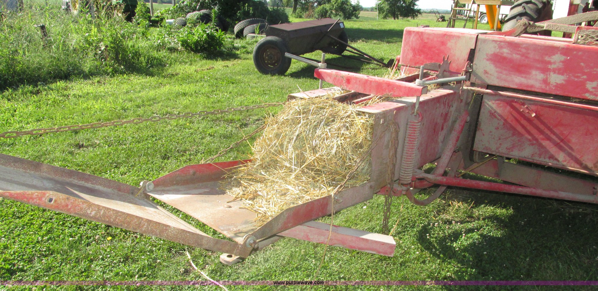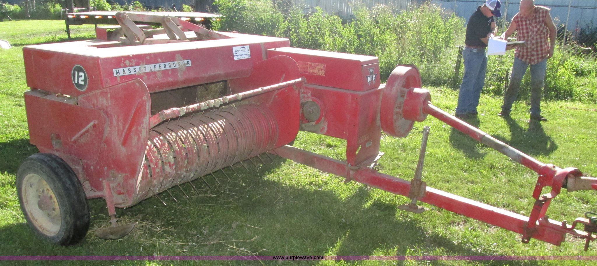 Purple Wave is selling a used Square Baler in Nebraska. This item is a 1965 Massey-Ferguson 12 small square baler with the following: 13" x 16" x 36" bale capacity, 57"W pickup, Manual pickup, (2) double knot knotters, Twine tie, Bale chute, 540 PTO, Pin hitch, P205/75R15 left tire, 5.00-15 right tire, Serial 996-504640