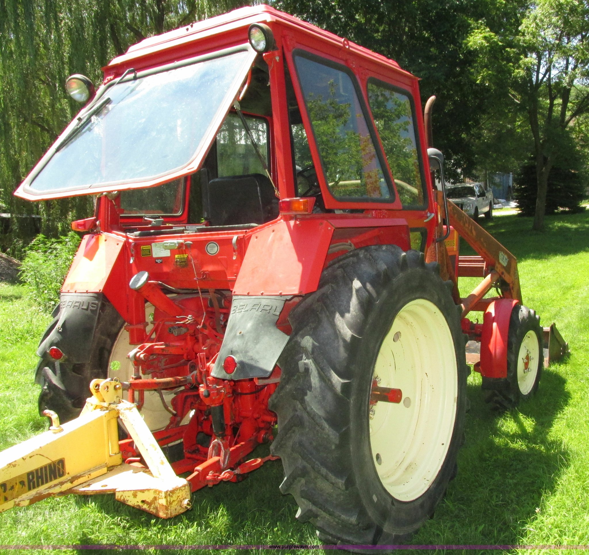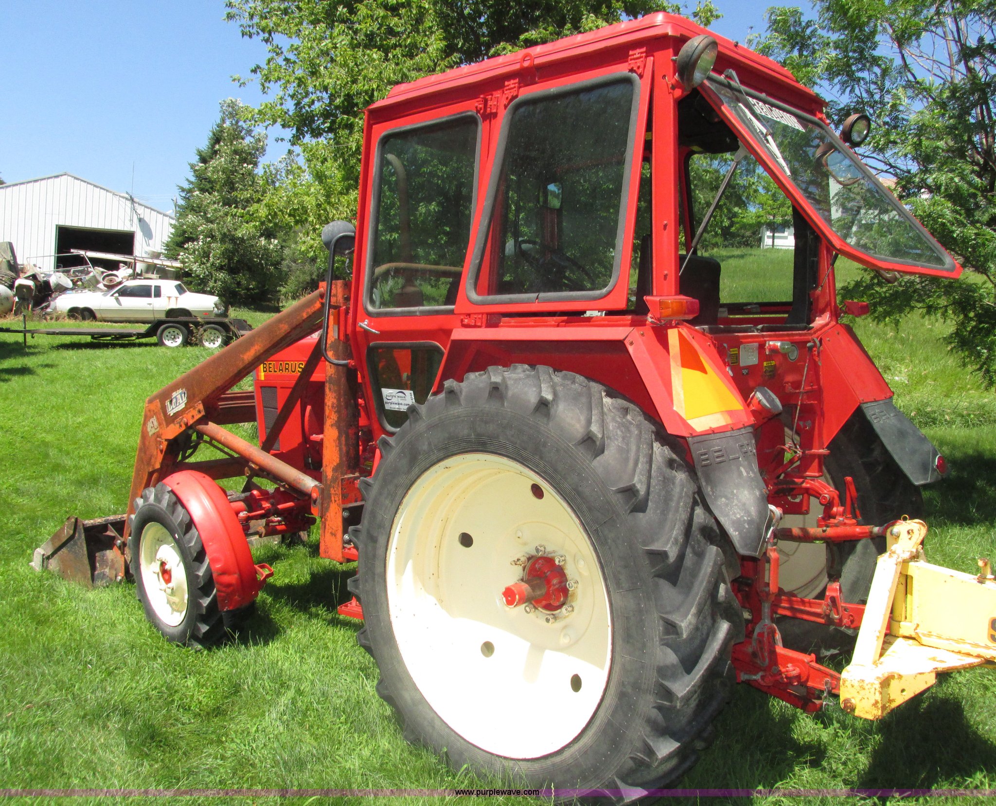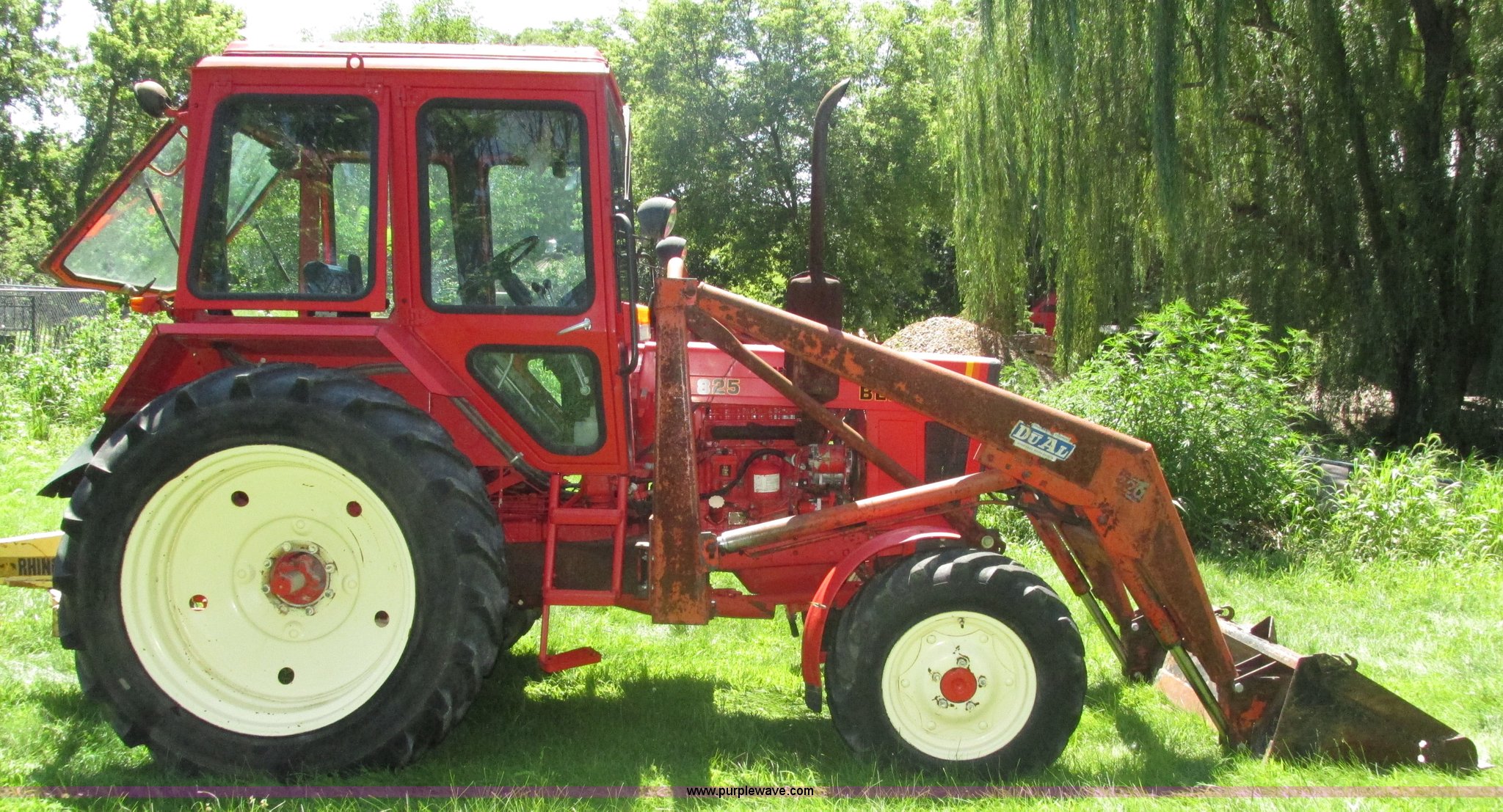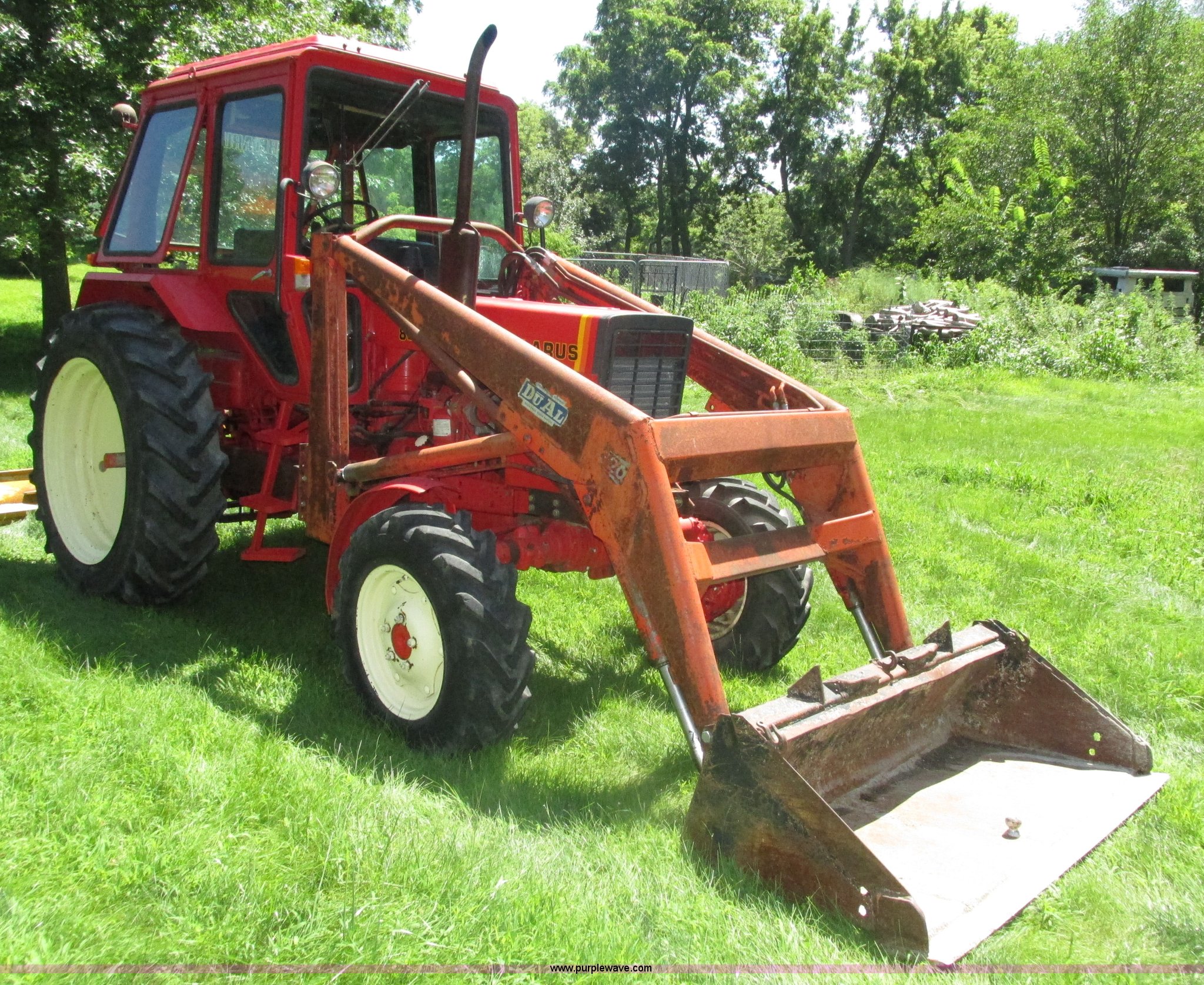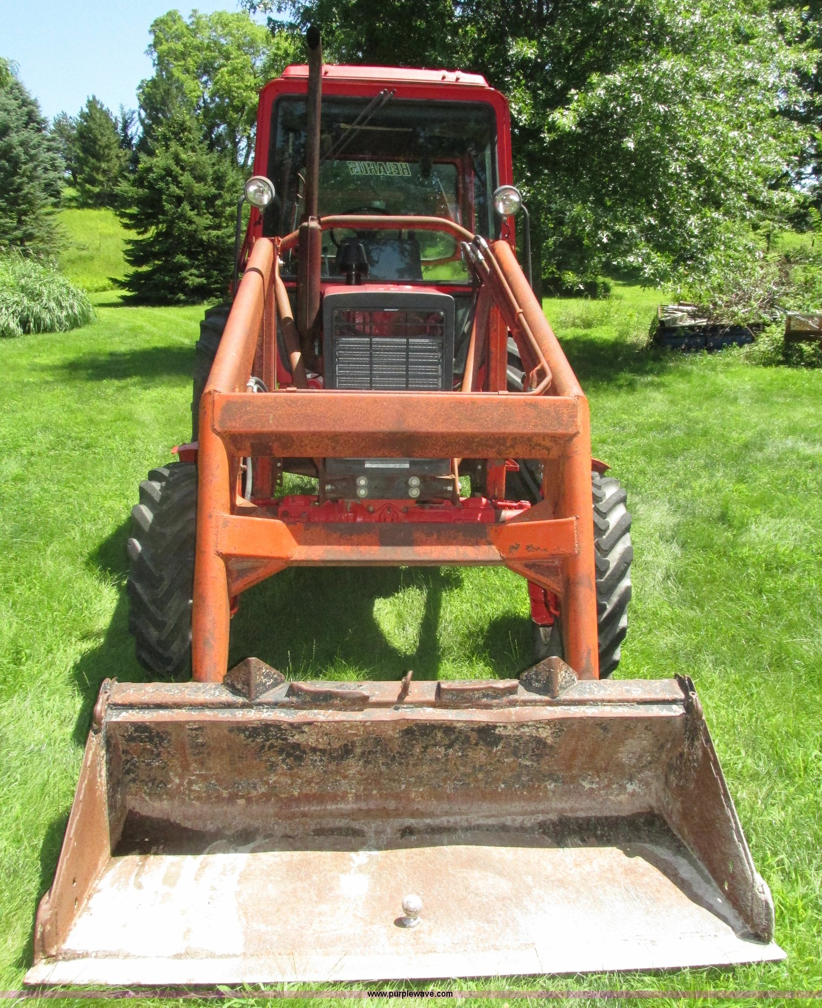 Purple Wave is selling a used Tractor in Iowa. This item is a Belarus 825 MFWD tractor with the following: 511 hours on meter, Four cylinder diesel engine, Serial 893692, Manual transmission, 9F-2R gears, Differential lock, AC and heat, Unknown operating condition of AC, Suspension seat, Hand and foot throttle, Dual three point controls, Roof top emergency hatch, Block heater, Du-Al loader, 69"W bucket, 2" ball hitch on bucket, Two-lever controls, Three point, Top link, 540/1000 PTO, Rear hydraulic remote set, Master battery disconnect, 11.2-20 front tires, 15.5-38 rear tires, Tires are cracking, Rear scraper not included, Serial 340345