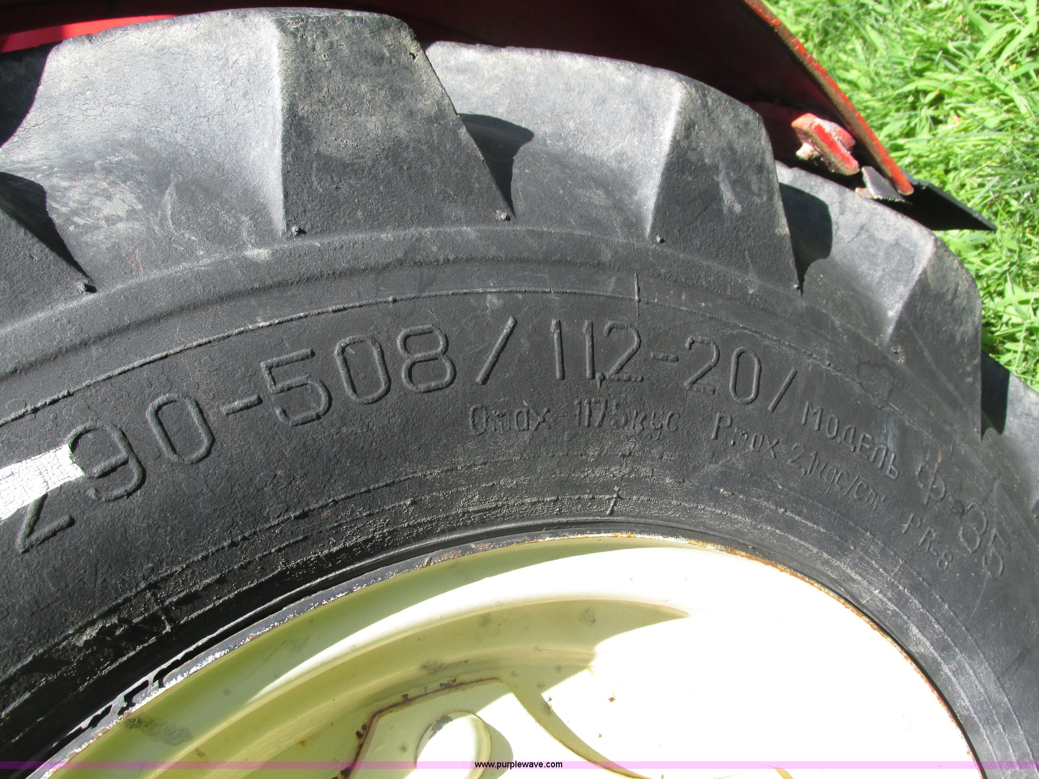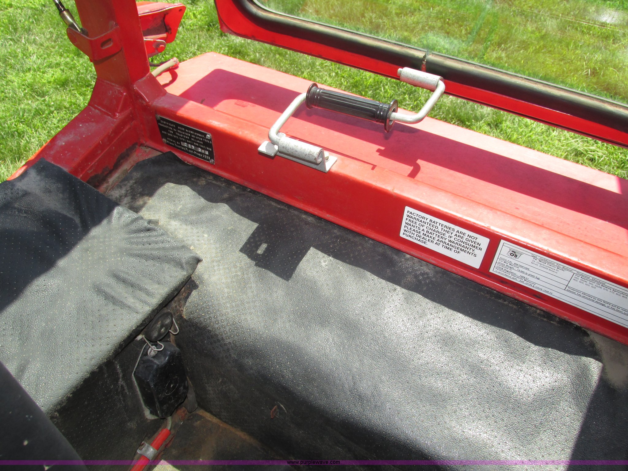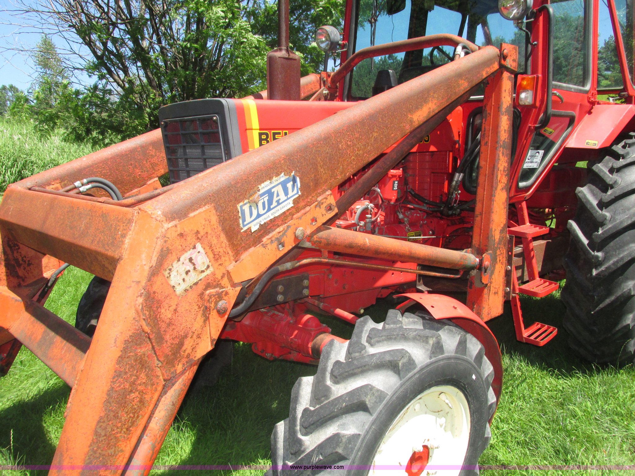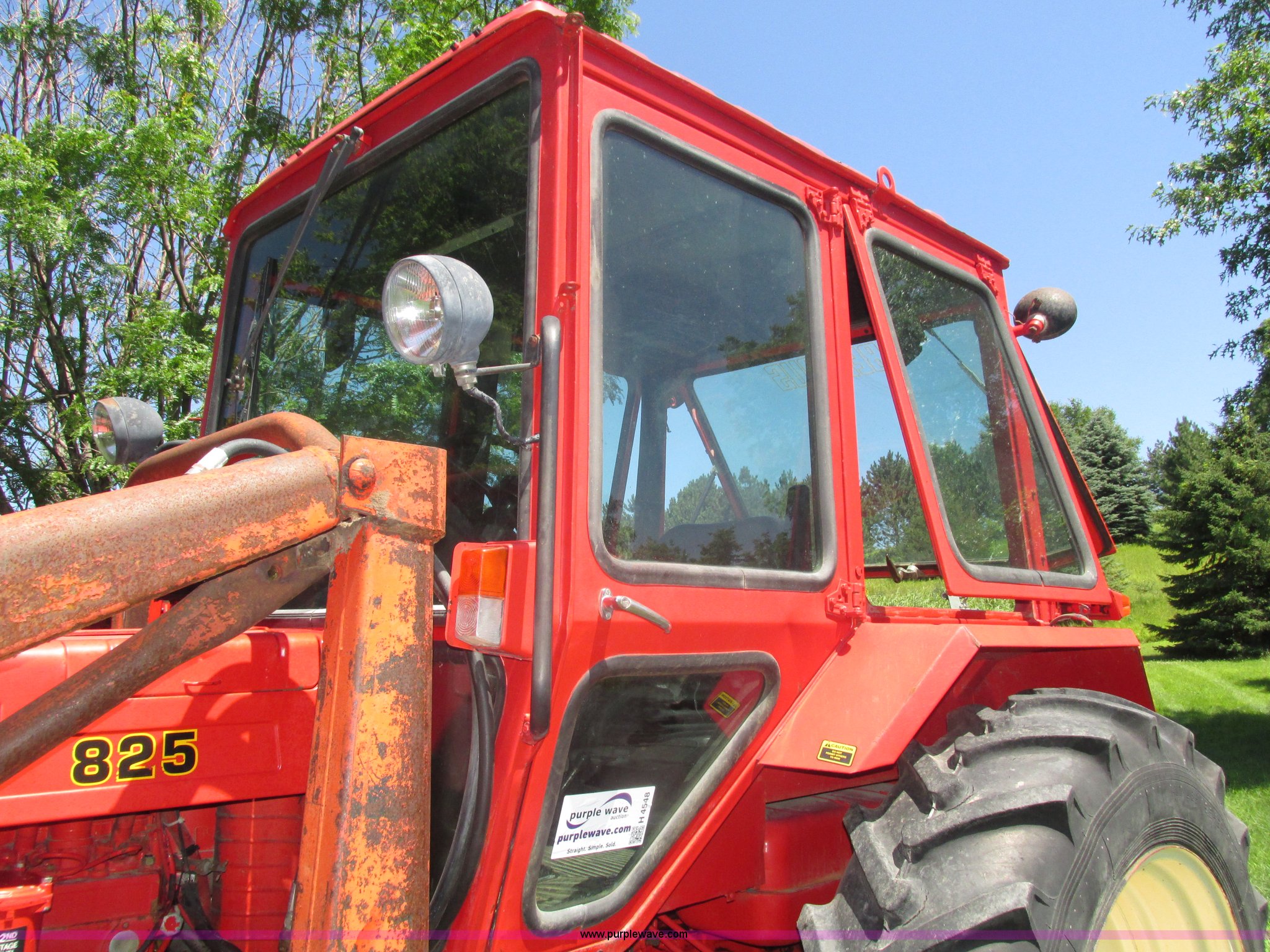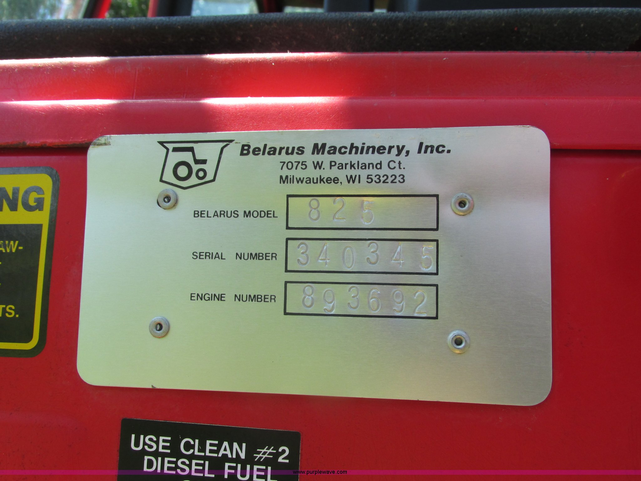 Purple Wave is selling a used Tractor in Iowa. This item is a Belarus 825 MFWD tractor with the following: 511 hours on meter, Four cylinder diesel engine, Serial 893692, Manual transmission, 9F-2R gears, Differential lock, AC and heat, Unknown operating condition of AC, Suspension seat, Hand and foot throttle, Dual three point controls, Roof top emergency hatch, Block heater, Du-Al loader, 69"W bucket, 2" ball hitch on bucket, Two-lever controls, Three point, Top link, 540/1000 PTO, Rear hydraulic remote set, Master battery disconnect, 11.2-20 front tires, 15.5-38 rear tires, Tires are cracking, Rear scraper not included, Serial 340345