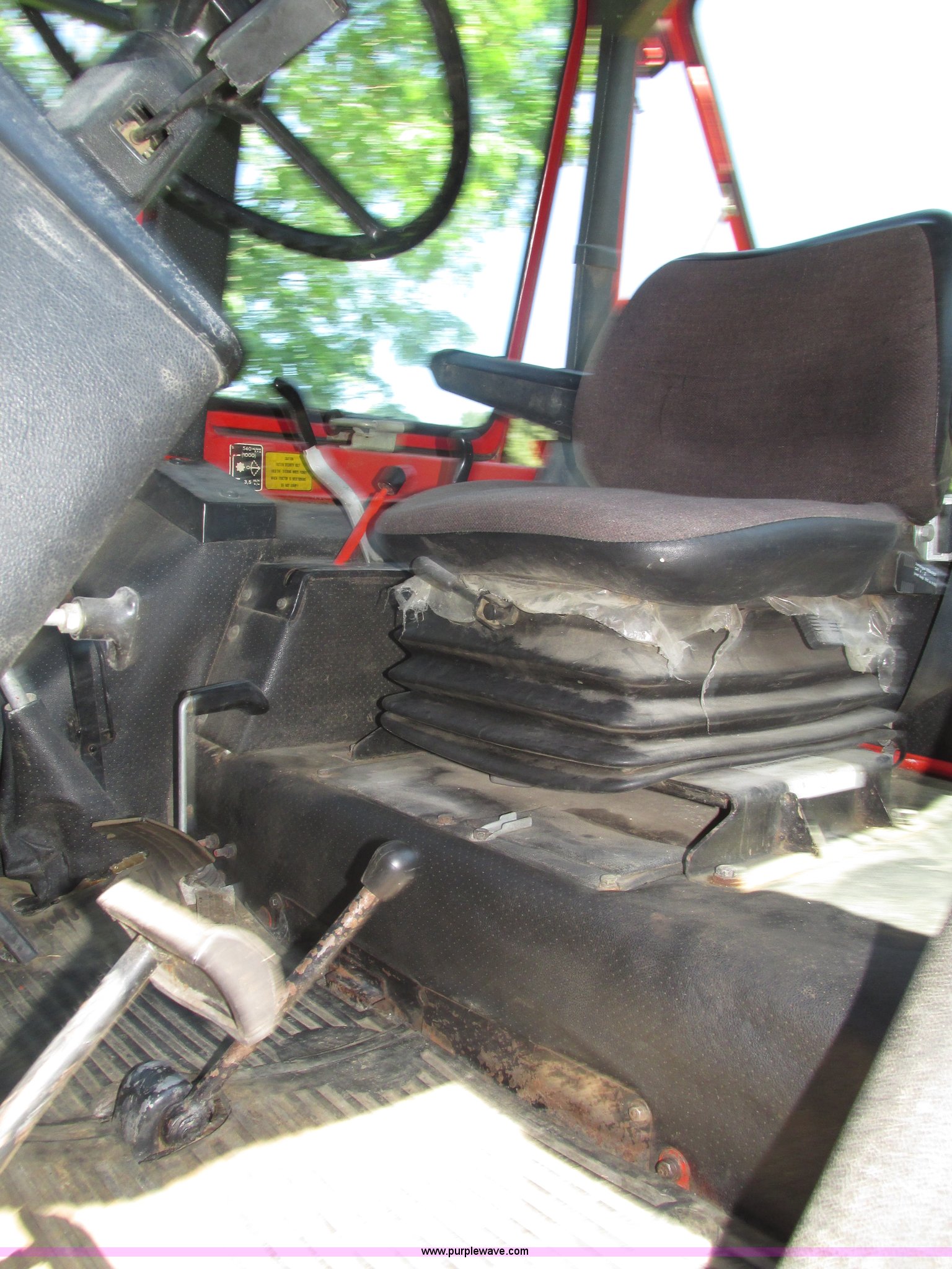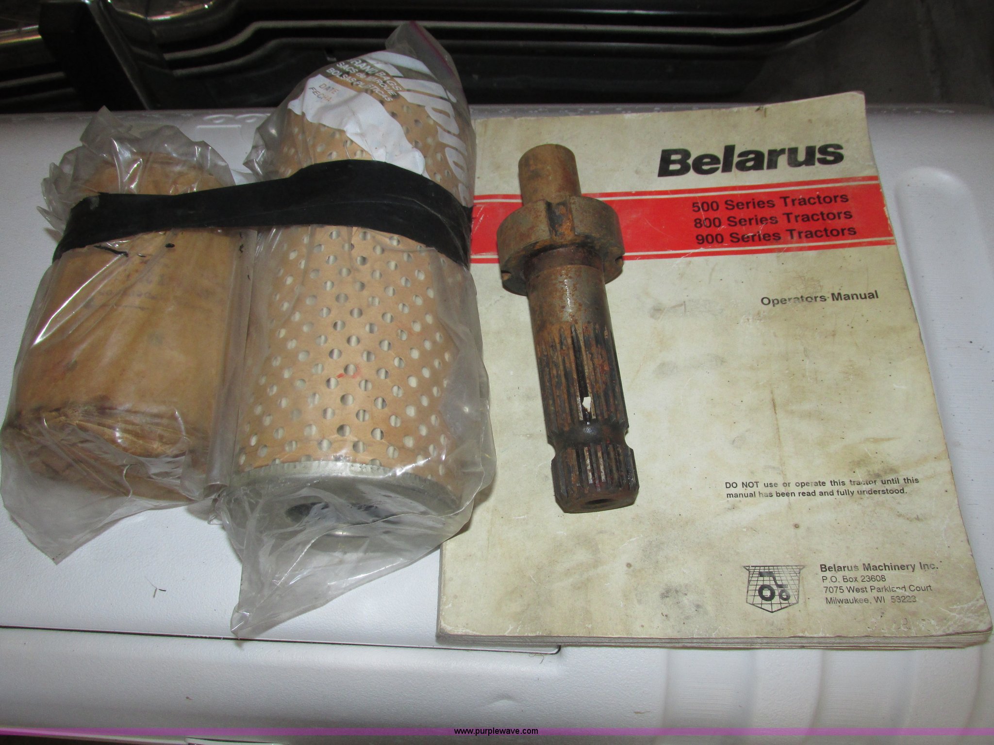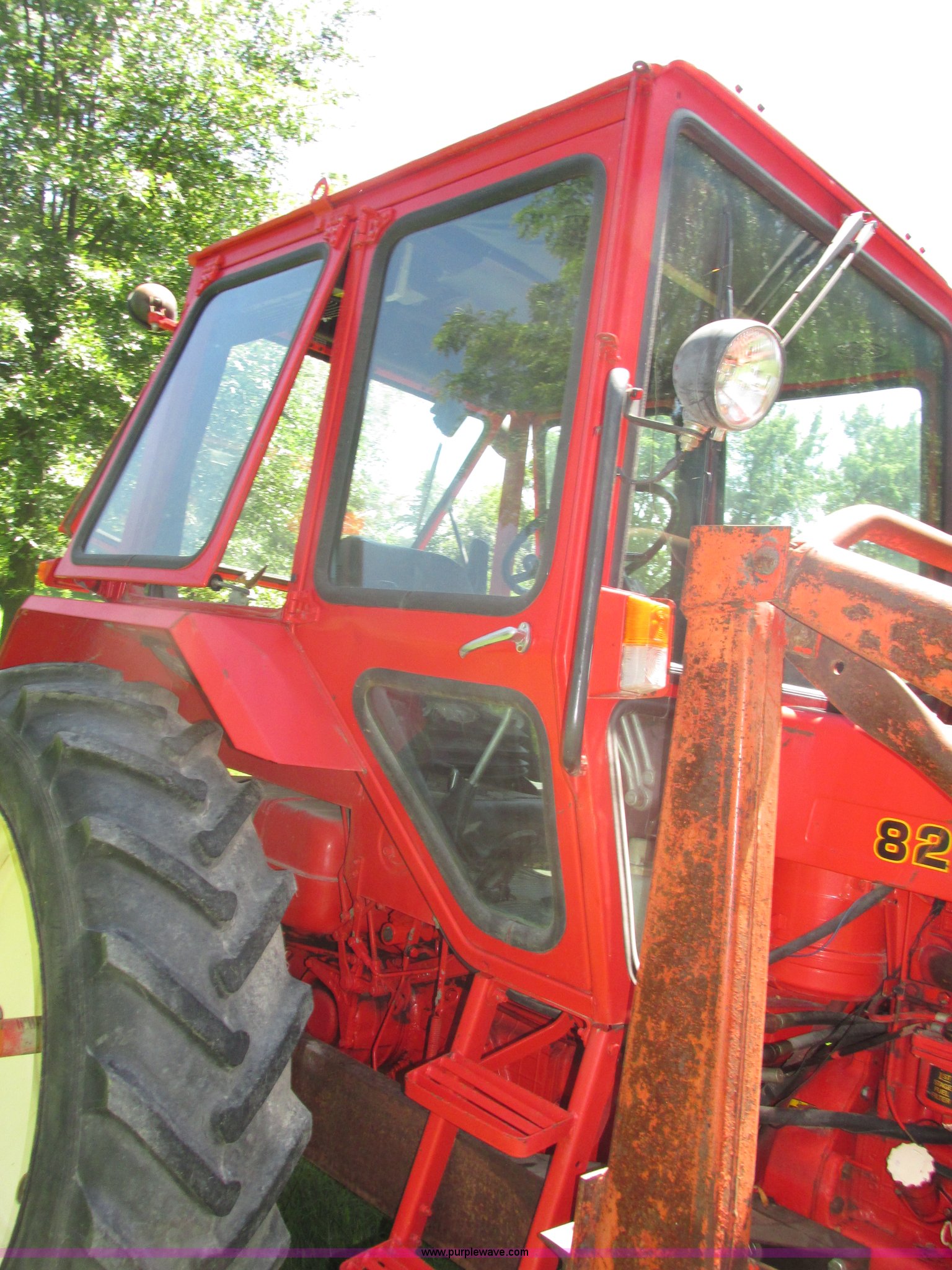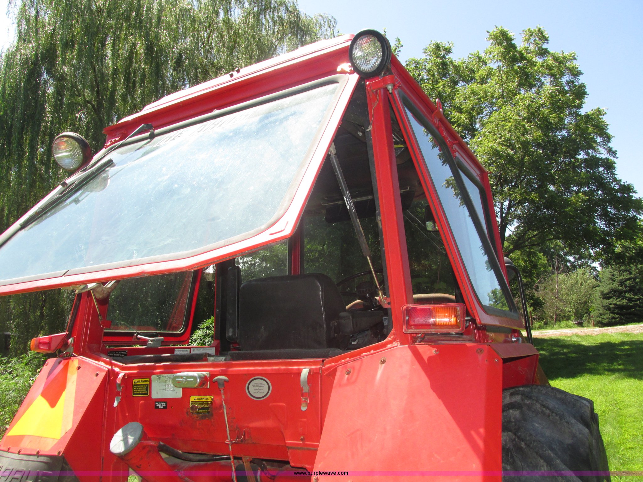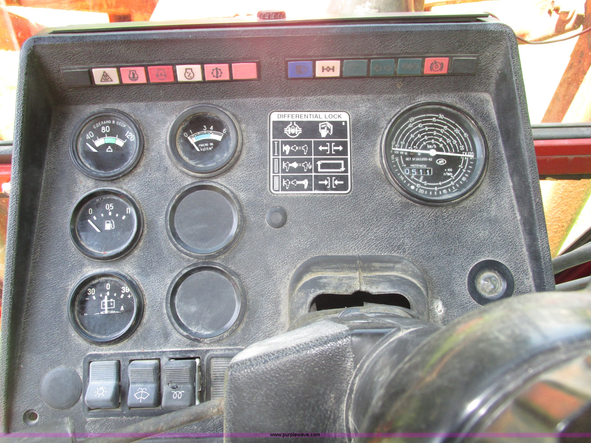 Purple Wave is selling a used Tractor in Iowa. This item is a Belarus 825 MFWD tractor with the following: 511 hours on meter, Four cylinder diesel engine, Serial 893692, Manual transmission, 9F-2R gears, Differential lock, AC and heat, Unknown operating condition of AC, Suspension seat, Hand and foot throttle, Dual three point controls, Roof top emergency hatch, Block heater, Du-Al loader, 69"W bucket, 2" ball hitch on bucket, Two-lever controls, Three point, Top link, 540/1000 PTO, Rear hydraulic remote set, Master battery disconnect, 11.2-20 front tires, 15.5-38 rear tires, Tires are cracking, Rear scraper not included, Serial 340345