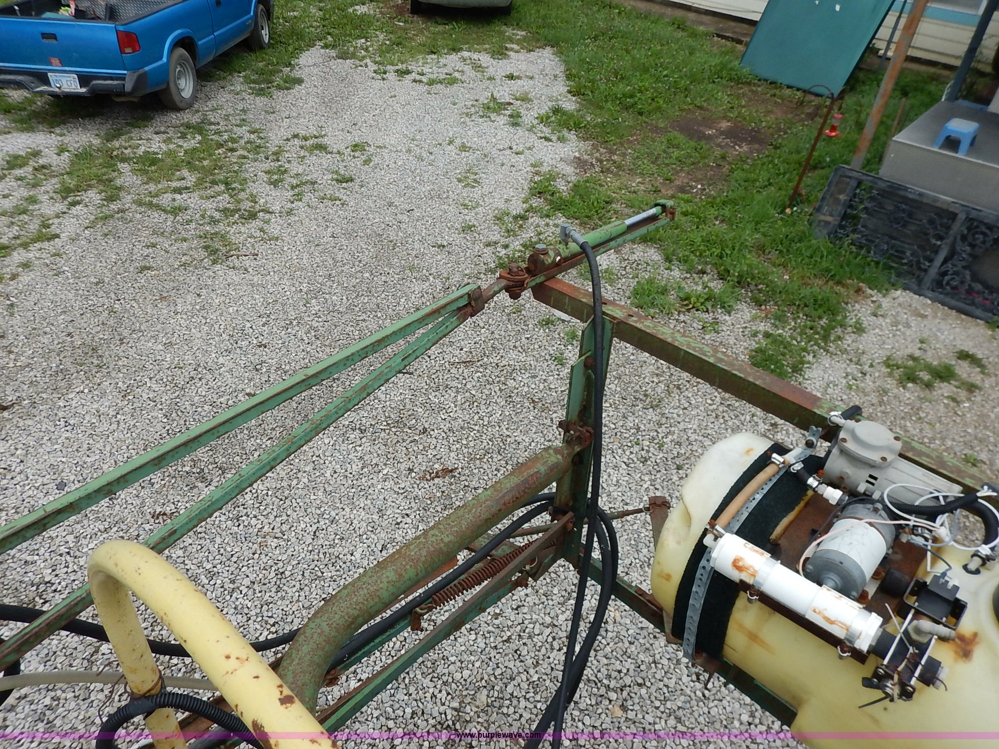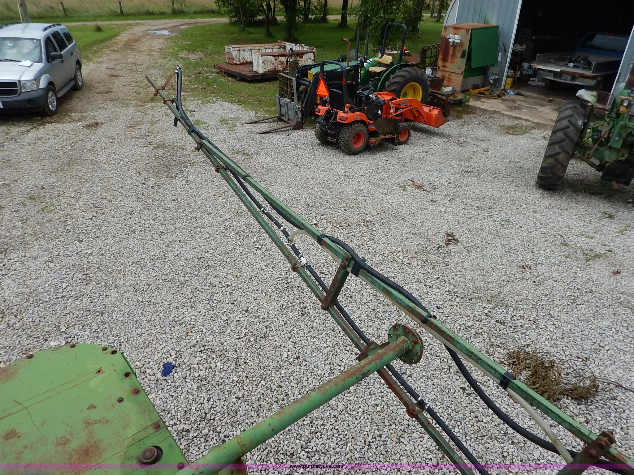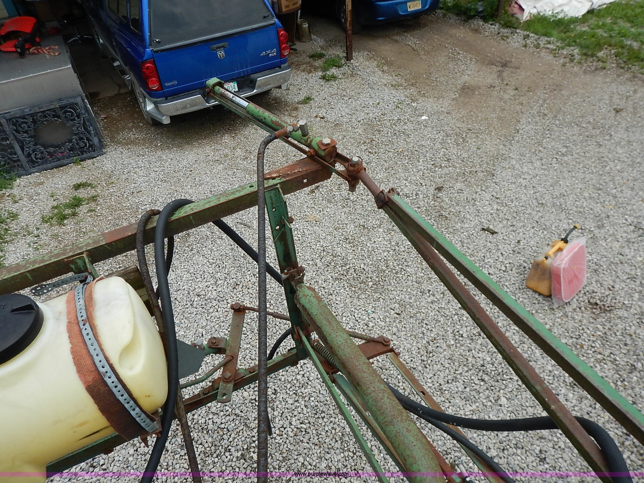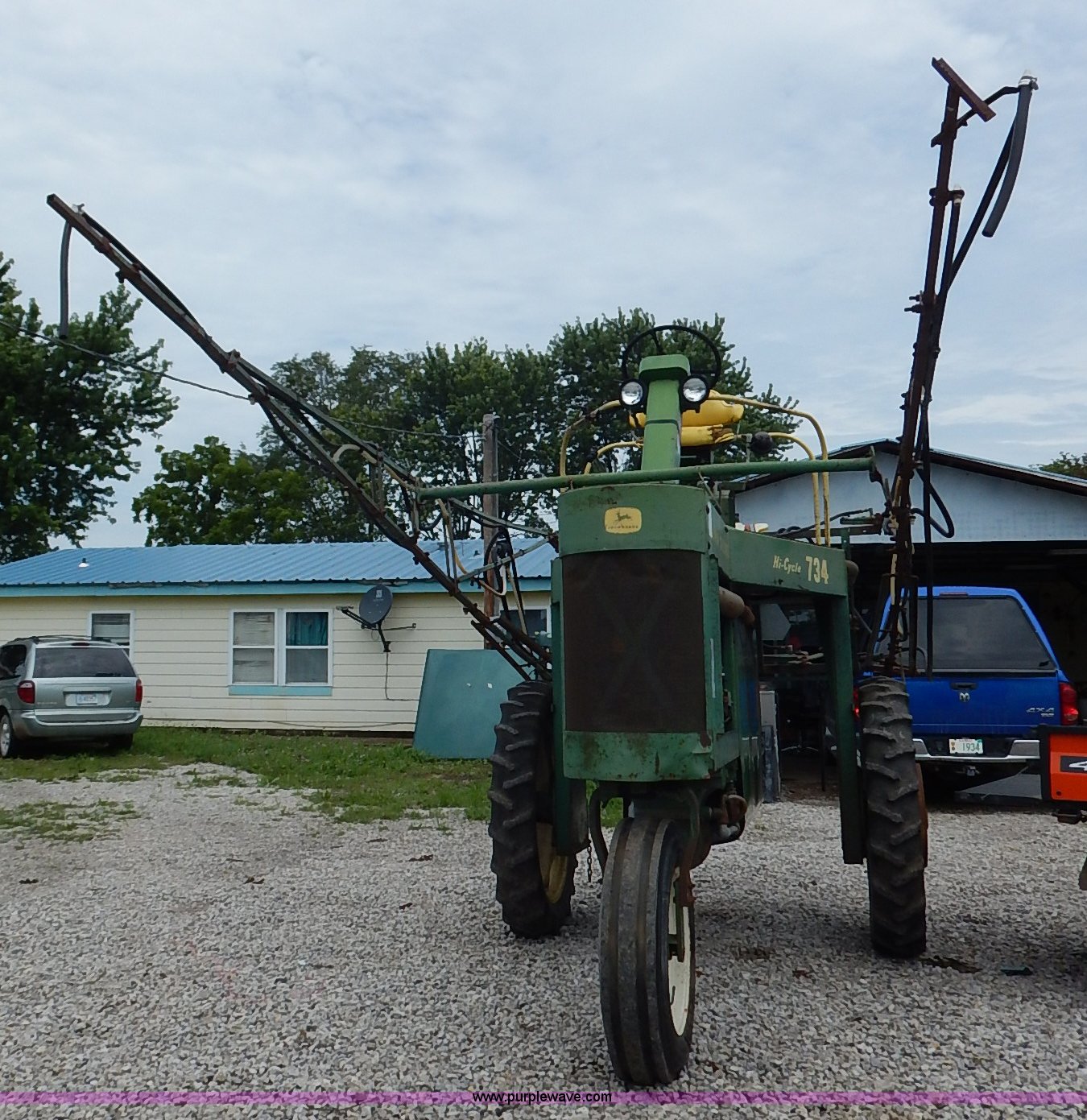 John Deere 734 Hi-Cycle self-propelled applicator. Type E0734, John Deere three cylinder gas engine, 4F-2R gears, 40'W boom, 30" nozzle spacing No nozzles included, 12 gallon hand sprayer tank, 300 gallon belly tank, Work lights, Cambridge 7.50-20 front tires, Firestone 9.5-36 rear tires, Starter recently rebuilt, Trailer Ramps, Safety chains, 19.00-20 tires, 11.00-20 tires, Serial 000420. View equipment video. Paola, KS 66071