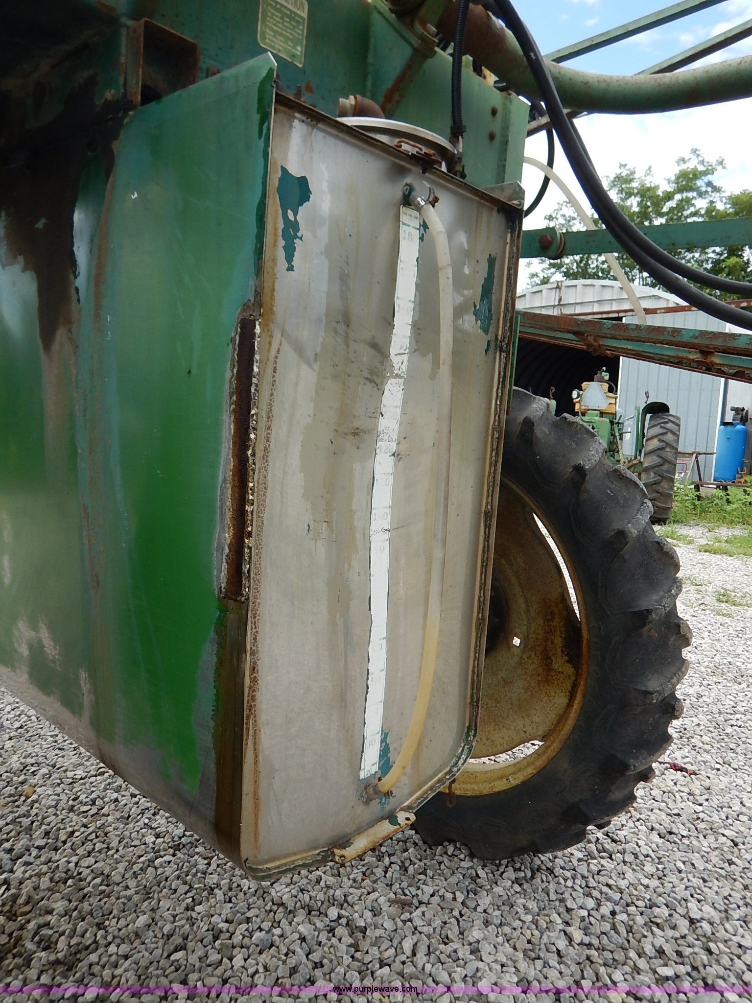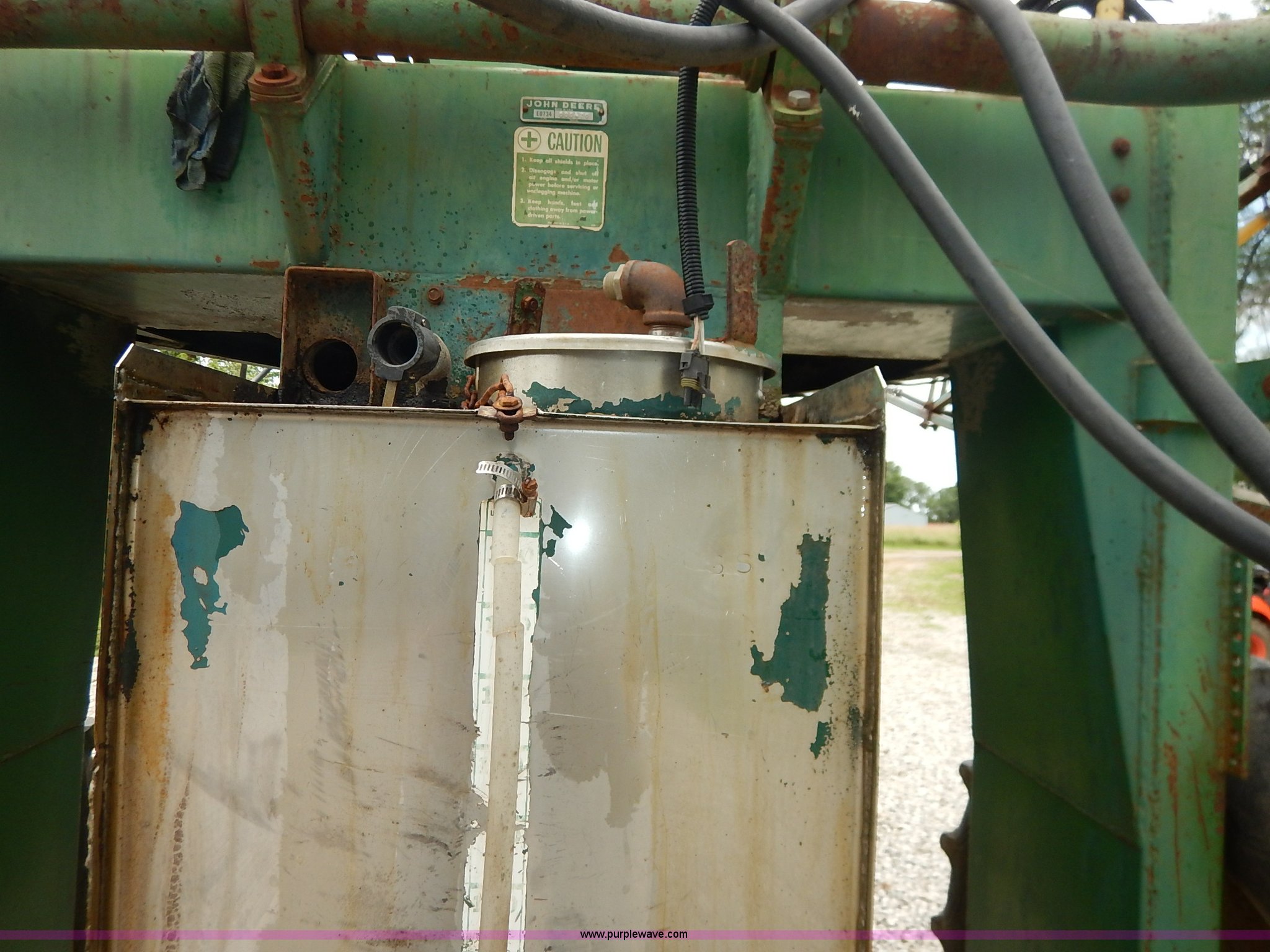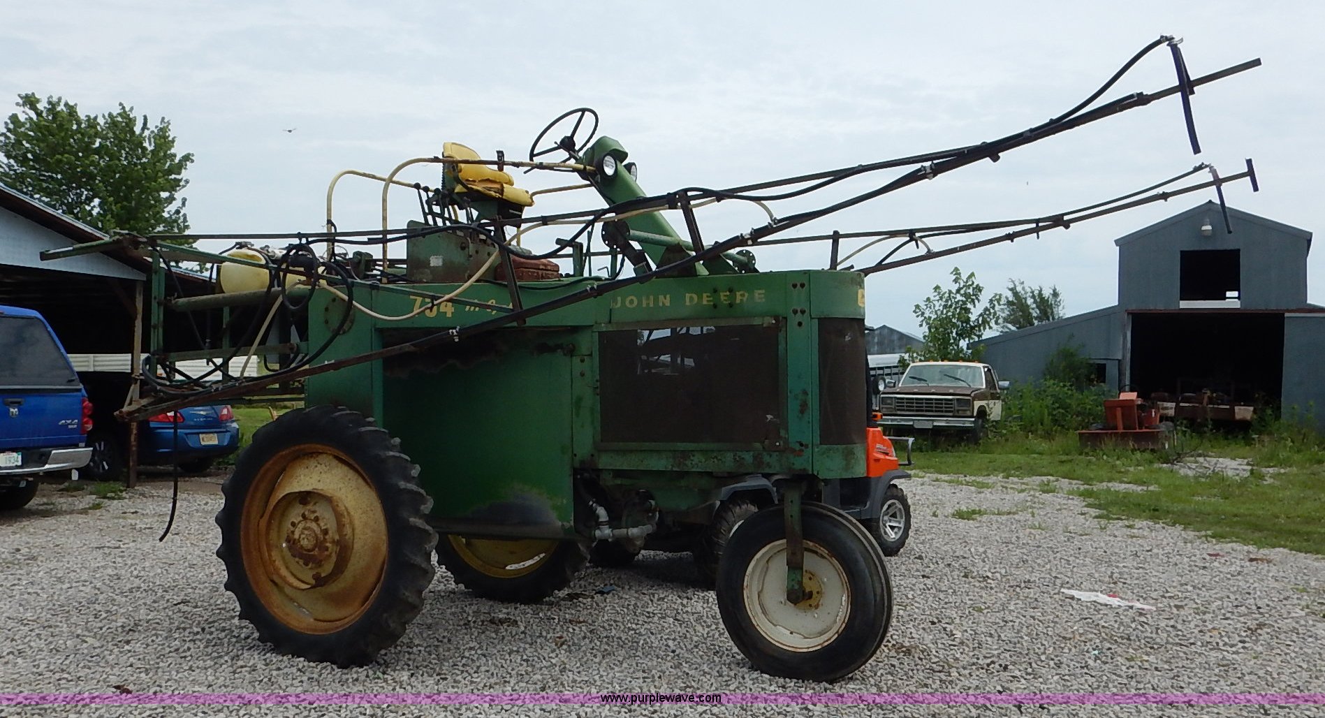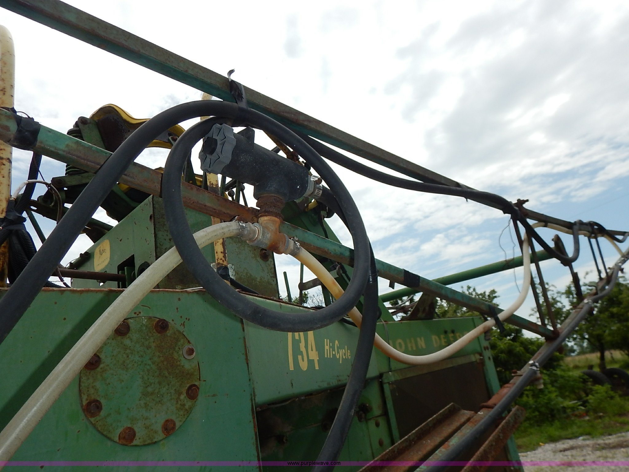 Purple Wave is selling a used Applicator Self Propelled in Kansas. This item is a John Deere 734 Hi-Cycle self-propelled applicator with the following: Type E0734, John Deere three cylinder gas engine, 4F-2R gears, 40'W boom, 30" nozzle spacing, No nozzles included, 12 gallon hand sprayer tank, 300 gallon belly tank, Work lights, Cambridge 7.50-20 front tires, Firestone 9.5-36 rear tires, Starter recently rebuilt, Trailer, Ramps, Safety chains, 19.00-20 tires, 11.00-20 tires, Serial 000420