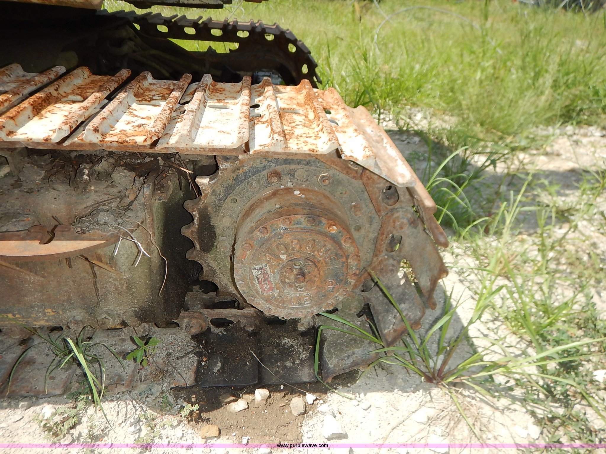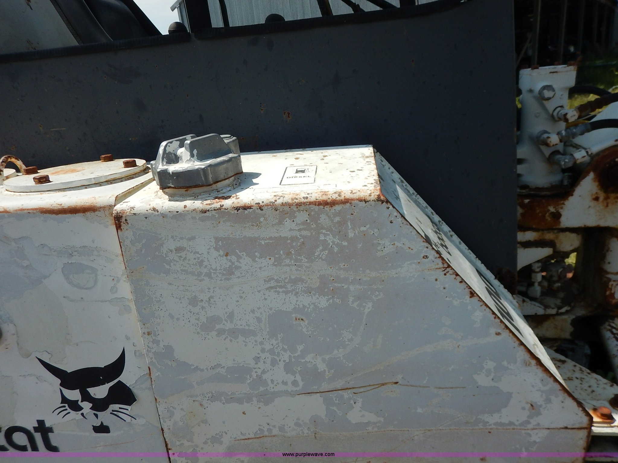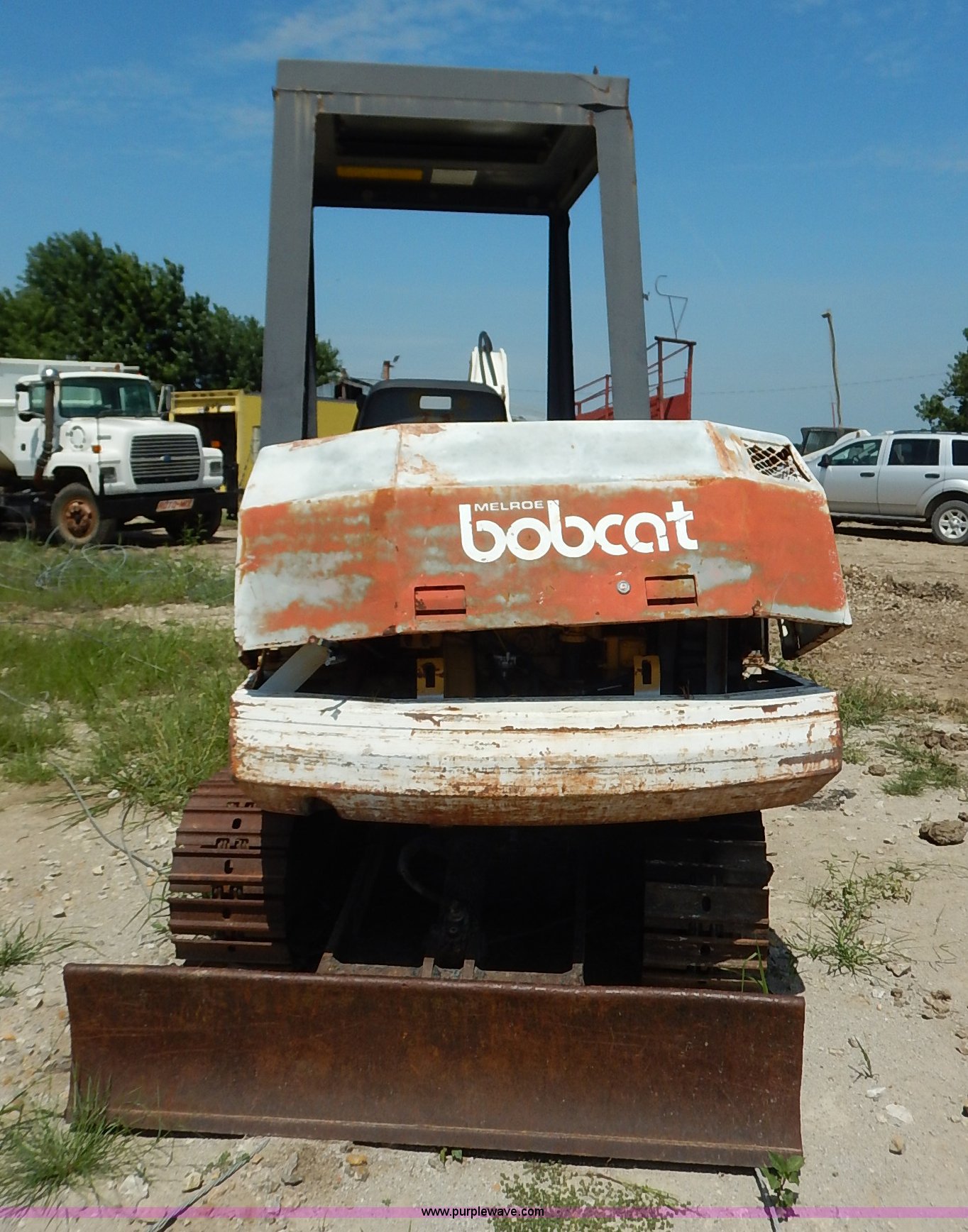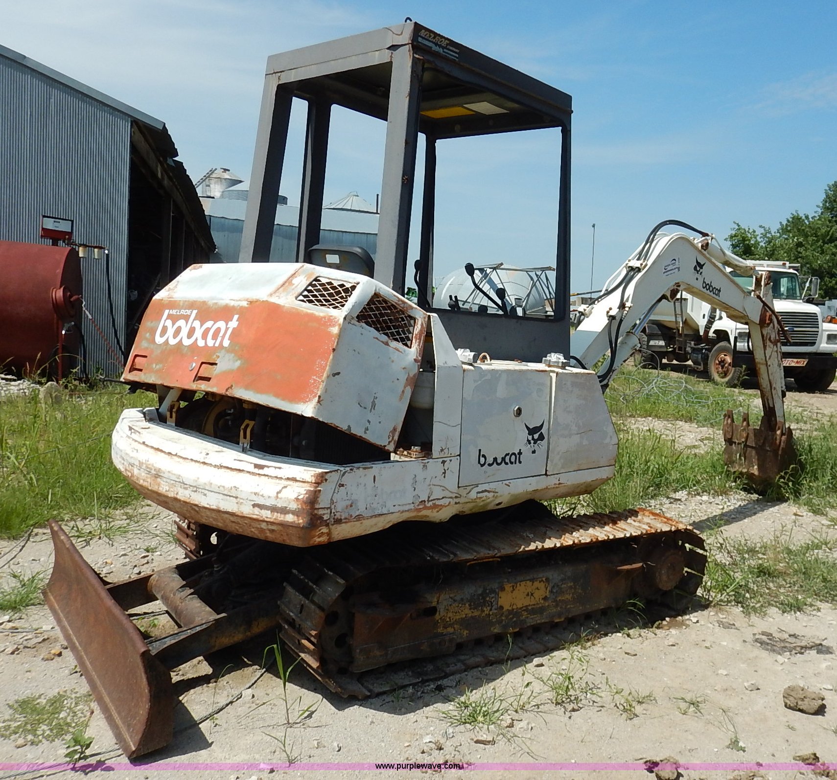 Purple Wave is selling a used Mini Excavator in Kansas. This item is a 1988 Bobcat 100 compact excavator with the following: Caterpillar three cylinder diesel engine, ROPS, Vinyl seat, Damaged, Joystick controls, Standard boom, 46" stick length, 19"W bucket, (4) bolt-on teeth, Hydraulic thumb, 5' rear blade, Three bottom rollers, 12"W steel single grouser track pads, 7,280 lbs. base operating weight, Operational when parked one year ago, Fuel issues, No battery, Serial 5049-MK-11068