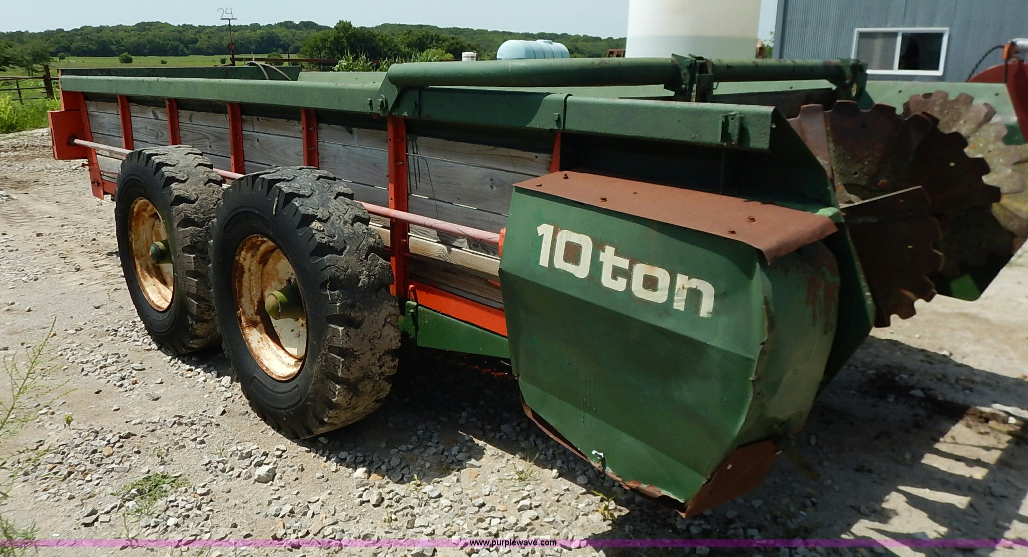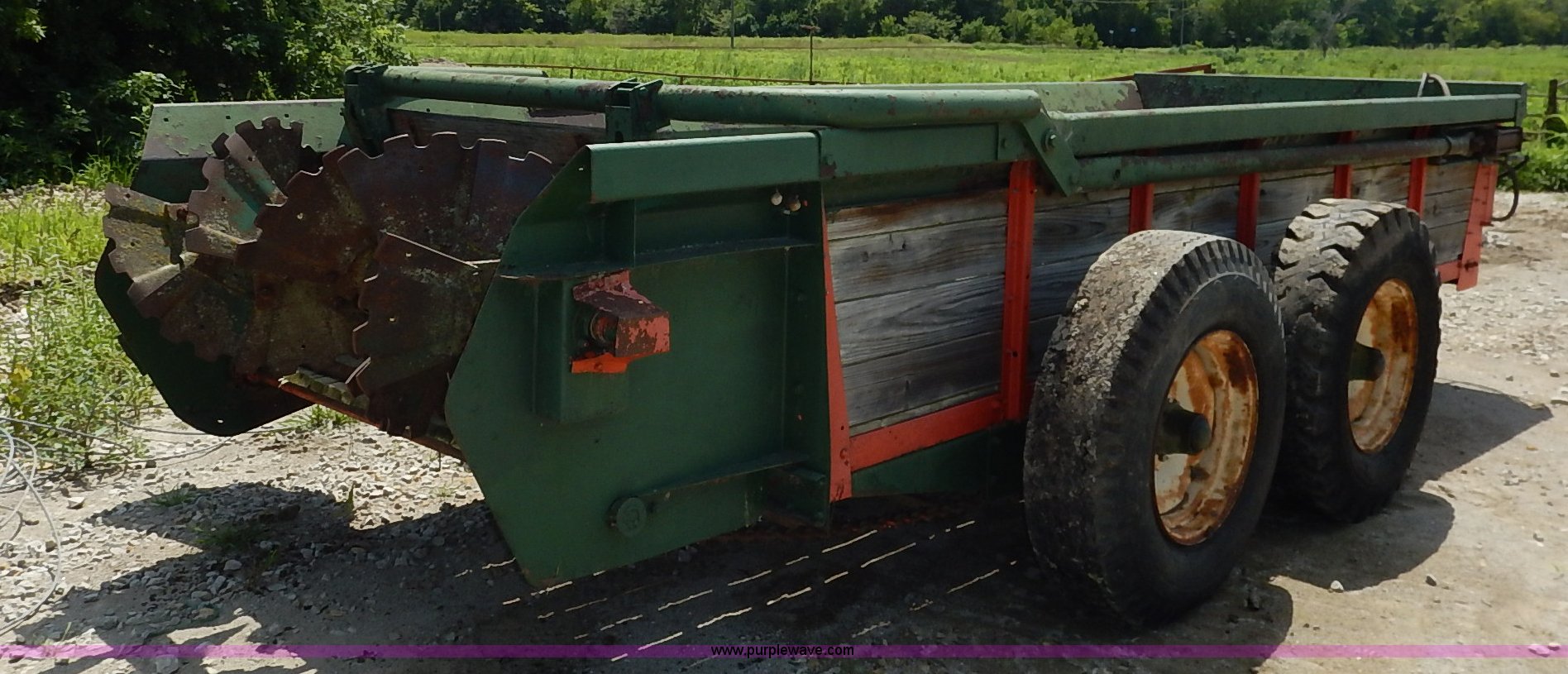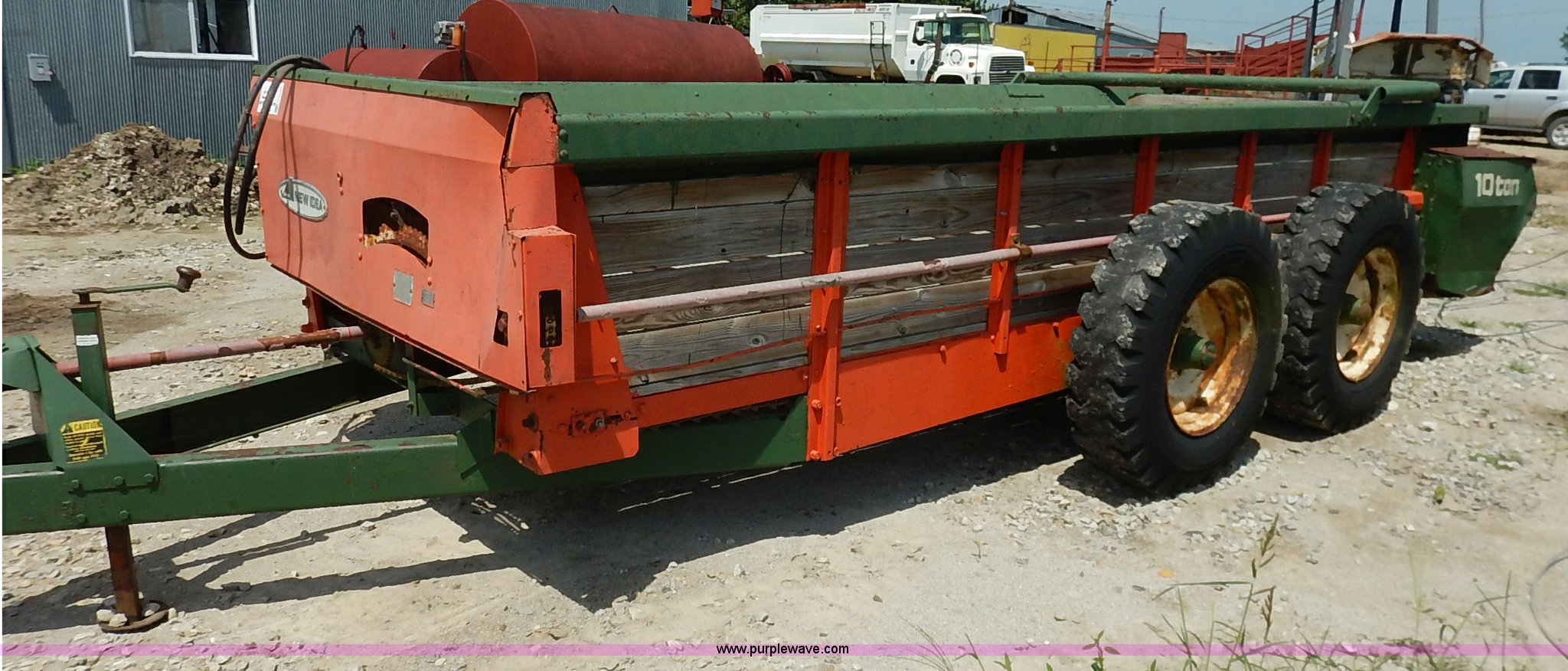 Purple Wave is selling a used Manure Spreader in Kansas. This item is a New Idea manure spreader with the following: 17' x 6', Wood floor, 10 ton capacity, Hydraulics, 540 PTO, Pin hitch, Goodyear 10.00-20 tires