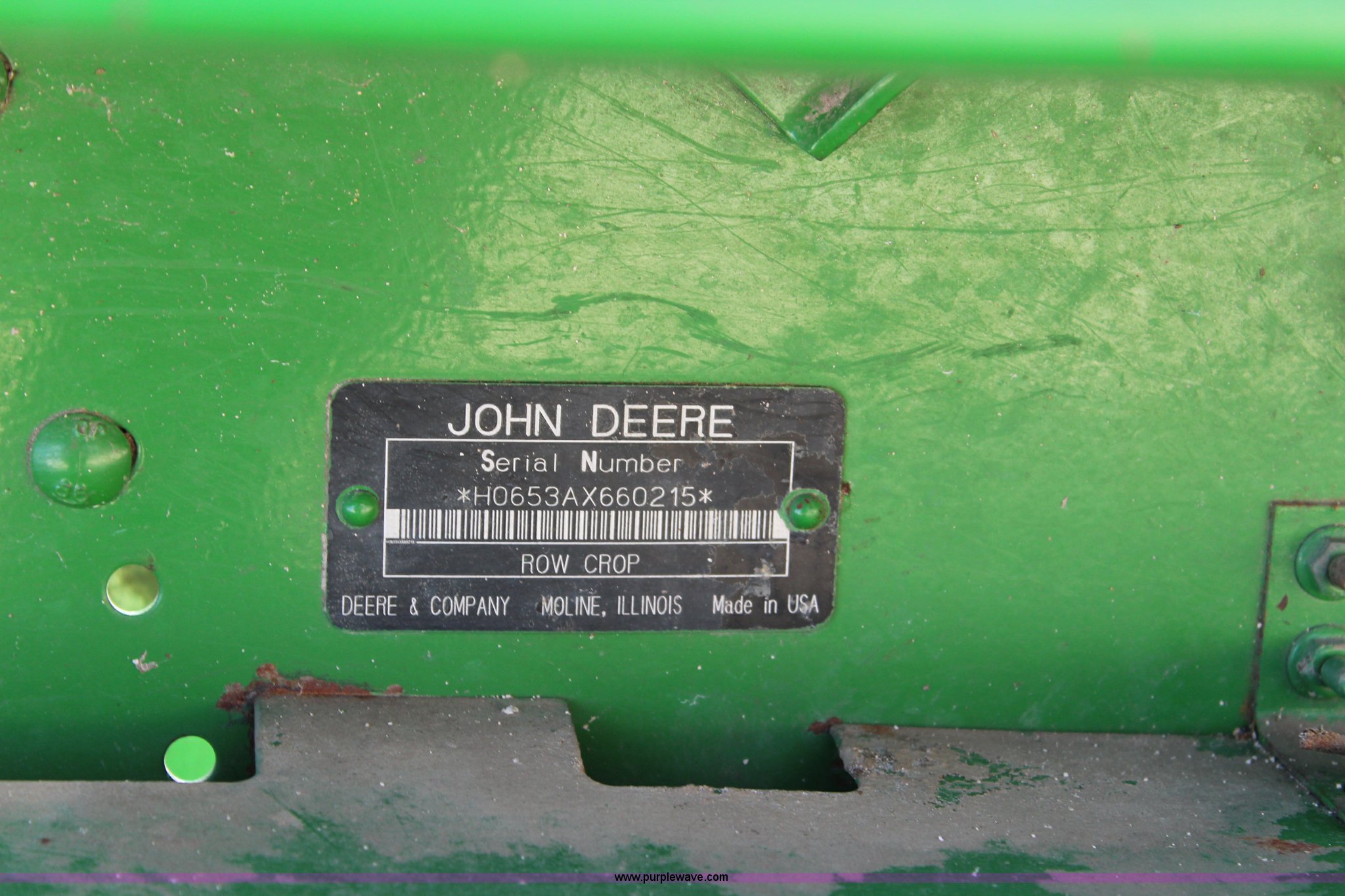 1995 John Deere 653A row crop head. Six row, 30" spacing, Dual drivelines, Stored inside, Serial H0653AX660215. 477 K 246. Morrill, KS 66515