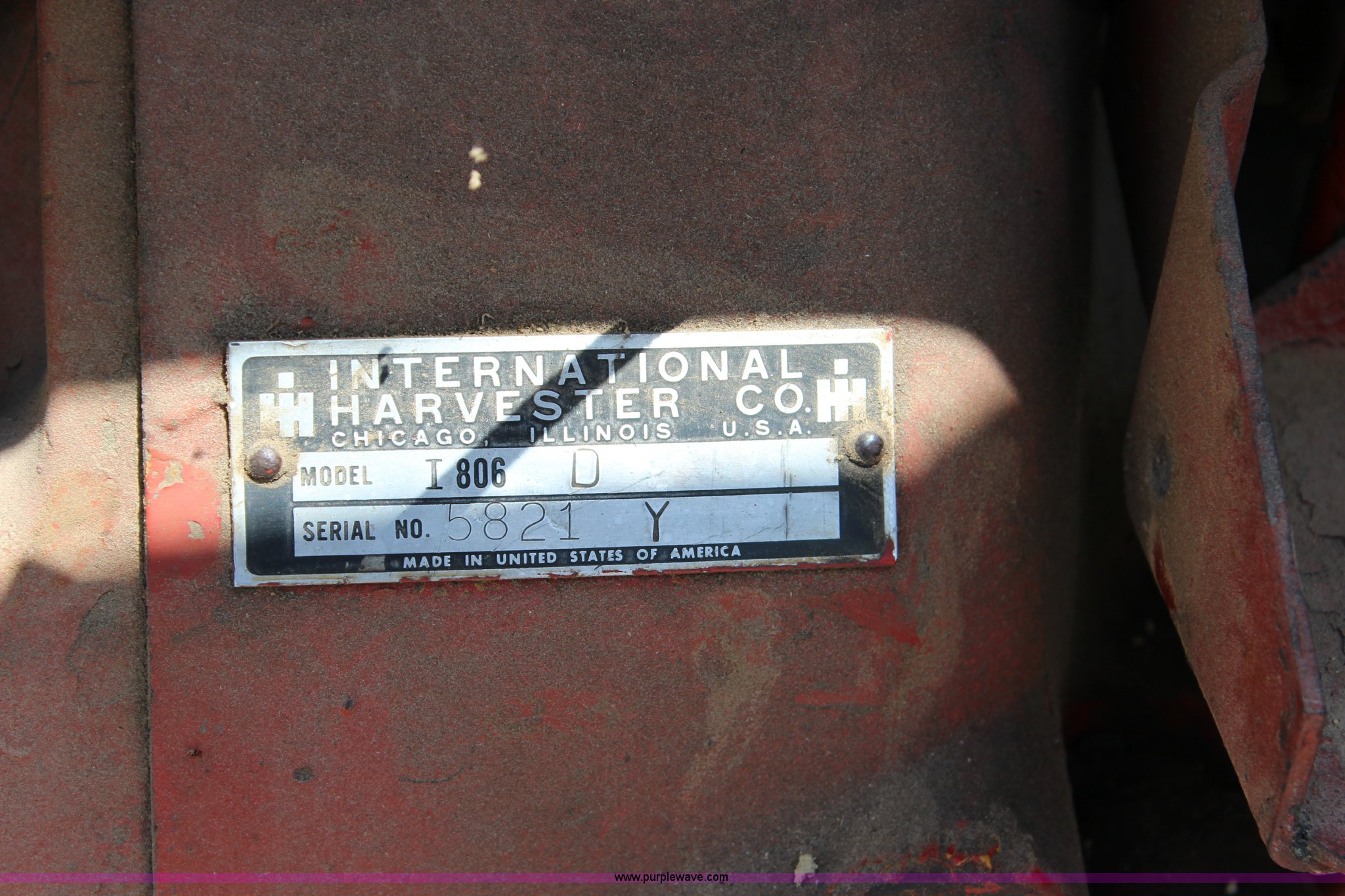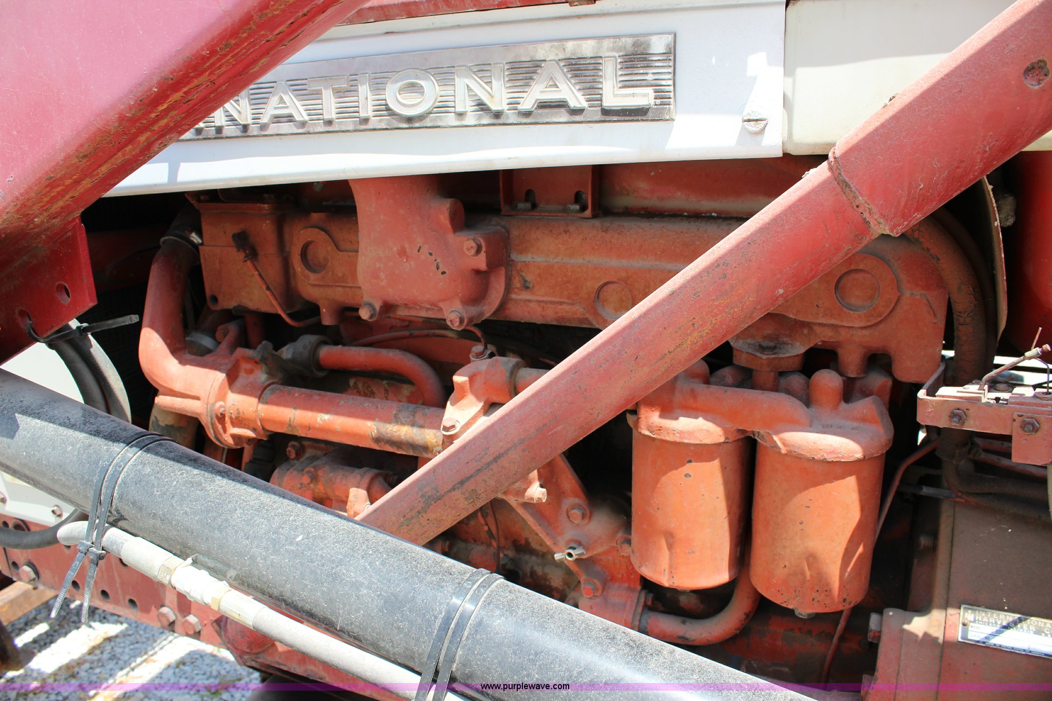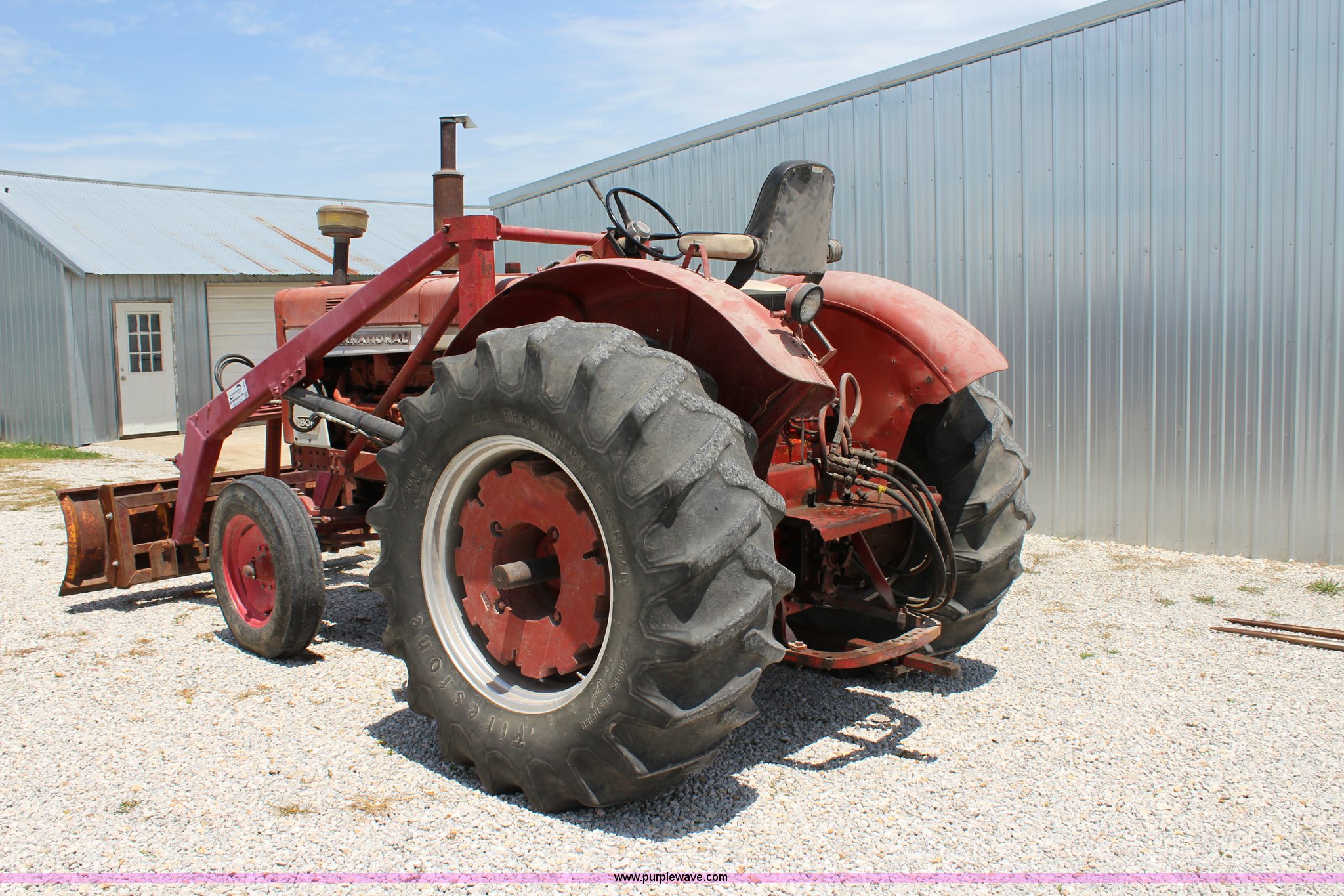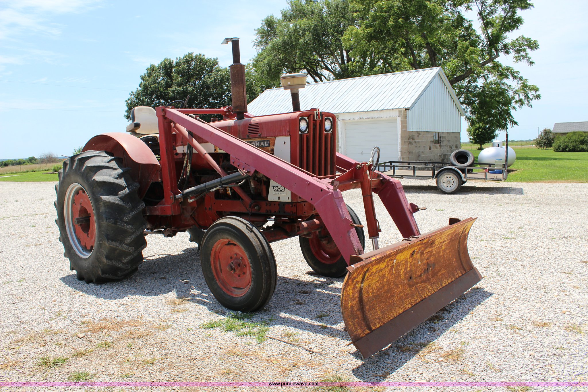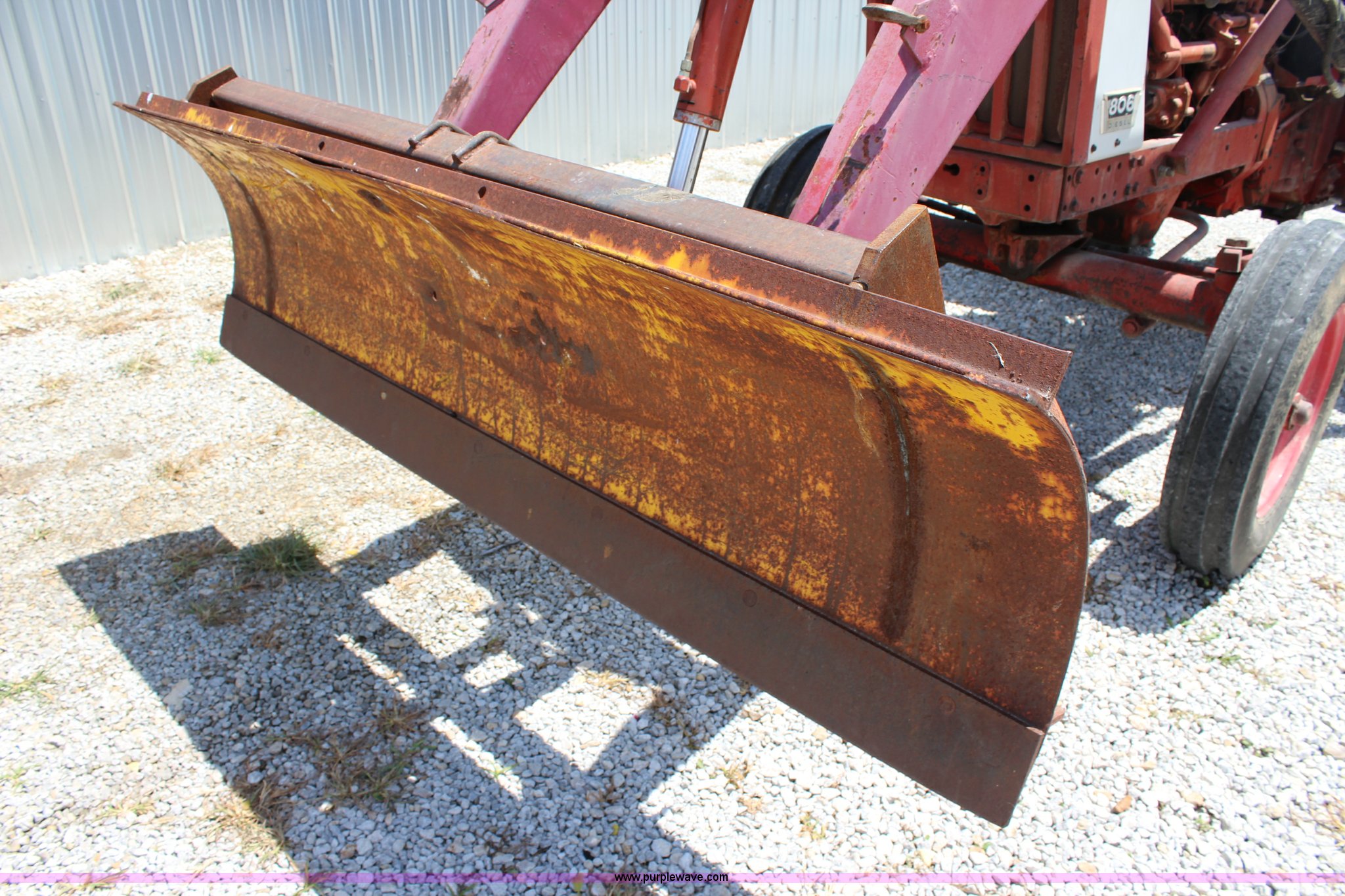 Purple Wave is selling a used Tractor in Kansas. This item is a 1965 International 806 Wheatland tractor with the following: Unknown hours on meter, International 5.9L six cylinder diesel engine, 95 HP, 8F-4R gears, Factory T/A delete, 540/1000 PTO, (2) rear hydraulic remote sets, Du-Al loader, 7'W front blade, Blade can be removed, Two bale spear, Rear wheel weights, 7.50-20 front tires, 20.8-34 rear tires, Serial 5821Y