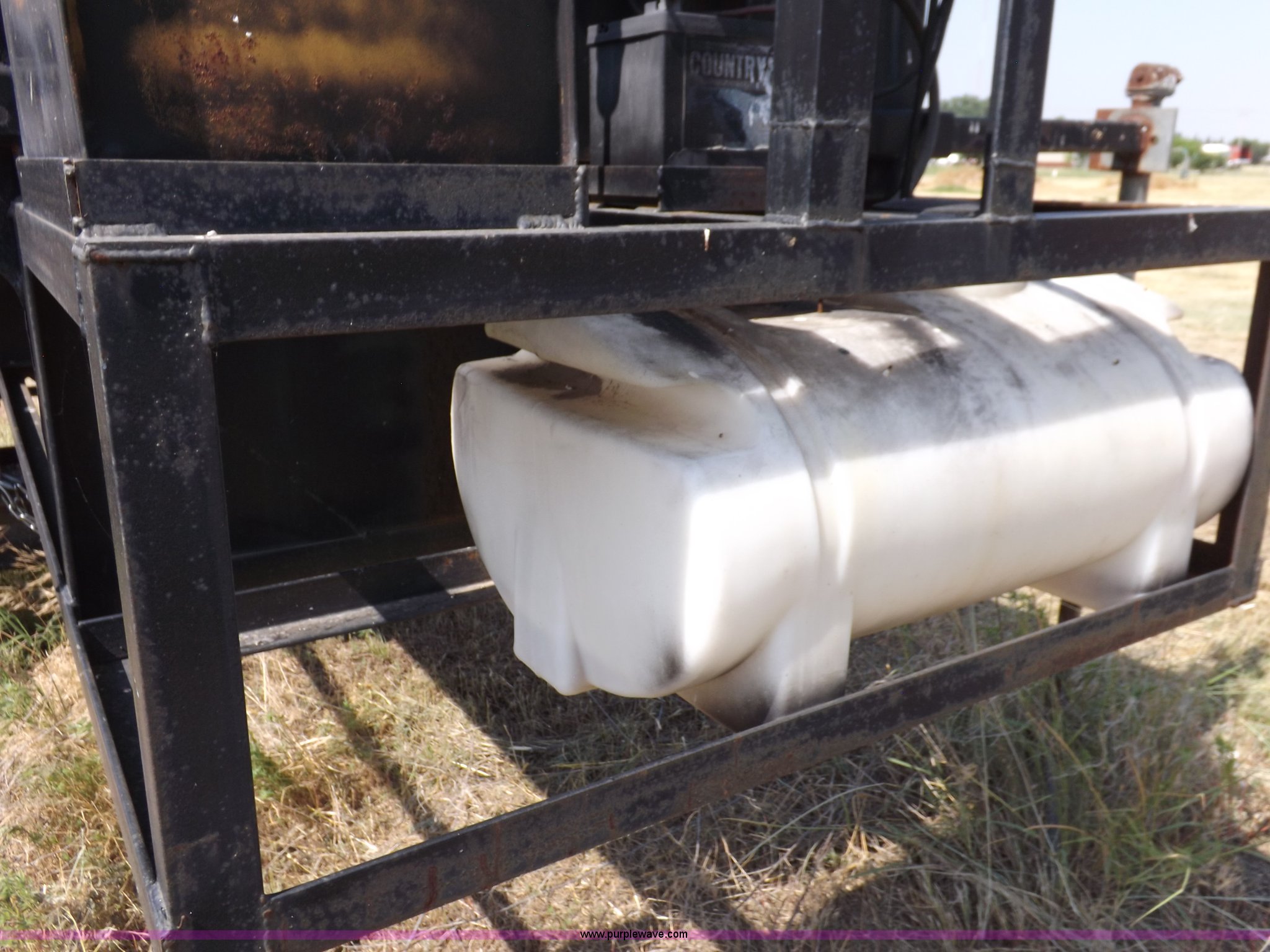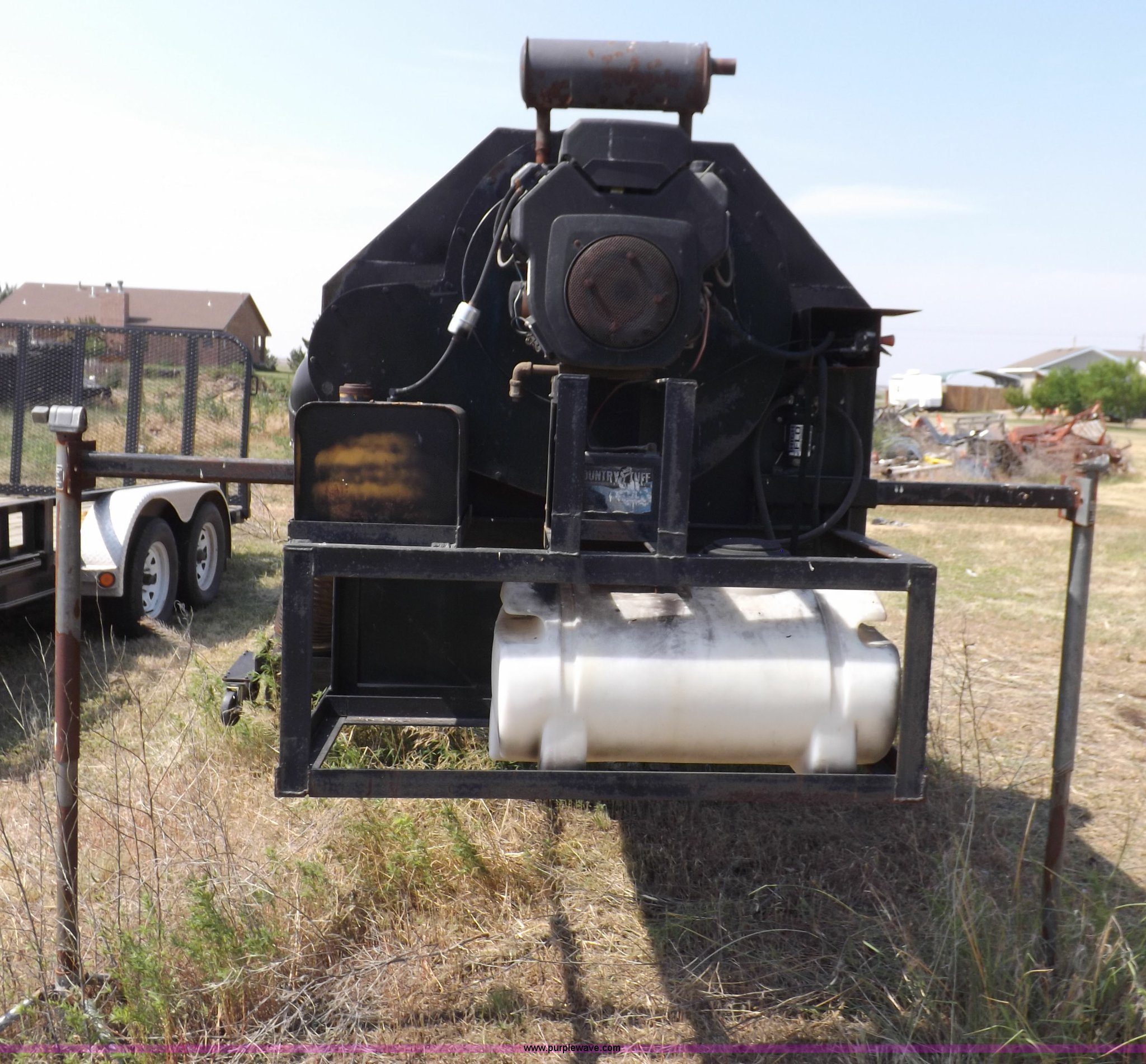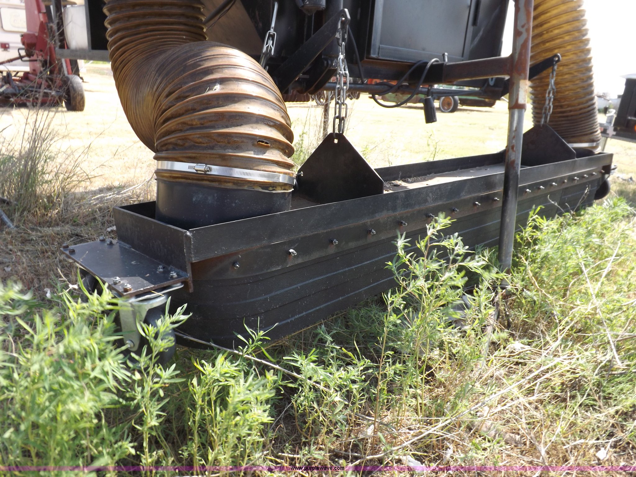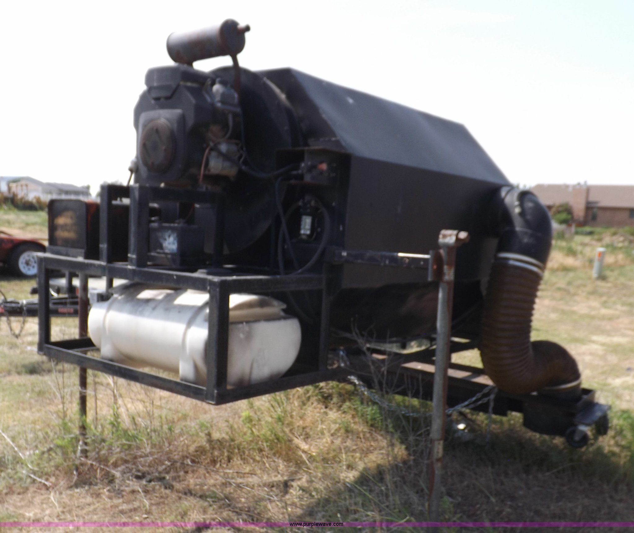 Parking lot vacuum. Kohler Command two cylinder gas engine 22 HP, Electric start, 12V VAC head lift 6'L x 12"W vacuum head, Casters, Dust control system with pump 24 gallon tank, 7'L x 45"W x 5'H base, Slides in pickup truck bed. 4105 Bell Ct.. Garden City, KS 67846