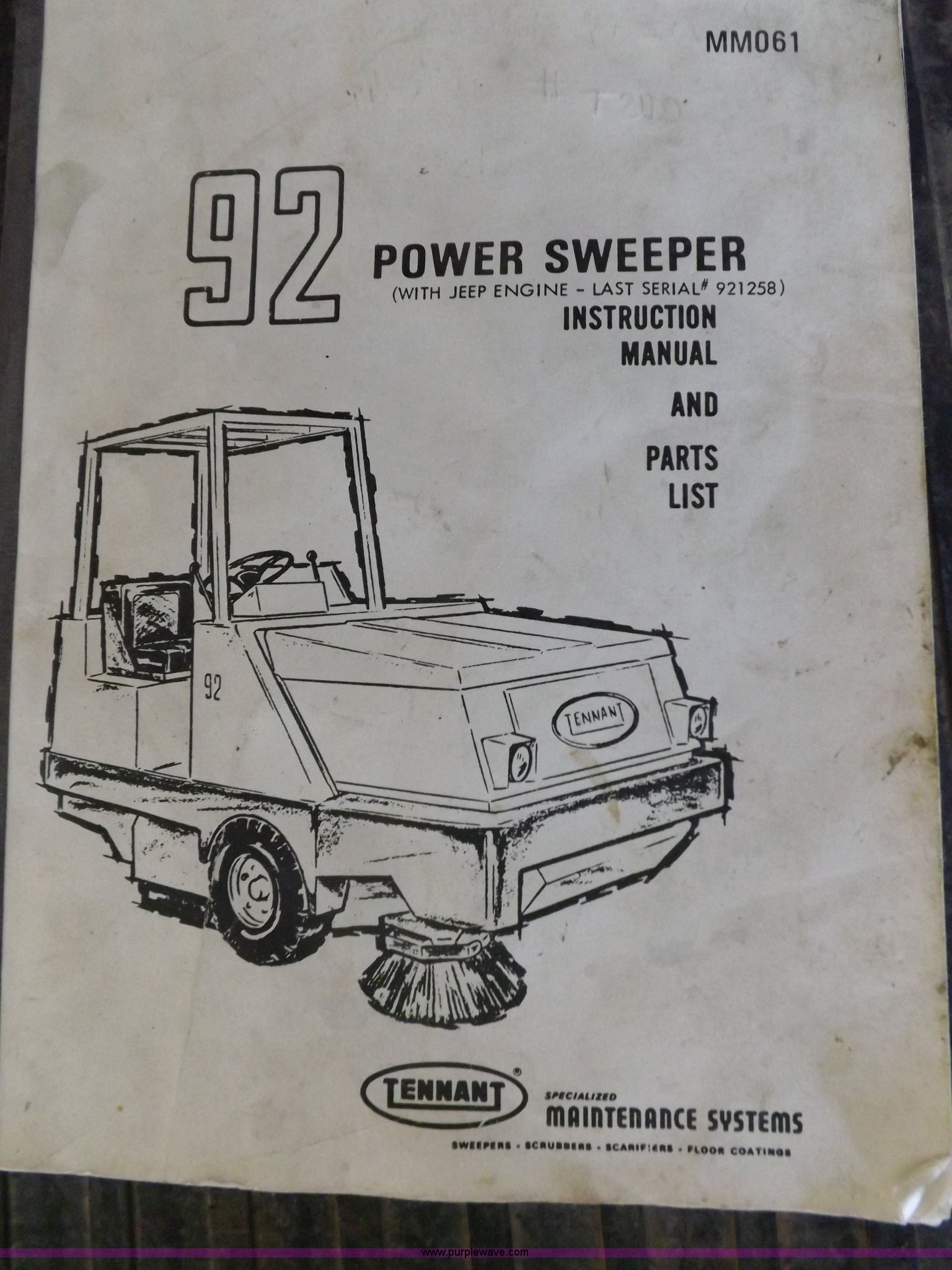 Purple Wave is selling a used Sweeper in Kansas. This item is a Tennant 92 sweeper with the following: 1,534 hours on meter, Kaiser Jeep four cylinder gas engine, Model 4F-IPU, Hydrostatic transmission, 6.9-9 rear tire, Operator's manual, Non-operational unit, Serial 920179