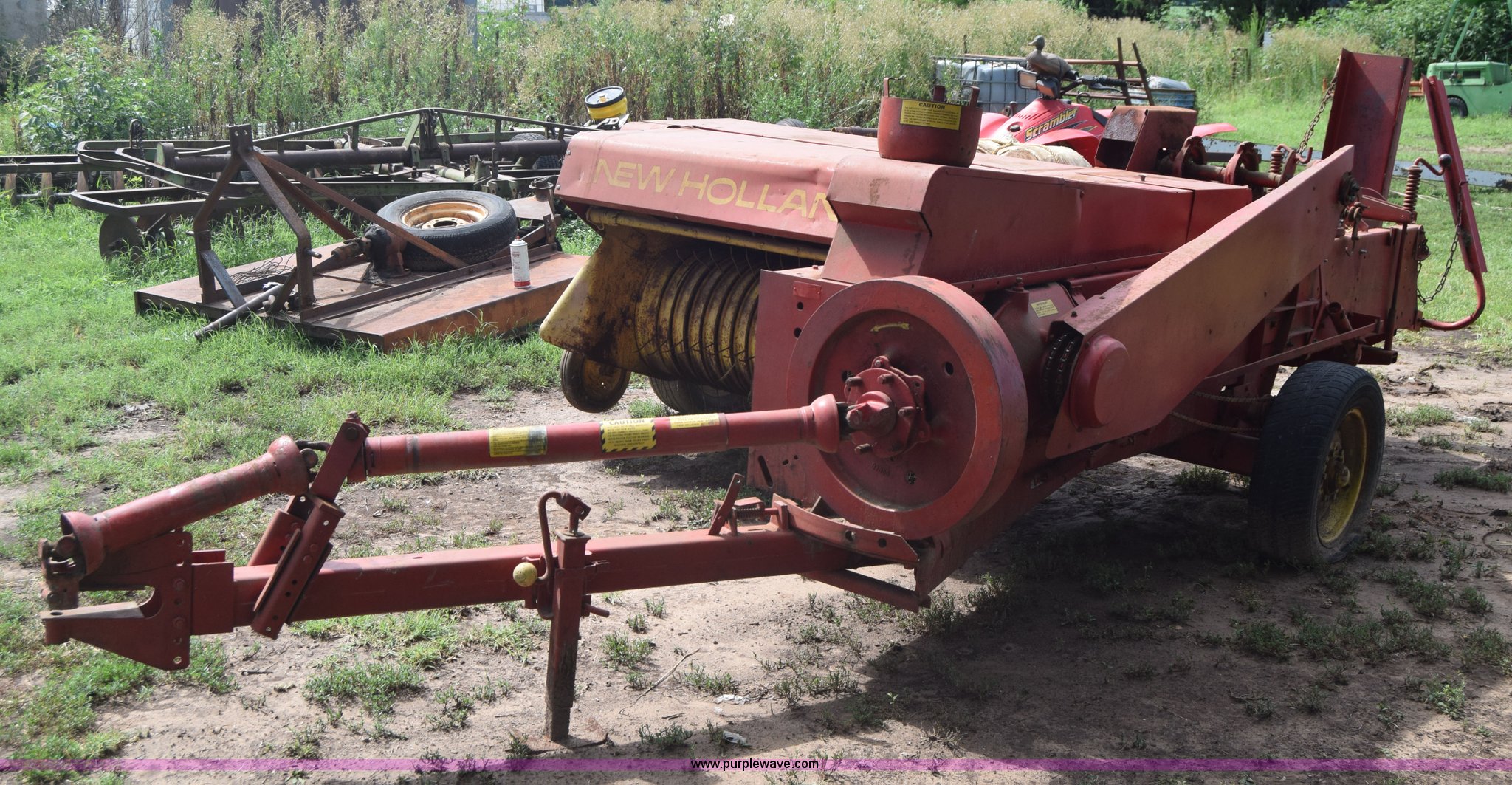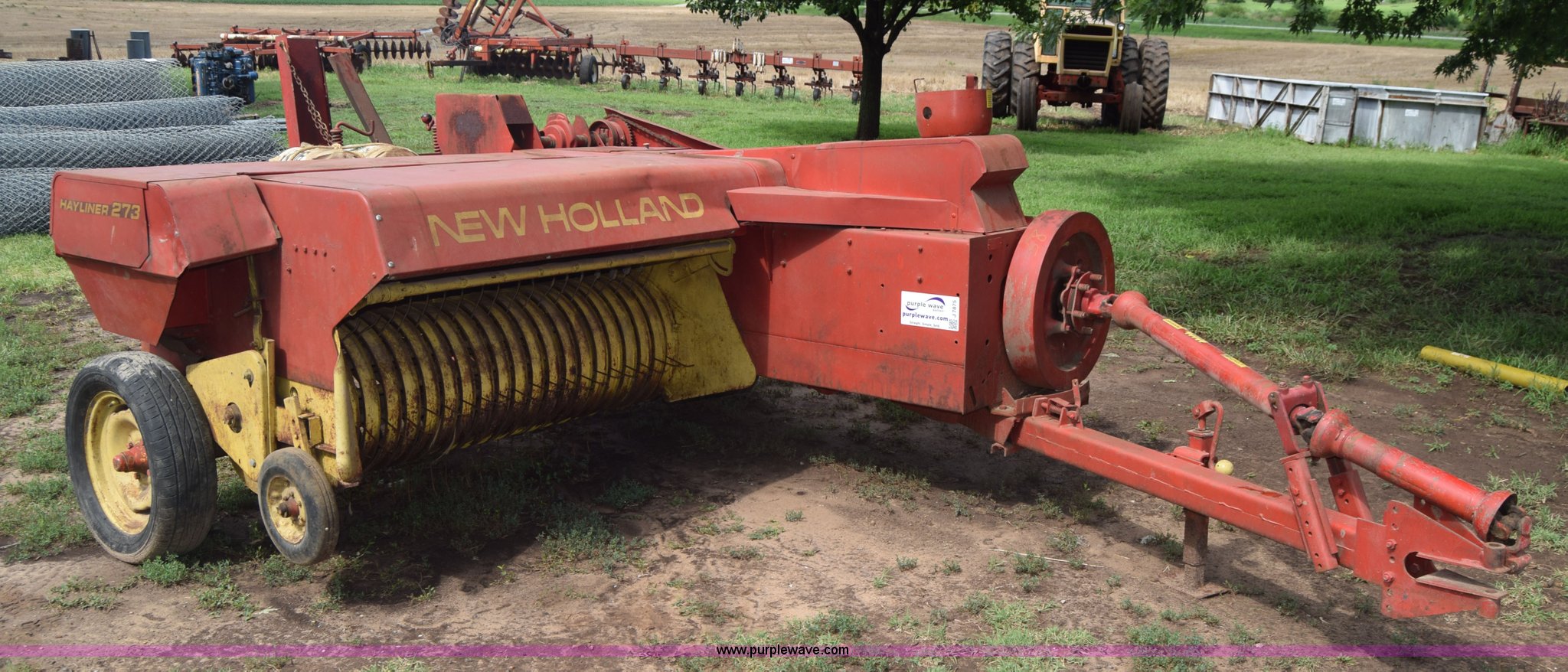 Purple Wave is selling a used Square Baler in Kansas. This item is a New Holland 273 small square baler with the following: 18" x 14" bale capacity, Twine tie, 5'W pickup, 540 PTO, Pin hitch, Rear pin hitch, 195/60R15 tires