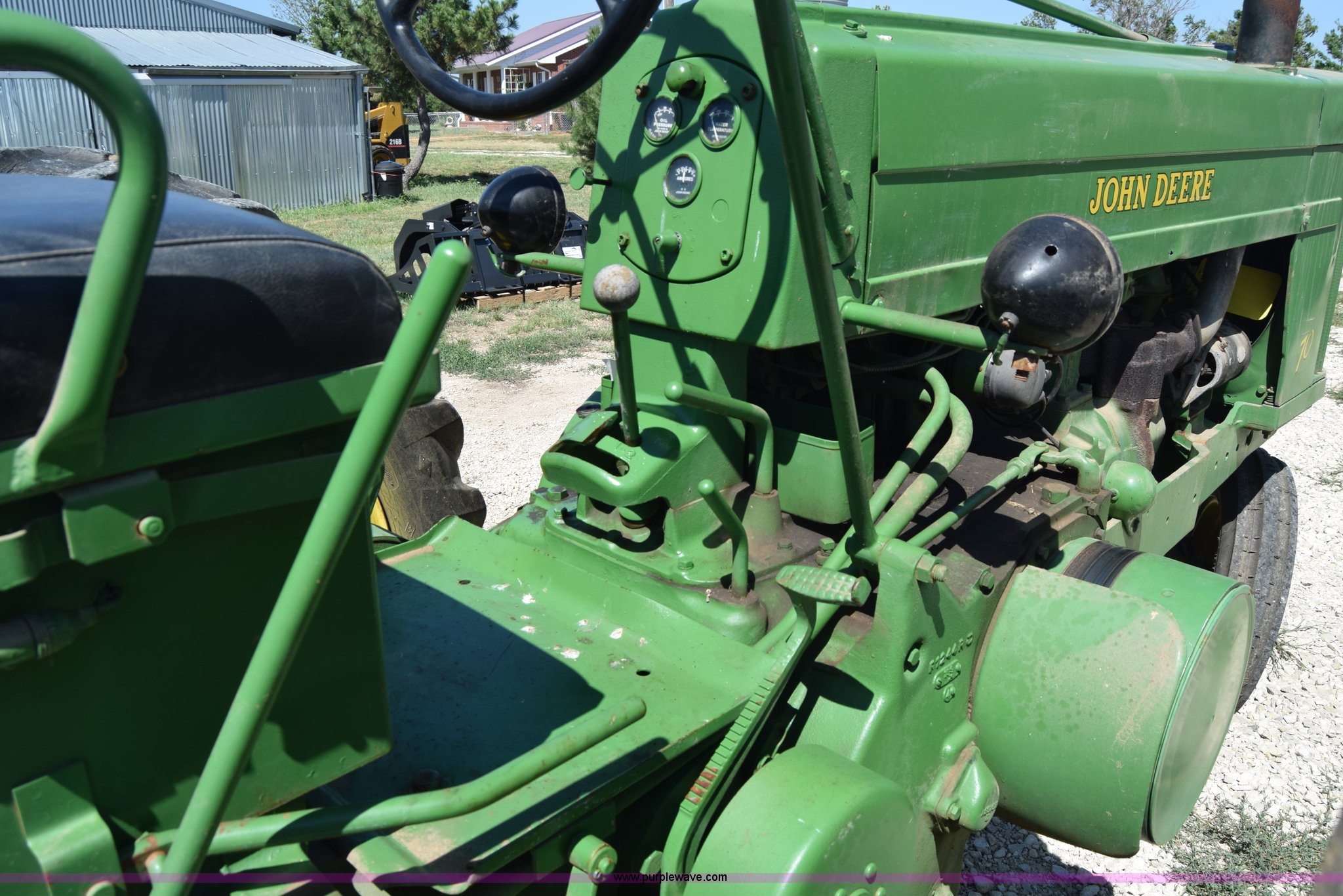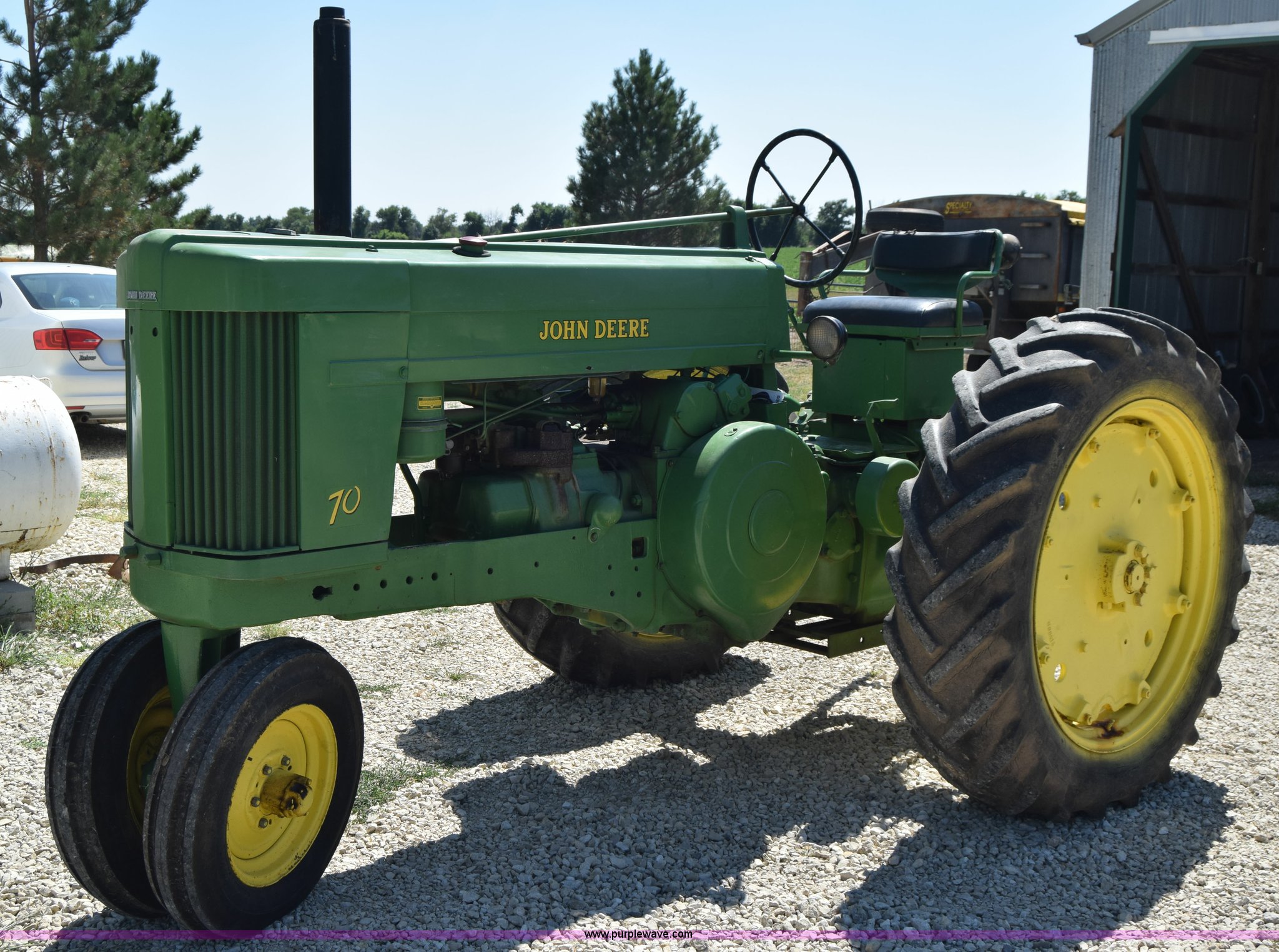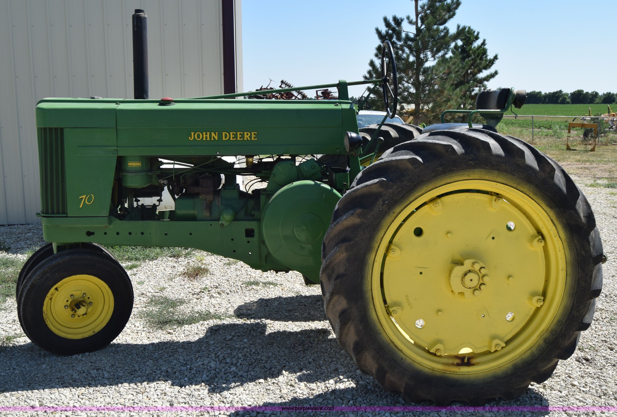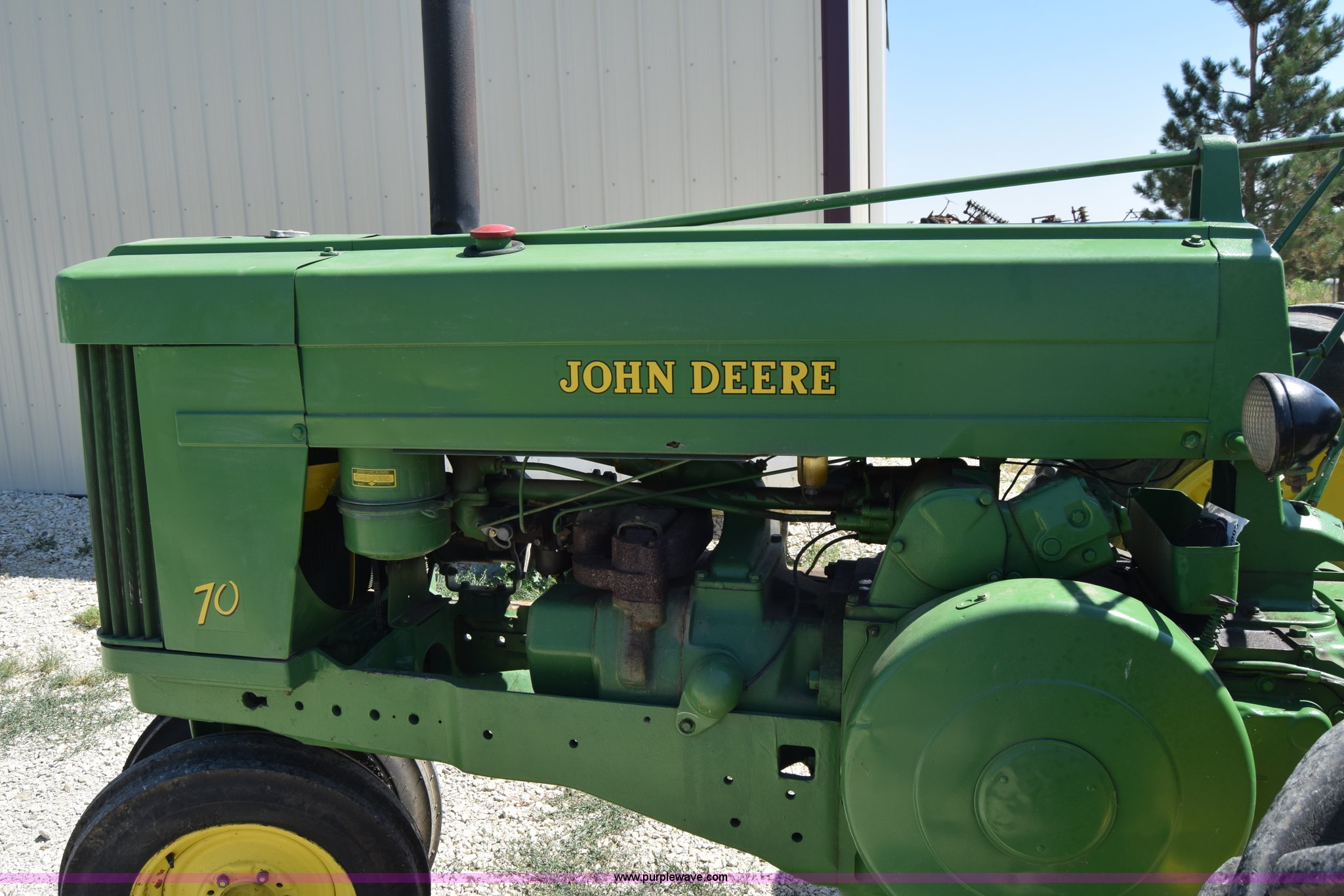 Purple Wave is selling a used Tractor in Kansas. This item is a 1954 John Deere 70 tractor with the following: John Deere 6.2L two cylinder gas engine, 45 HP, Manual transmission, 6F-1R gears, Front work lights, Powr-Trol unit, Three point, 540 PTO, 6.00-16 front tires, Recently replaced, 15.5-38 rear tires, Serial 7014227