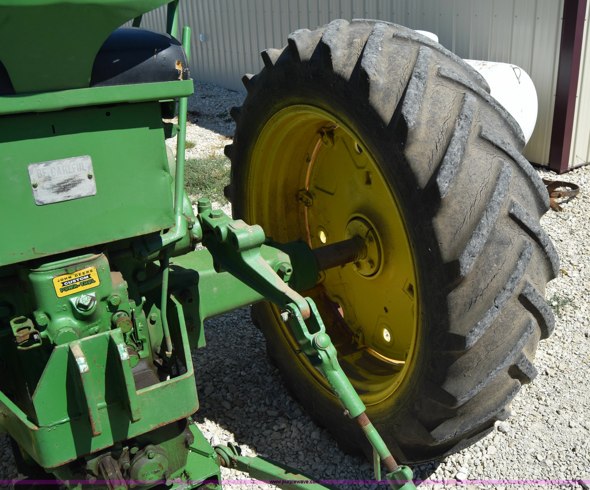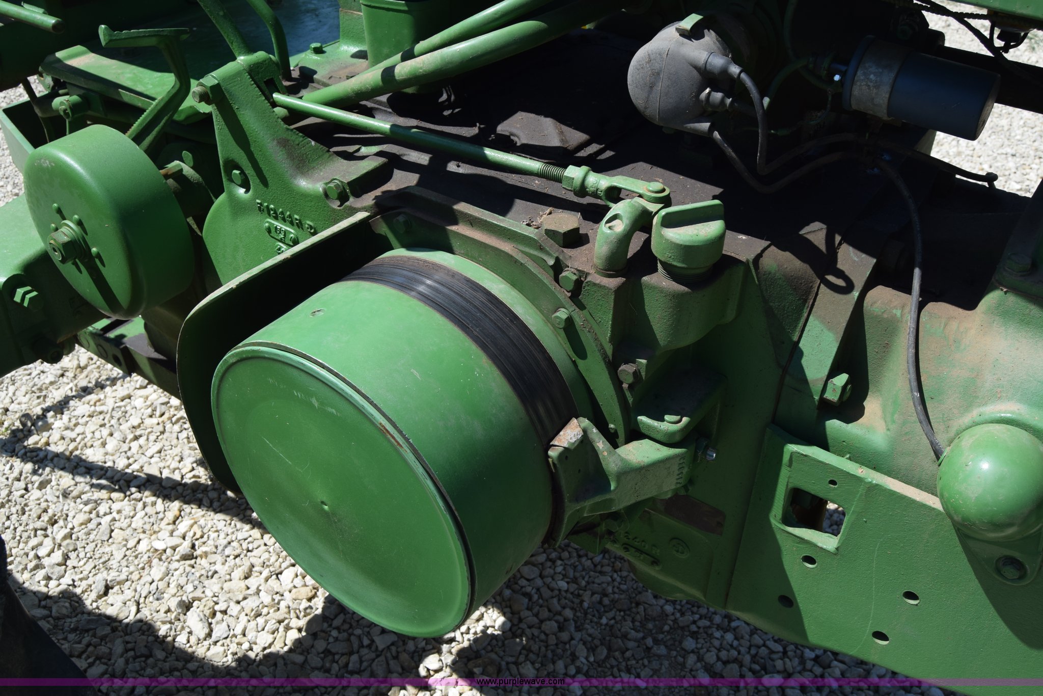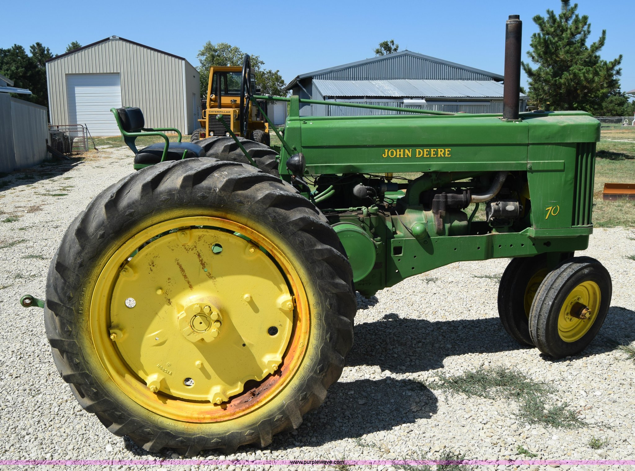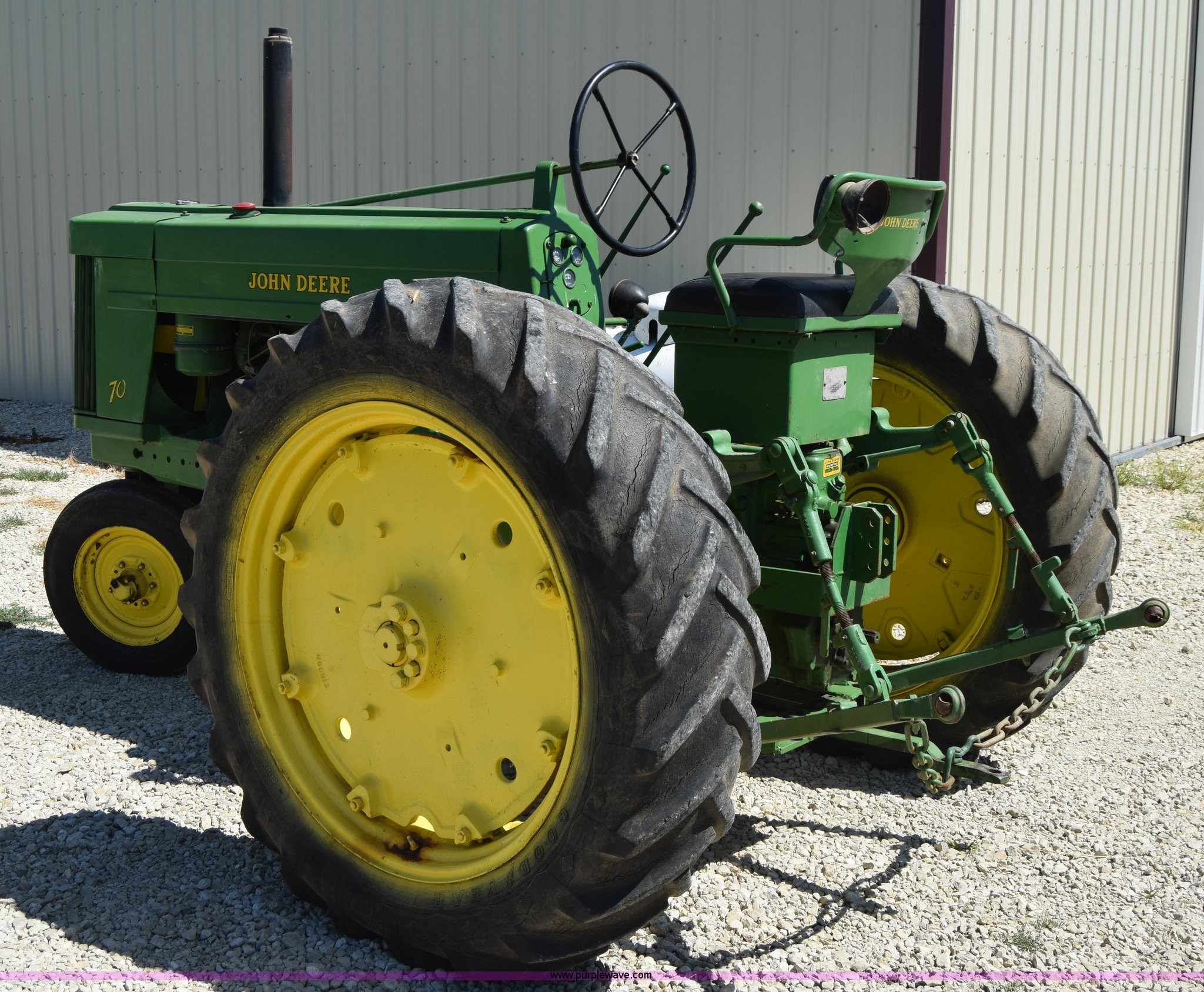 Purple Wave is selling a used Tractor in Kansas. This item is a 1954 John Deere 70 tractor with the following: John Deere 6.2L two cylinder gas engine, 45 HP, Manual transmission, 6F-1R gears, Front work lights, Powr-Trol unit, Three point, 540 PTO, 6.00-16 front tires, Recently replaced, 15.5-38 rear tires, Serial 7014227