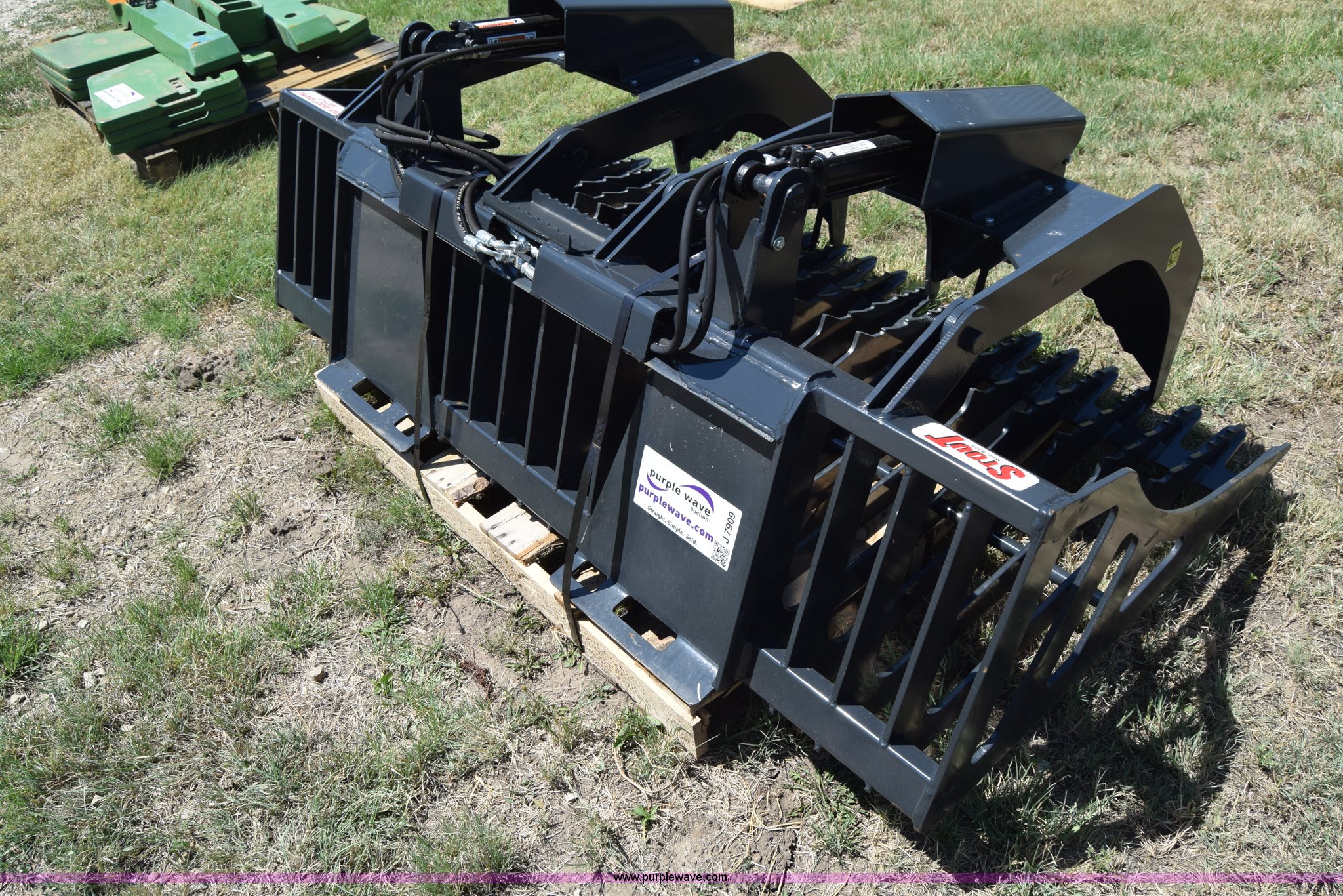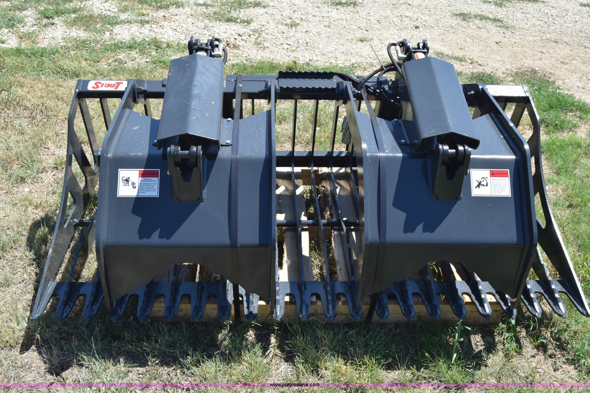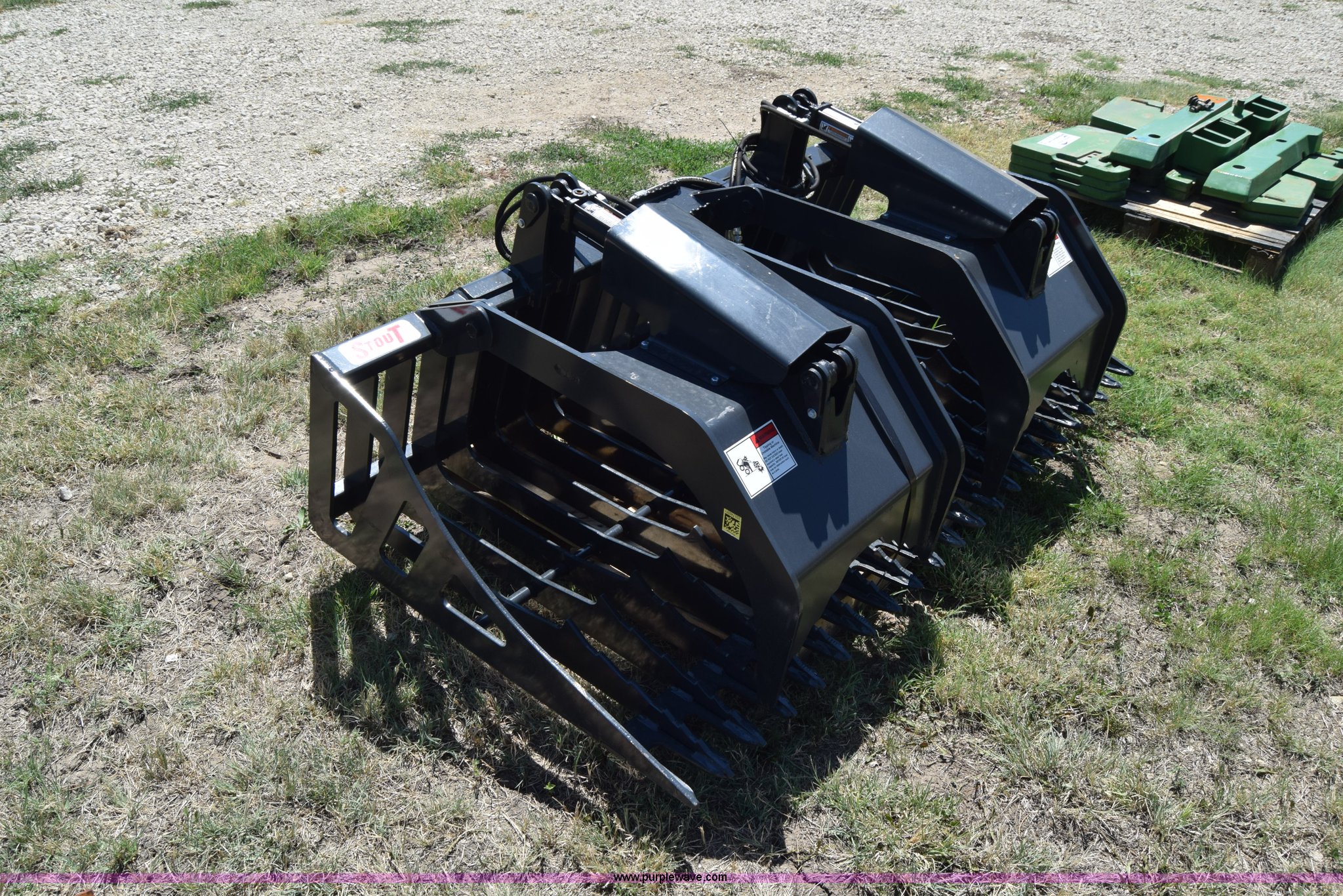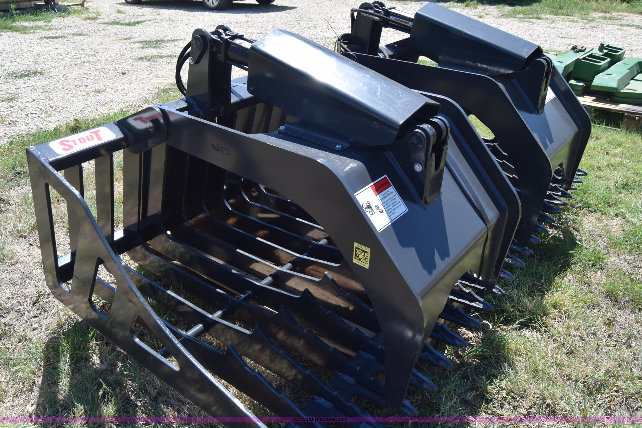 Purple Wave is selling a used Skid Steer Attach. in Kansas. This item is a Stout HD72-3 skid steer grapple bucket with the following: 72"W, Hydraulic hose and connectors, Rock bucket type, Unused
