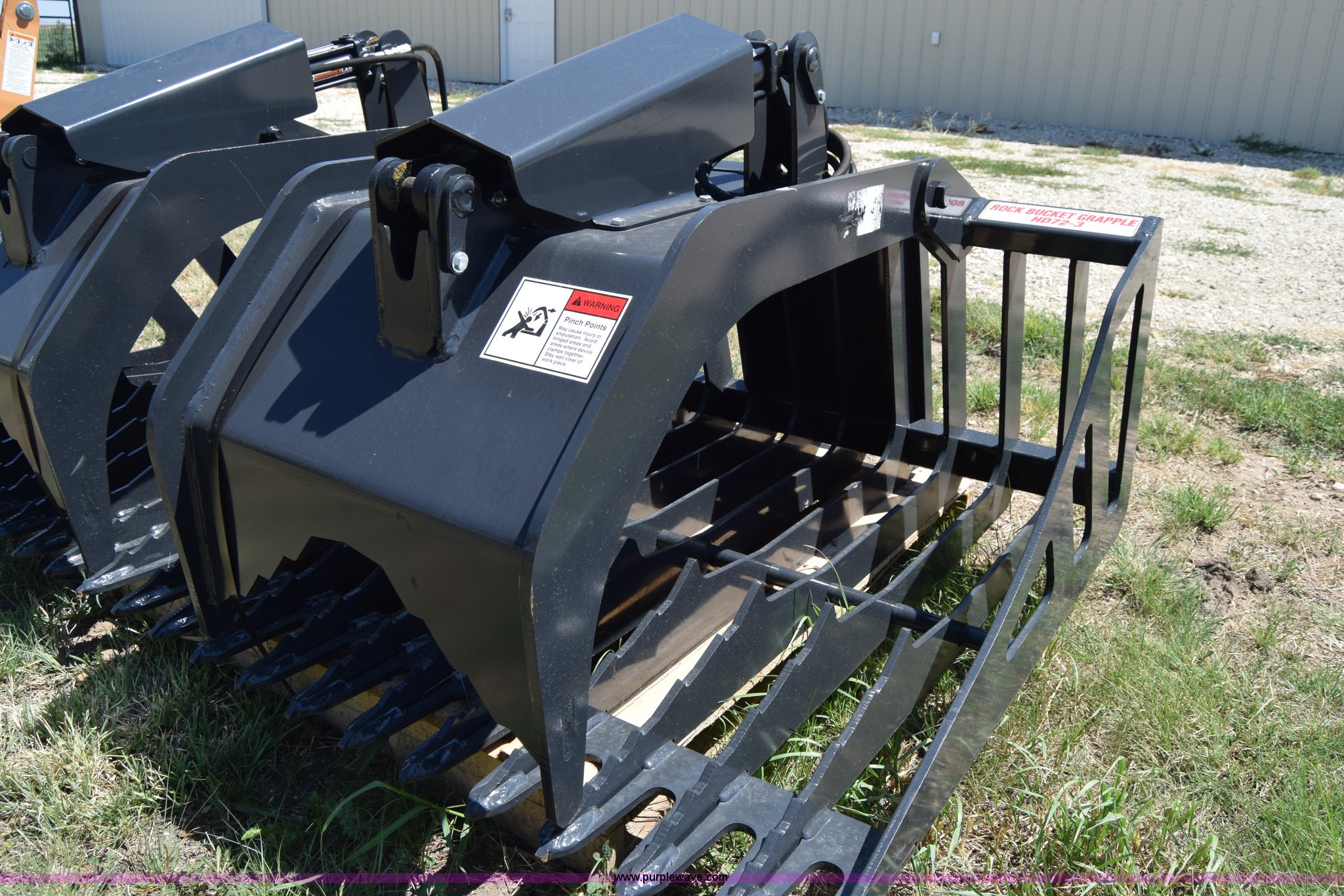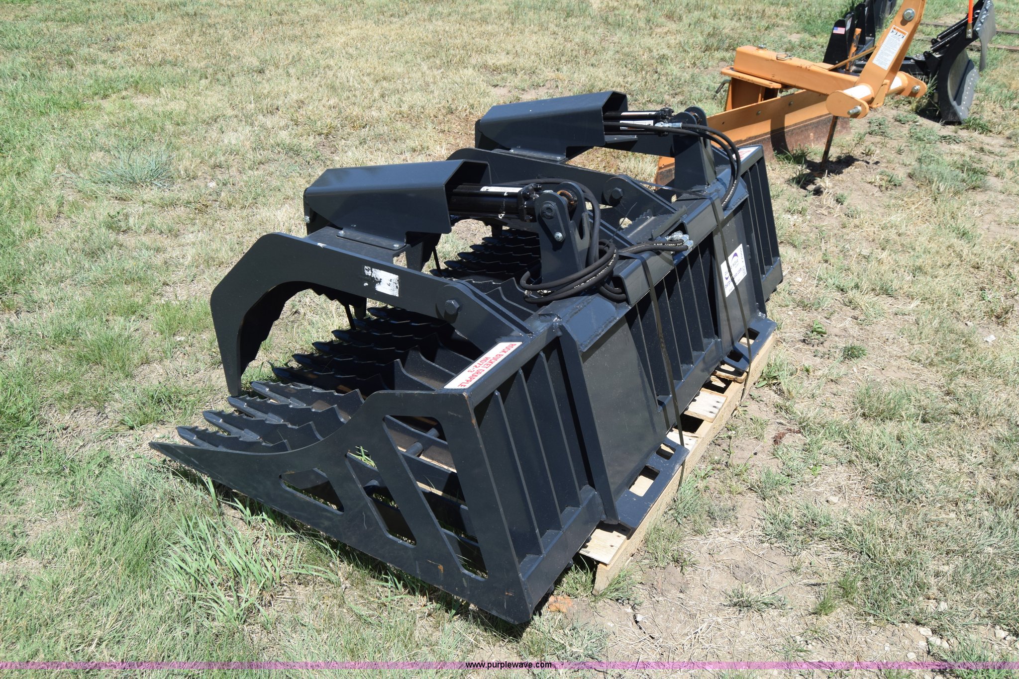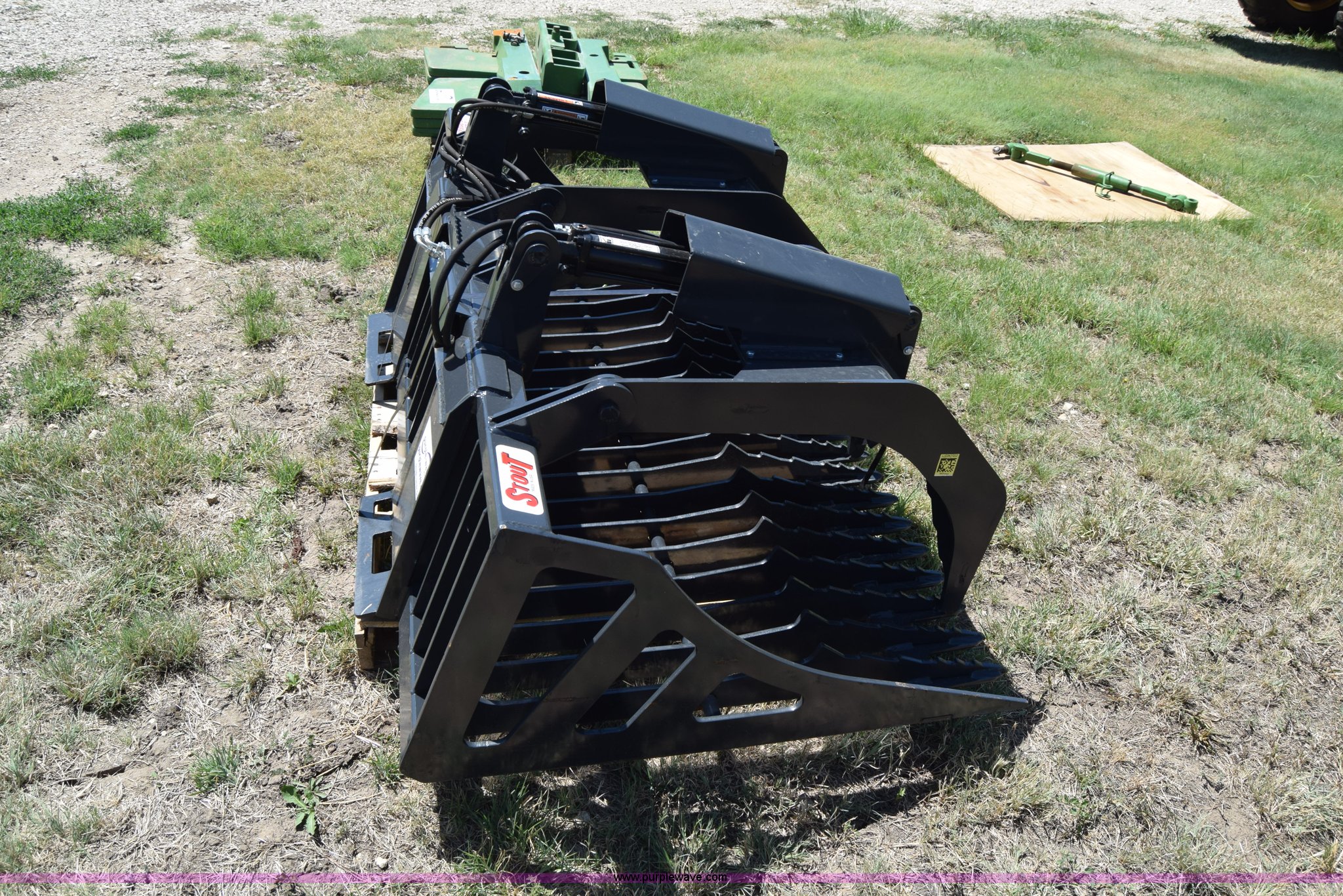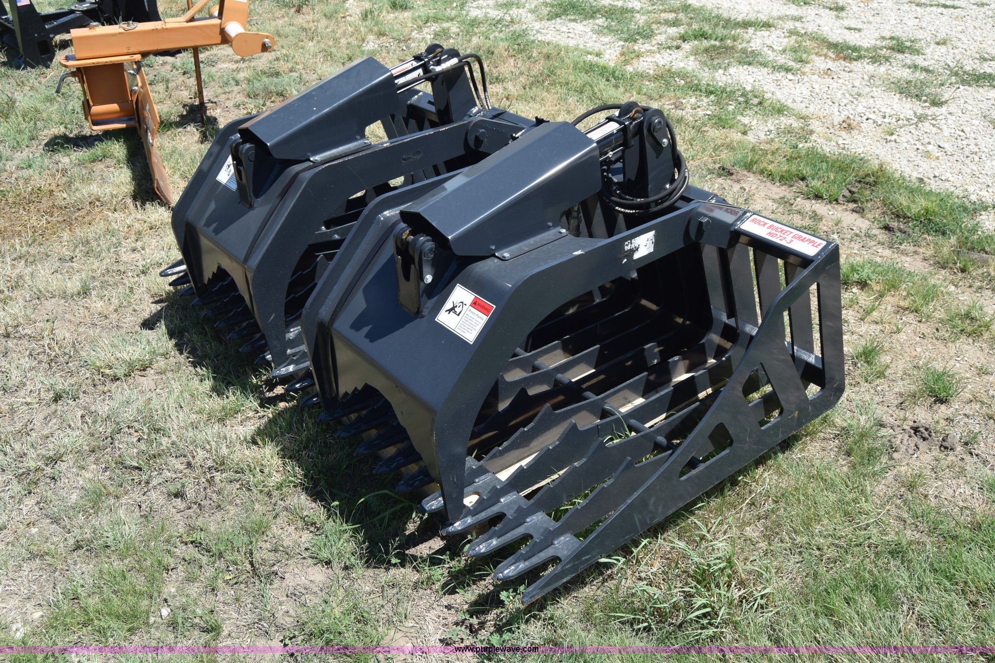 Purple Wave is selling a used Skid Steer Attach. in Kansas. This item is a Stout HD72-3 skid steer grapple bucket with the following: 72"W, Hydraulic hose and connectors, Rock bucket type, Unused