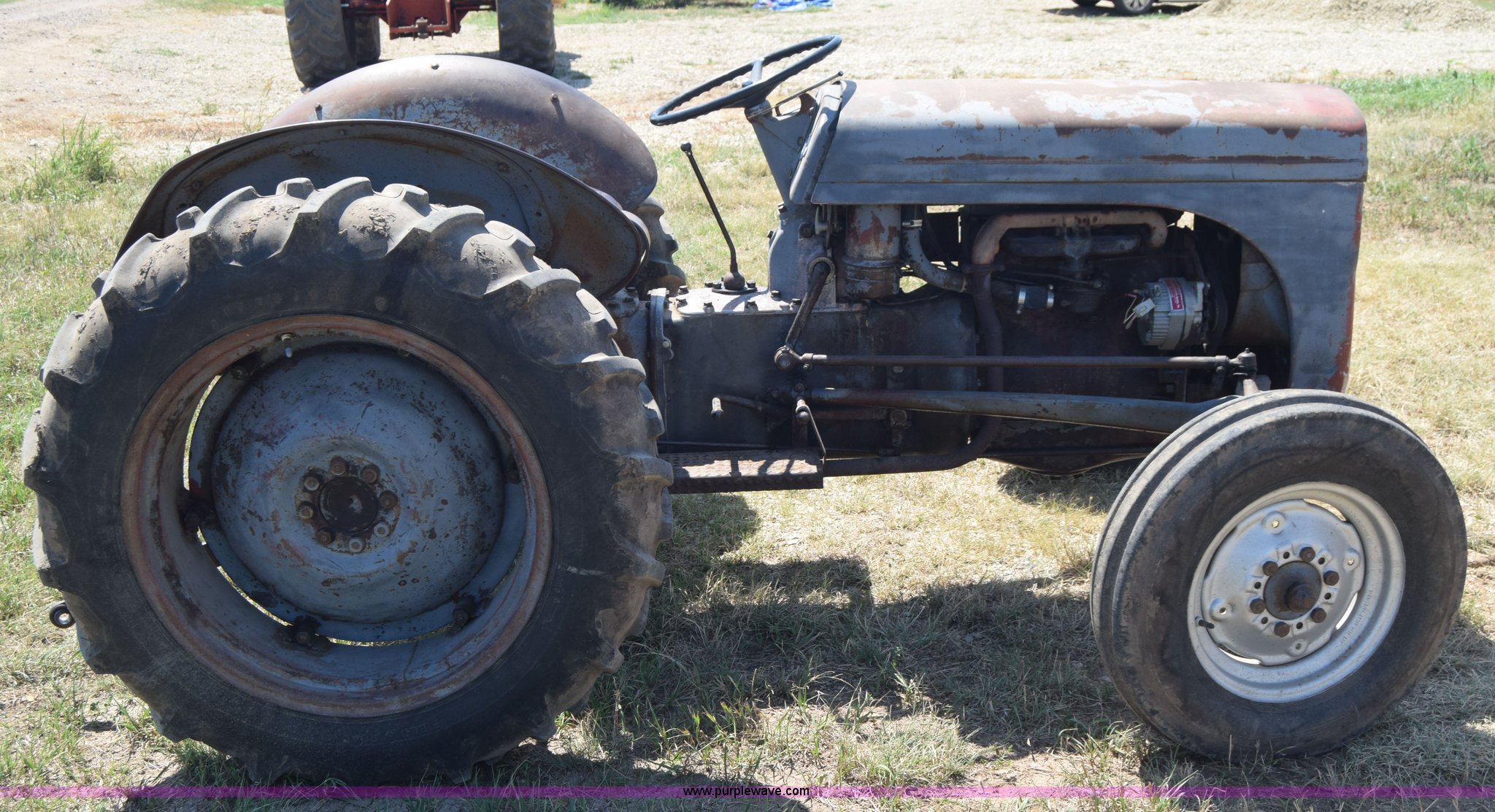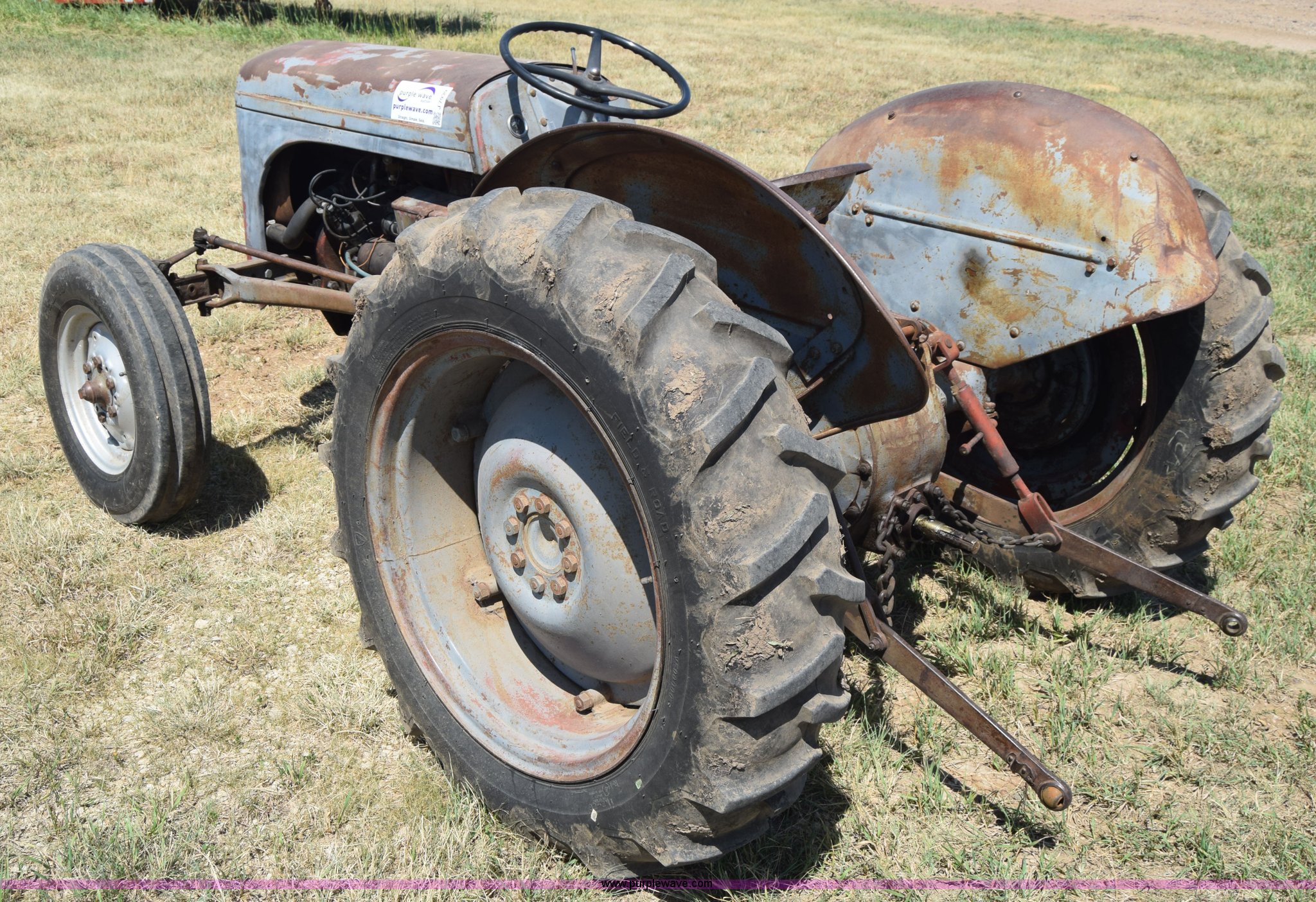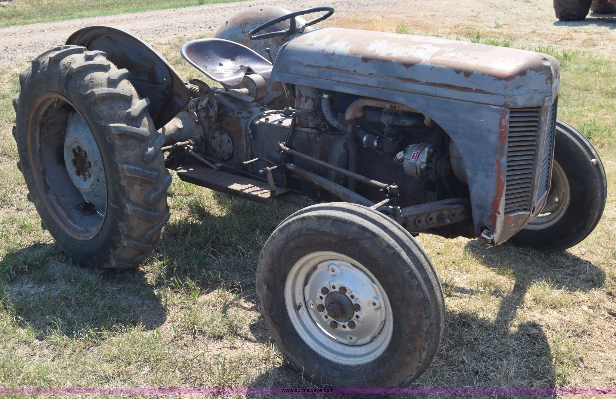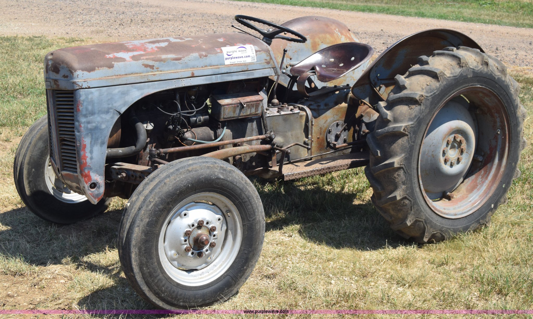 Purple Wave is selling a used Tractor in Kansas. This item is a Massey-Ferguson TE20 tractor with the following: Continental 2.0L four cylinder gas engine, 25 HP, Manual transmission, 4F-1R gears, Suspension seat, Three point, 540 PTO, Converted to 12V, 6.50-16 front tires, 11.2-28 rear tires, (2) additional front wheels included, Leaks oil, Serial 50601