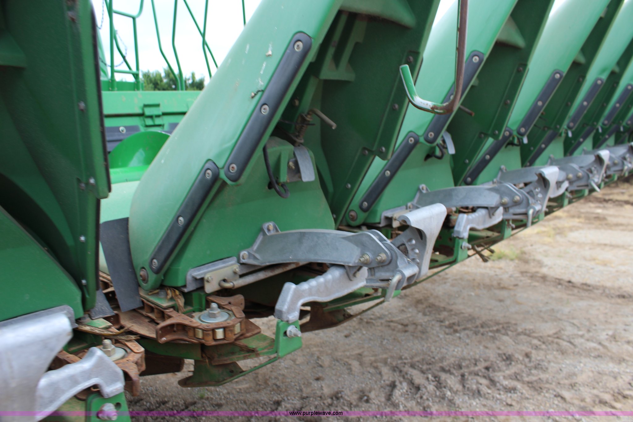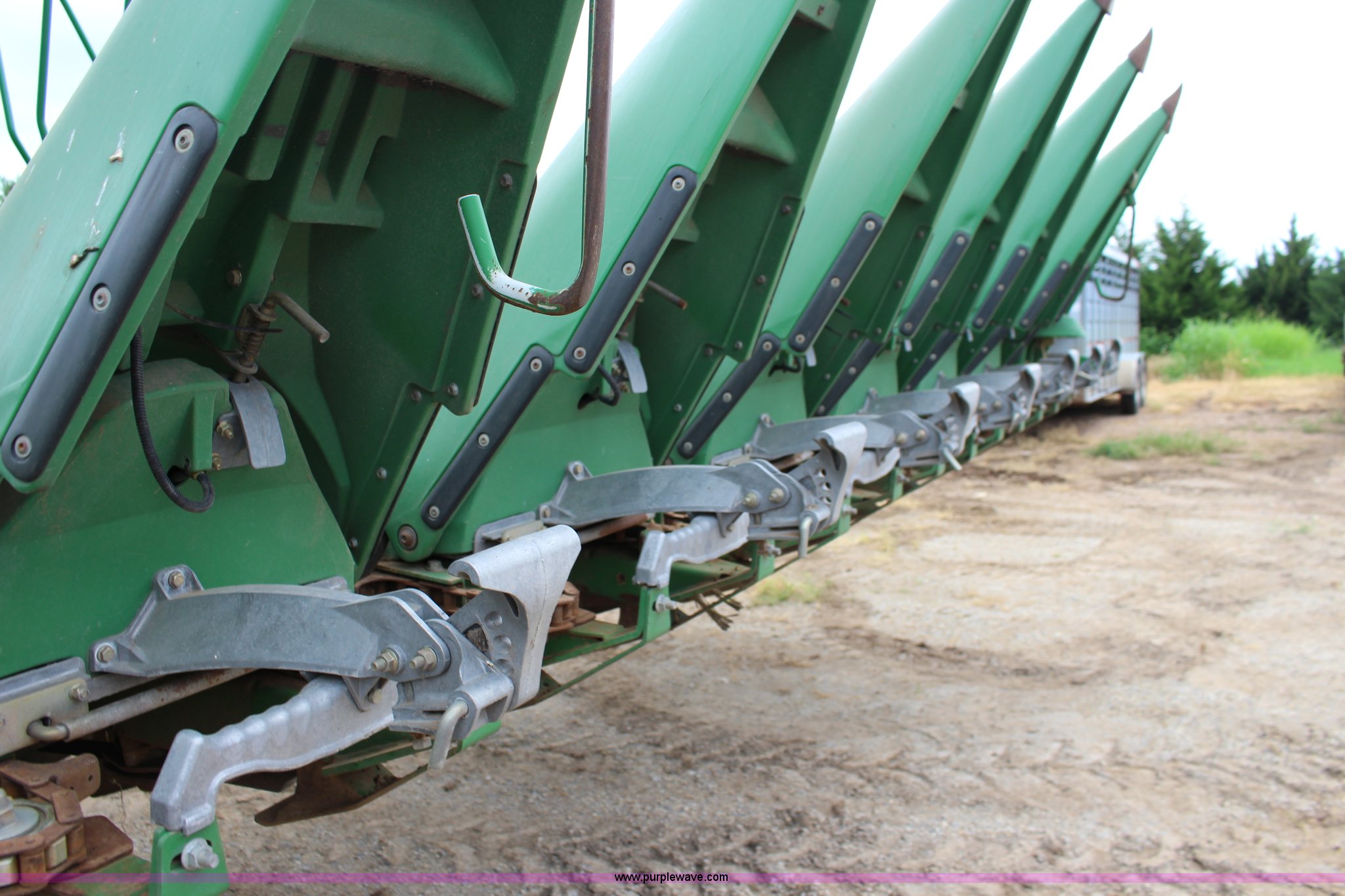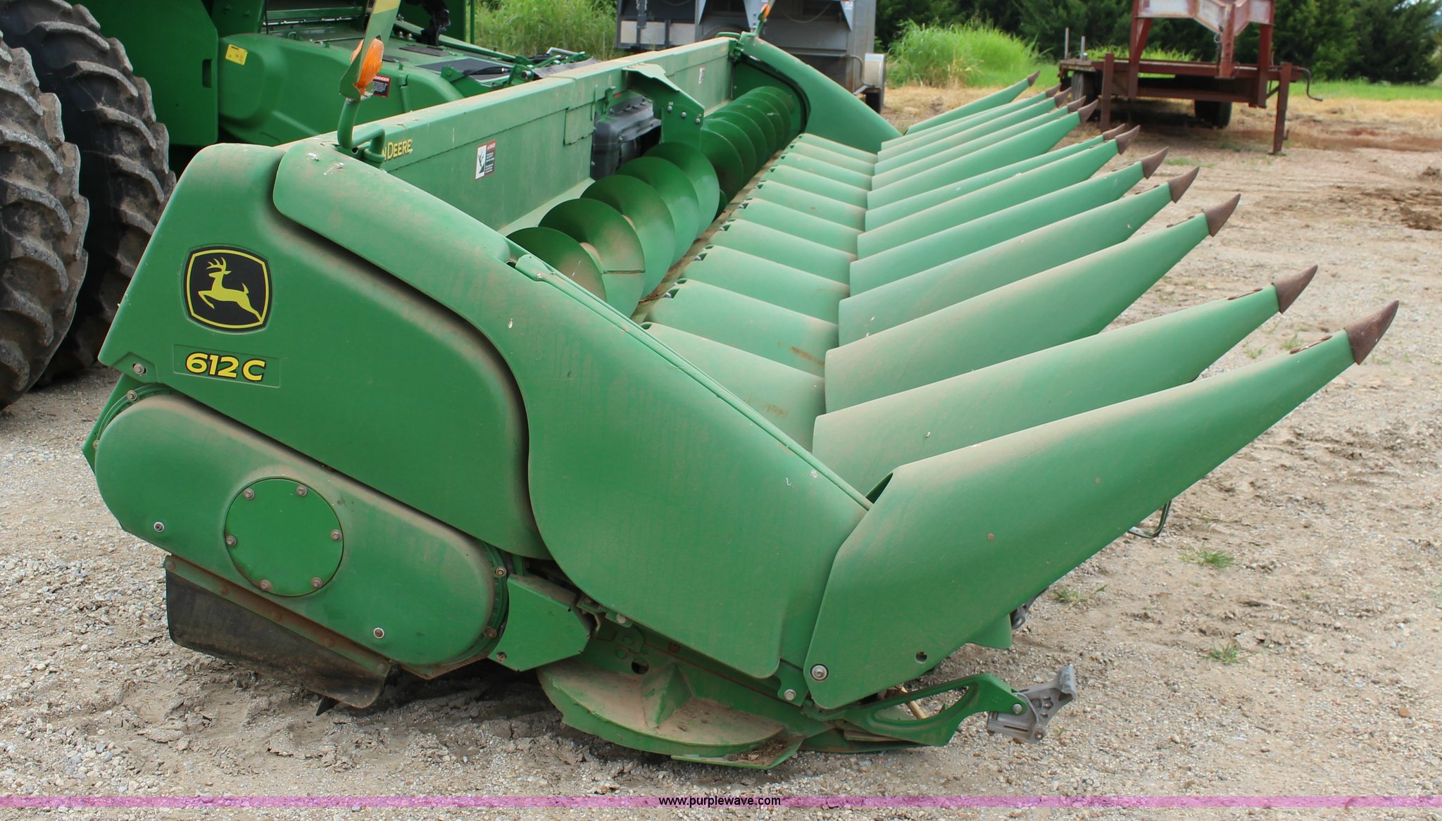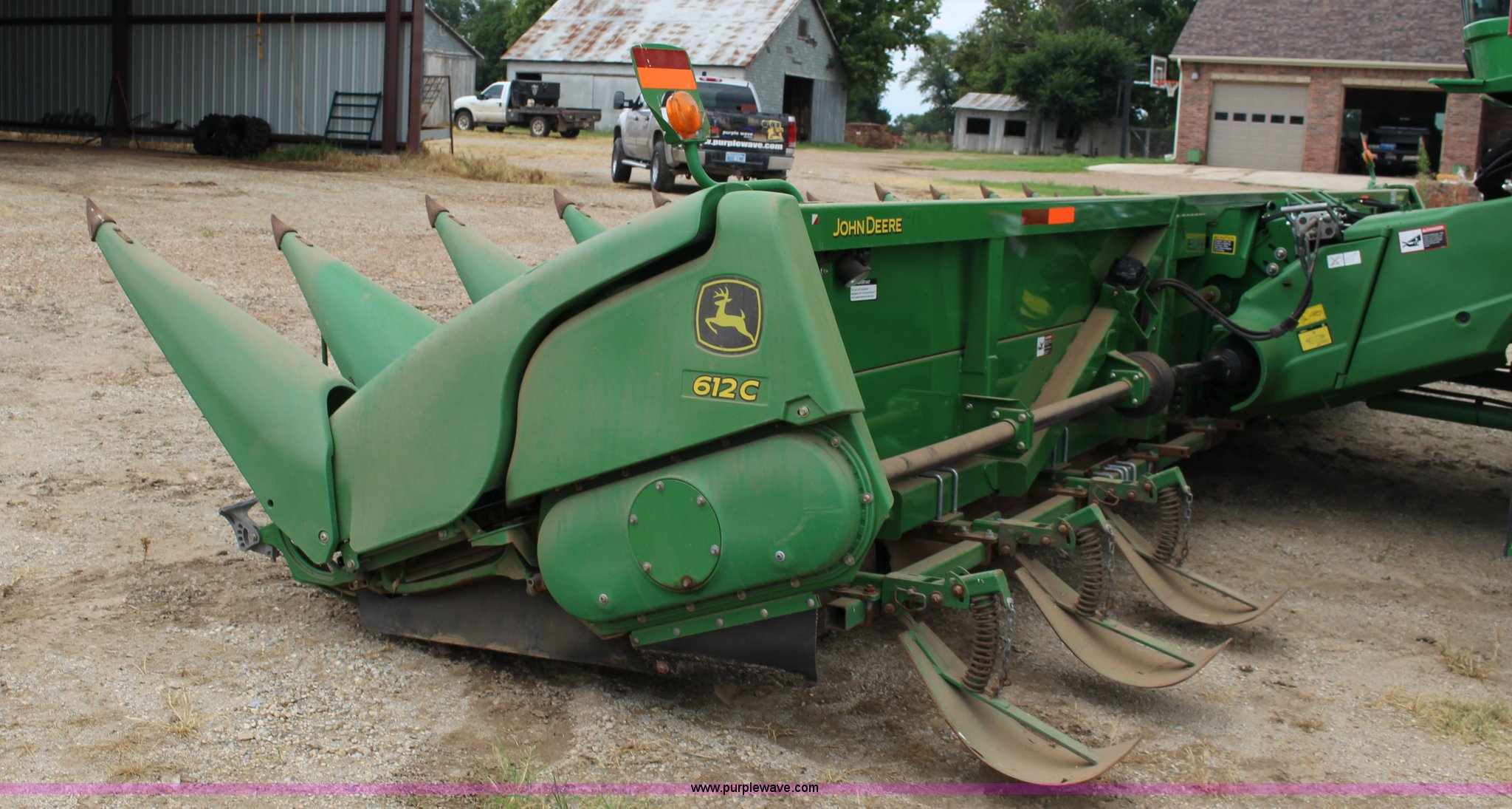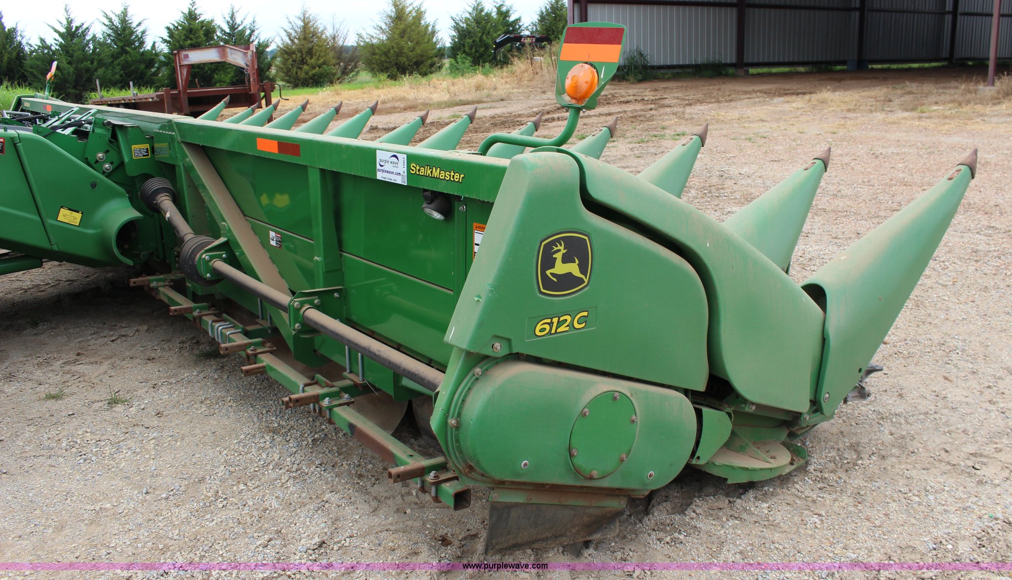 Purple Wave is selling a used Corn or Row Head in Kansas. This item is a 2010 John Deere 612C Stalkmaster chopping corn head with the following: 12 row, 30" spacing, Stalk choppers, Stalk stompers, Poly snouts, Has not been used since it was reconditioned, Serial 1H0612CCEA0735644