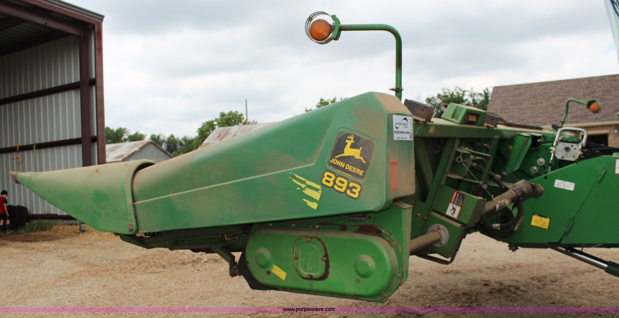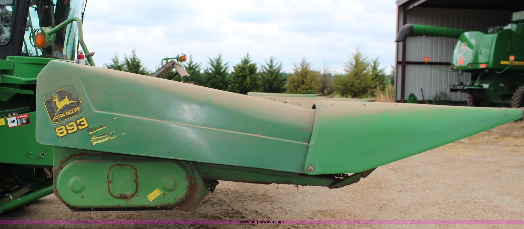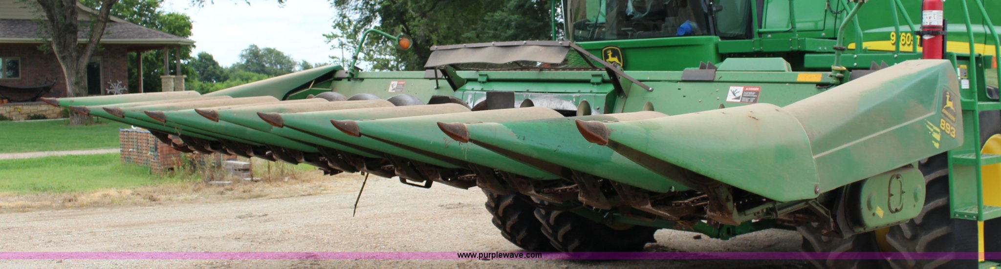Purple Wave is selling a used Corn or Row Head in Kansas. This item is a John Deere 893 corn head with the following: Eight row, (2) straw stompers, Poly snouts, Serial 0014847