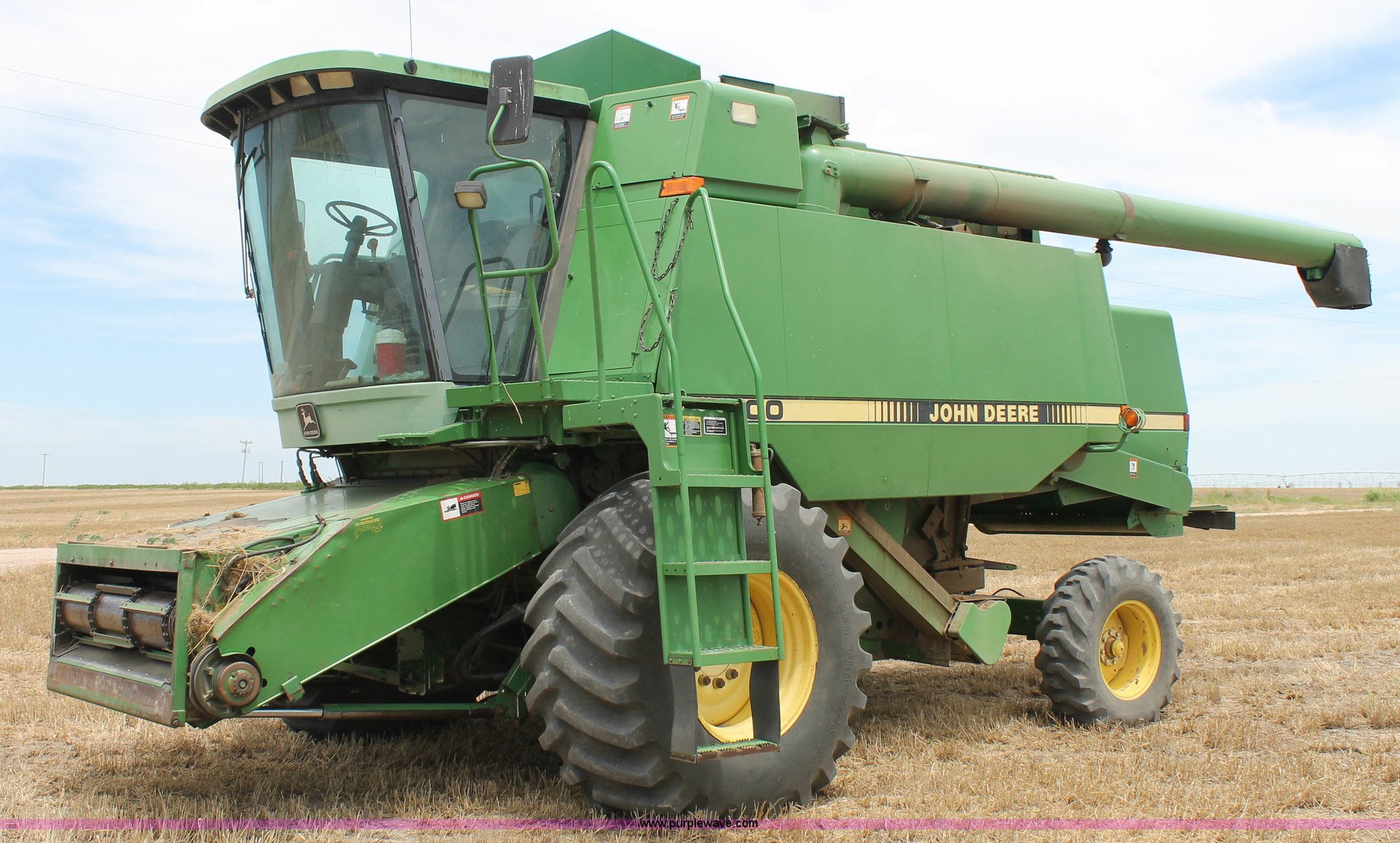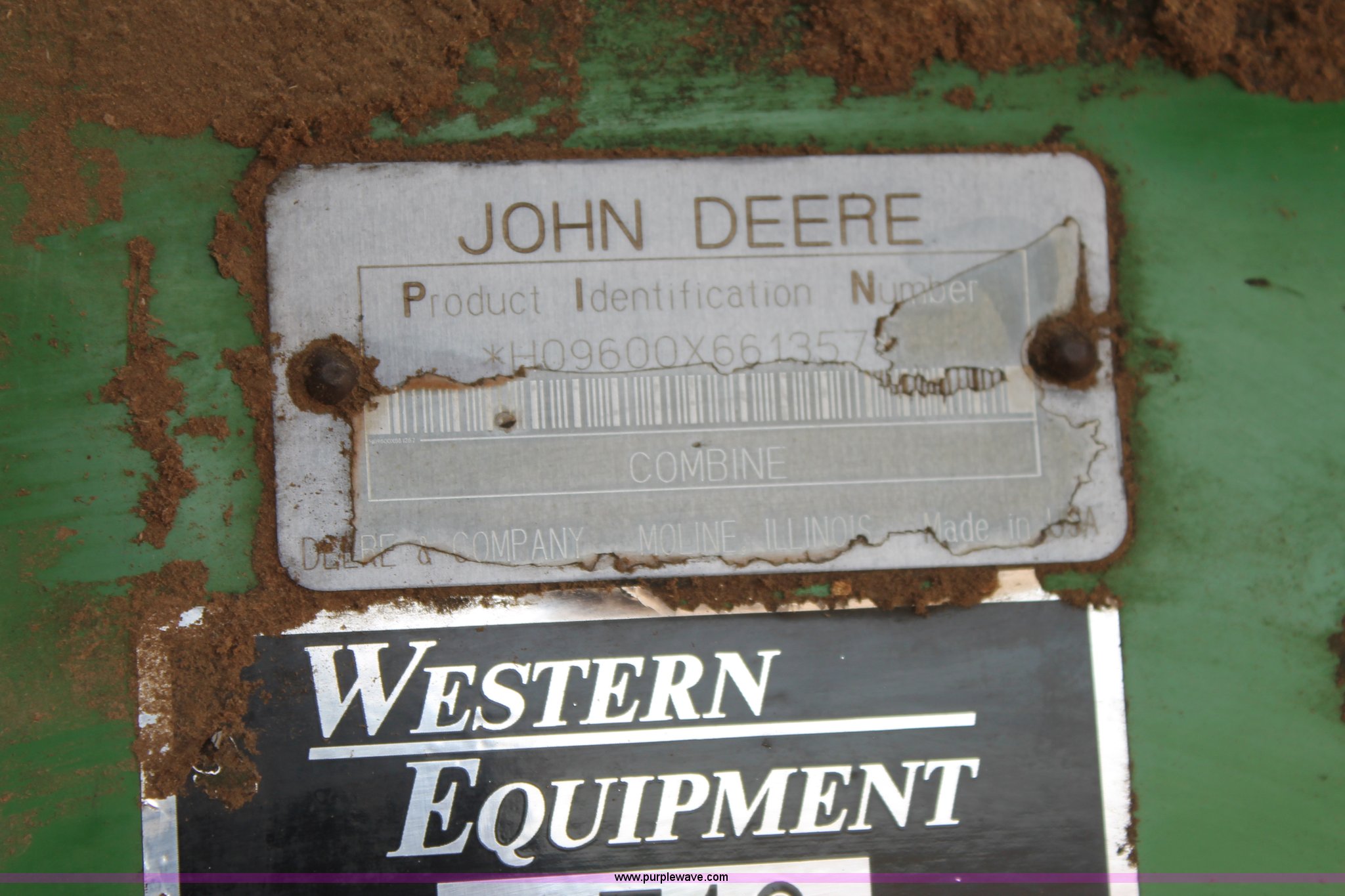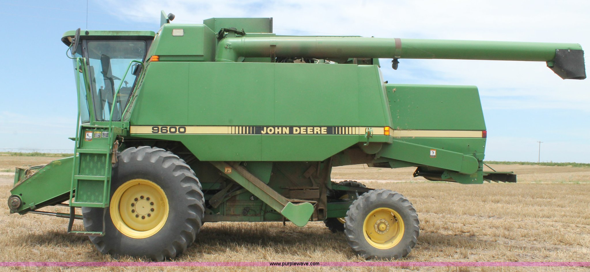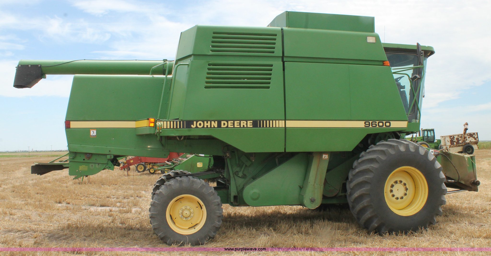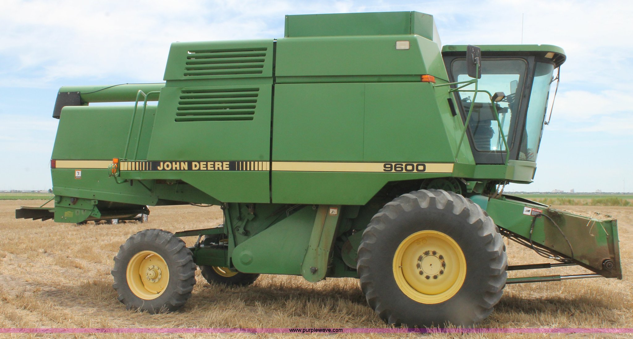 Purple Wave is selling a used Combine in Texas. This item is a 1995 John Deere 9600 combine with the following: John Deere six cylinder turbo diesel engine, 300 HP, Hydrostatic transmission, 3F-3R gears, AC and heat, AM/FM/cassette, Suspension seat, Instructor's seat, Chaff spreader, Straw chopper, 250 bu. grain bin, 21' unloading auger, 30.5-32 front tires, 14.9-24 rear tires, Serial H09600X661357