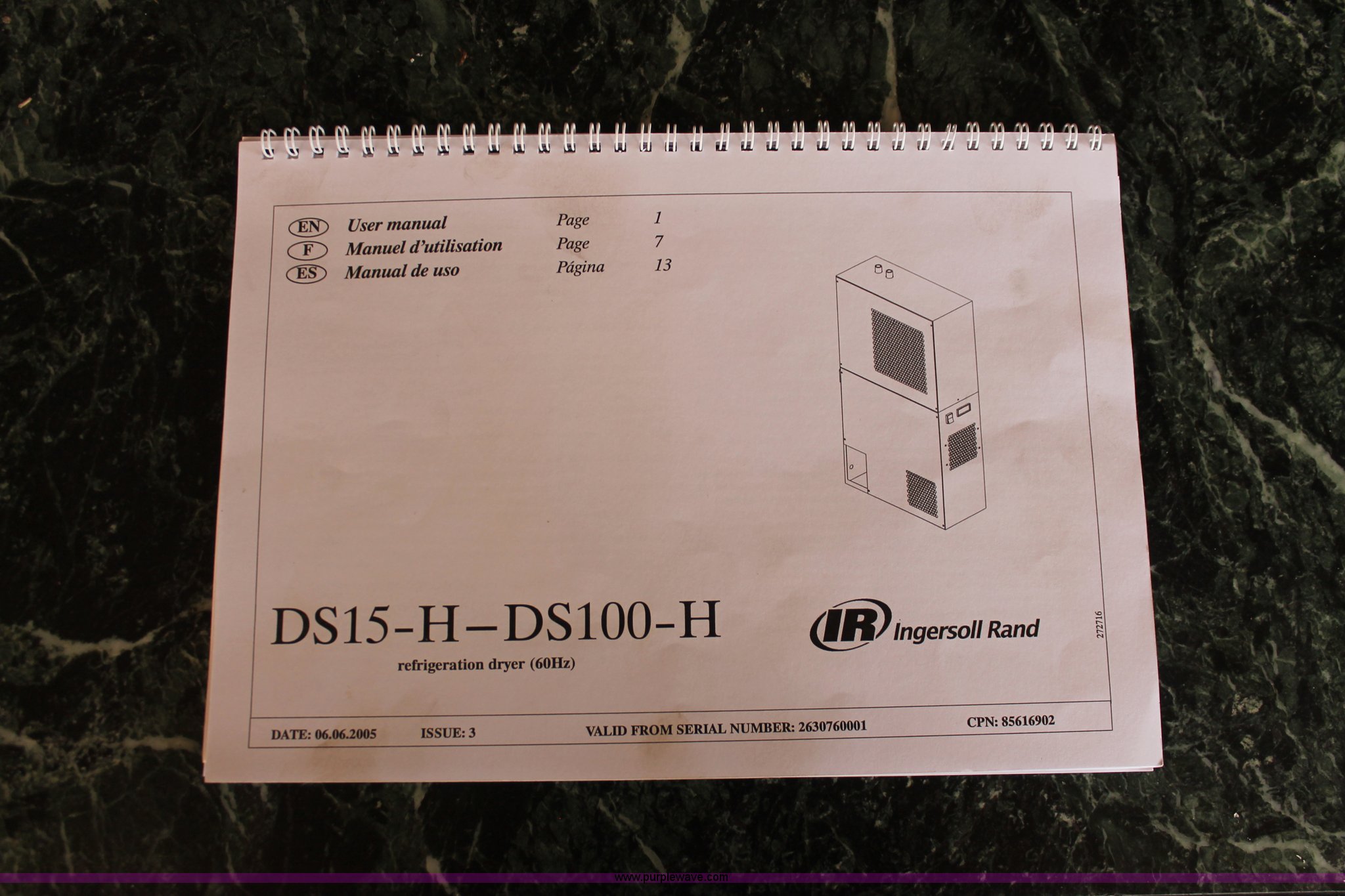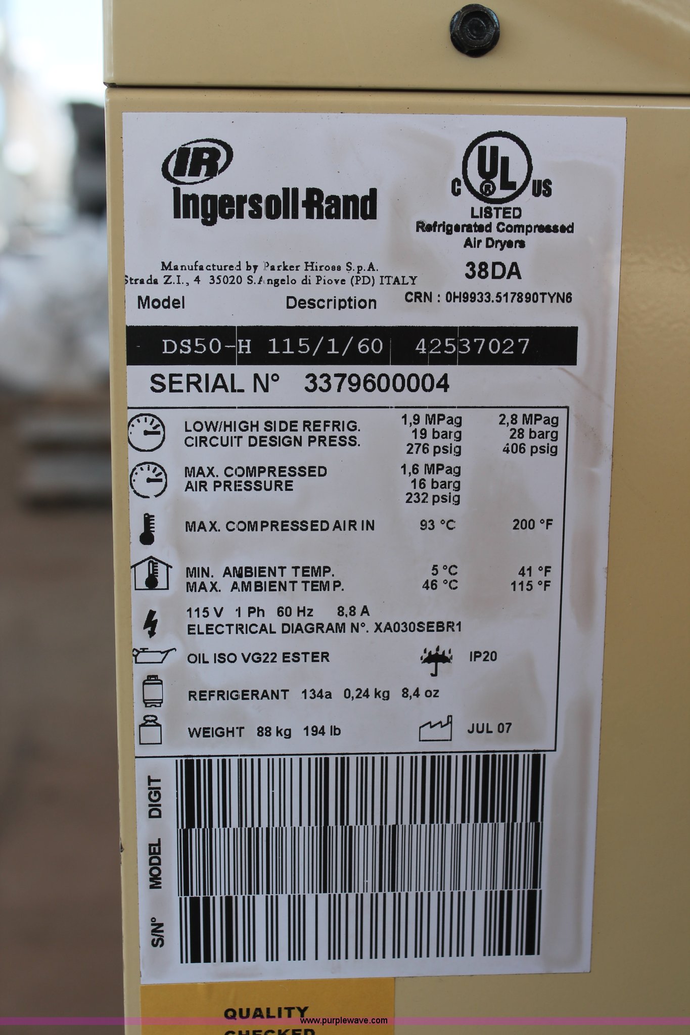 Purple Wave is selling a used Tools in Oklahoma. This item is a Ingersoll Rand DS50-H DryStar refrigerated air dryer with the following: 115V, Single phase, 50 cfm, Unused, new in box, Serial 3379600004