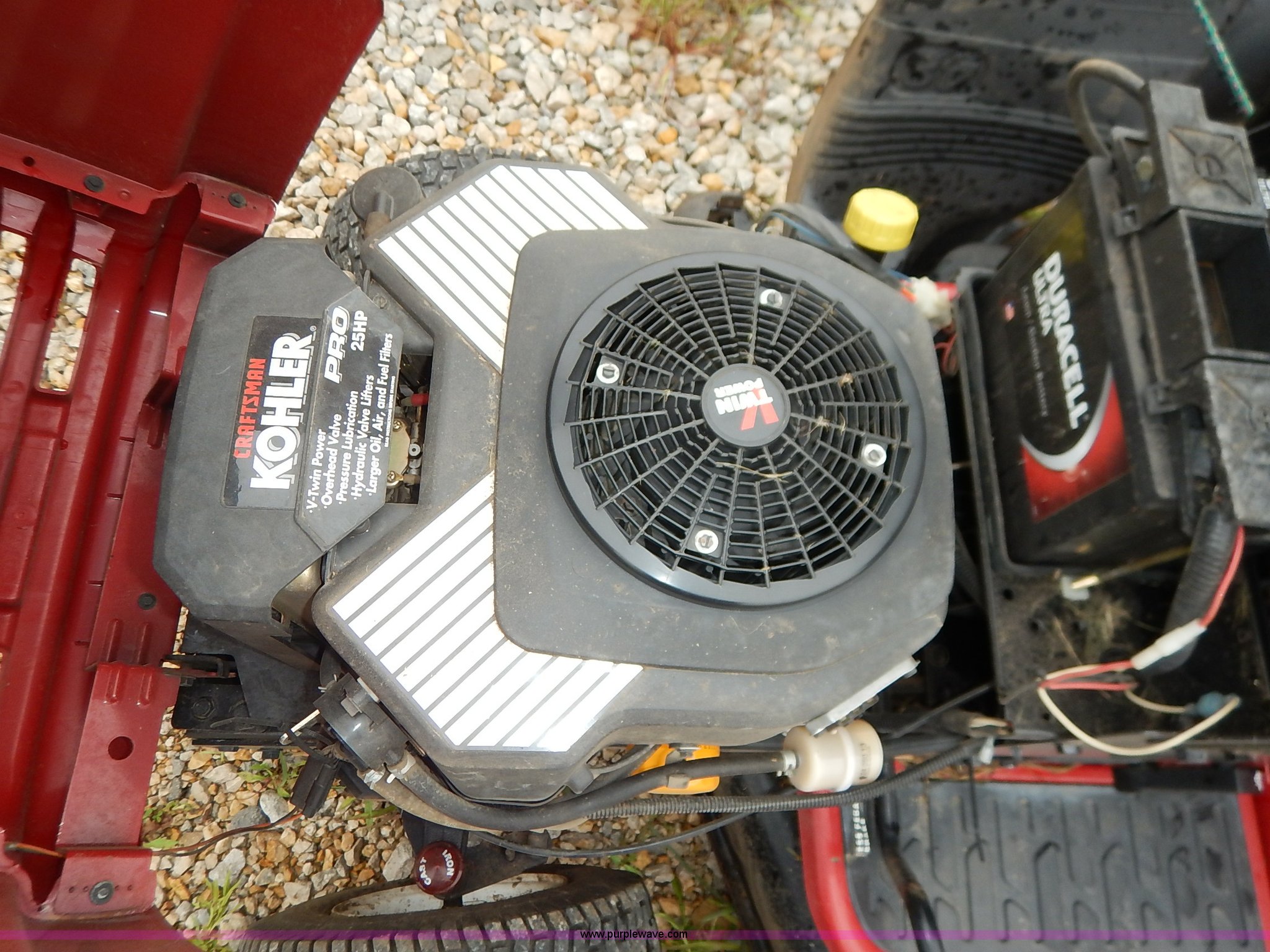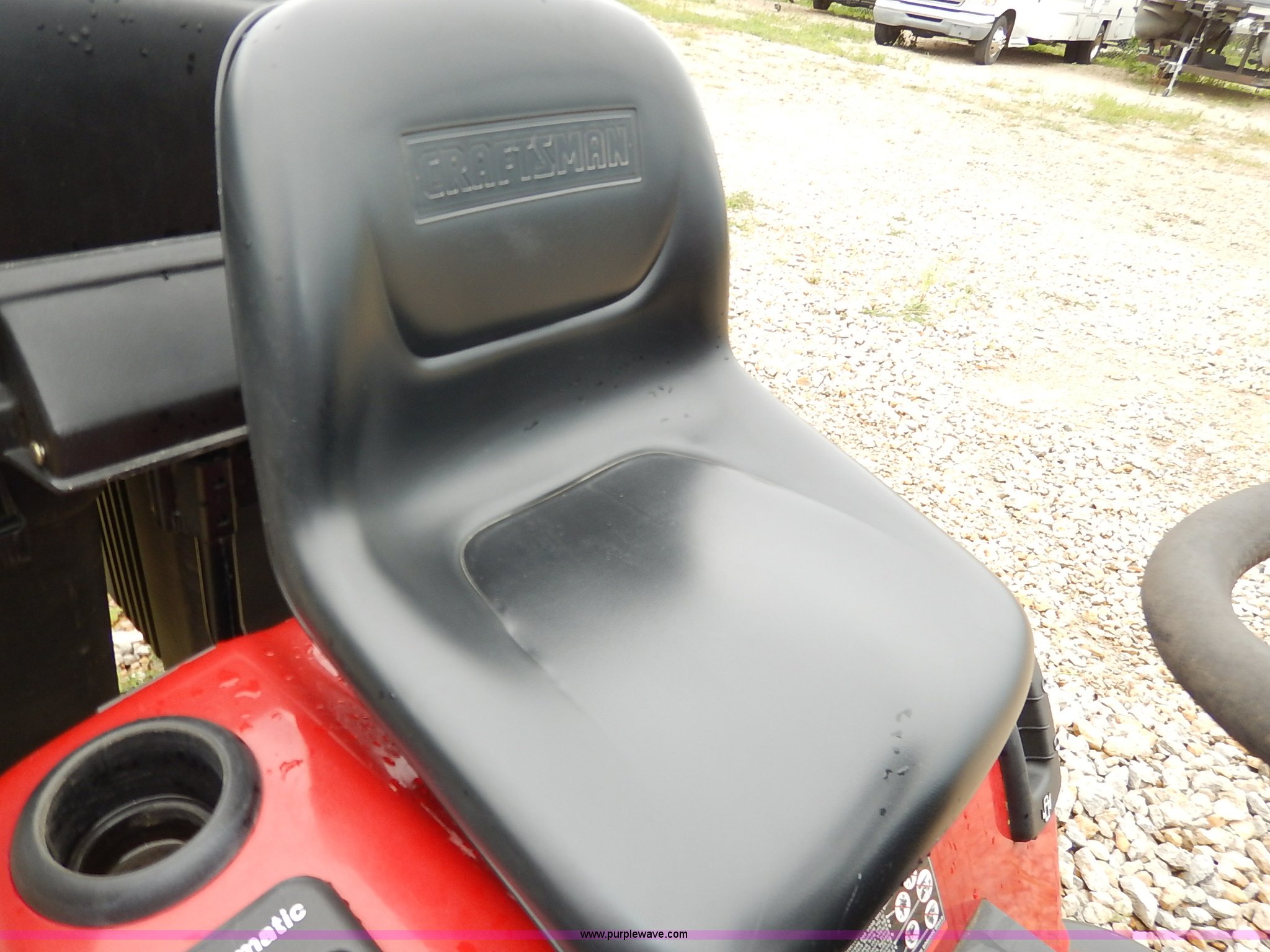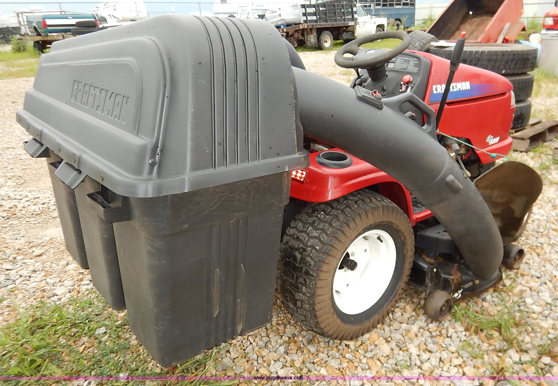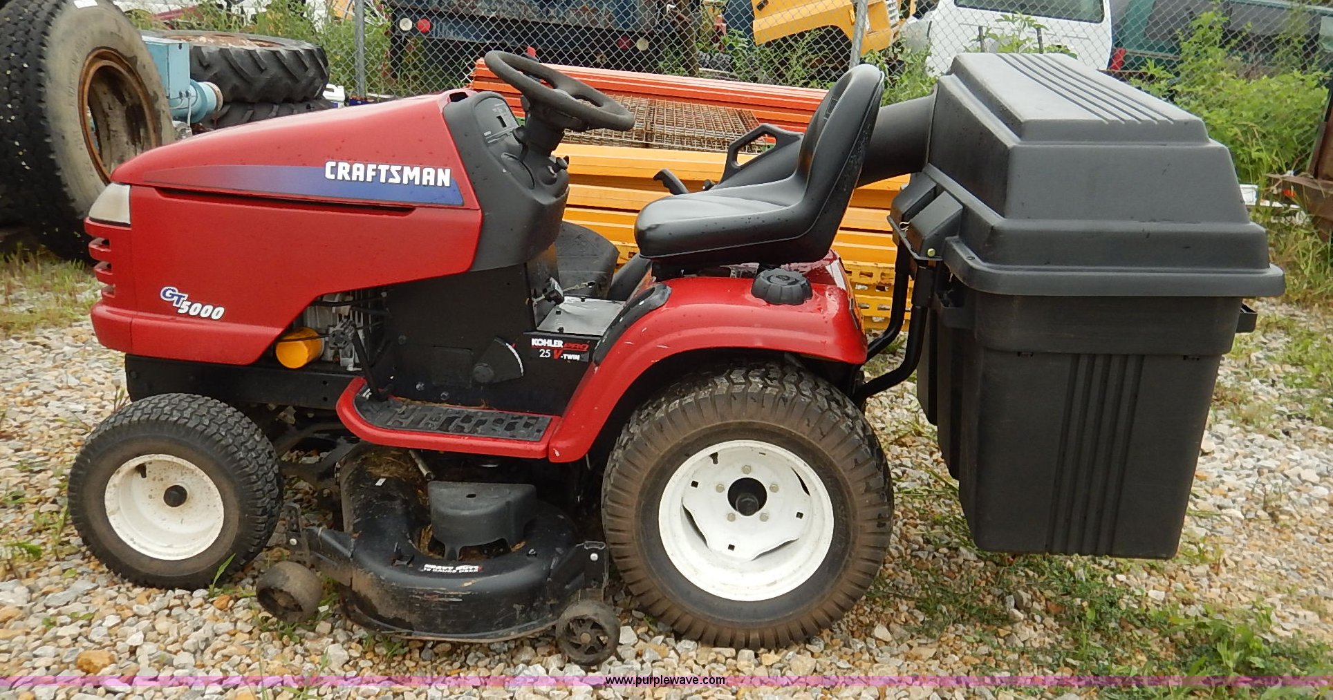 Purple Wave is selling a used Lawn Mower in Kansas. This item is a Craftsman GT5000 riding mower with bagger with the following: 48" cutting capacity, Kohler Pro 25 V-twin gas engine, Automatic transmission, Vinyl seat, Front lights, 16 x 6.50-8 front tires, 23 x 10.50-12 rear tires, Serial 022404B001808