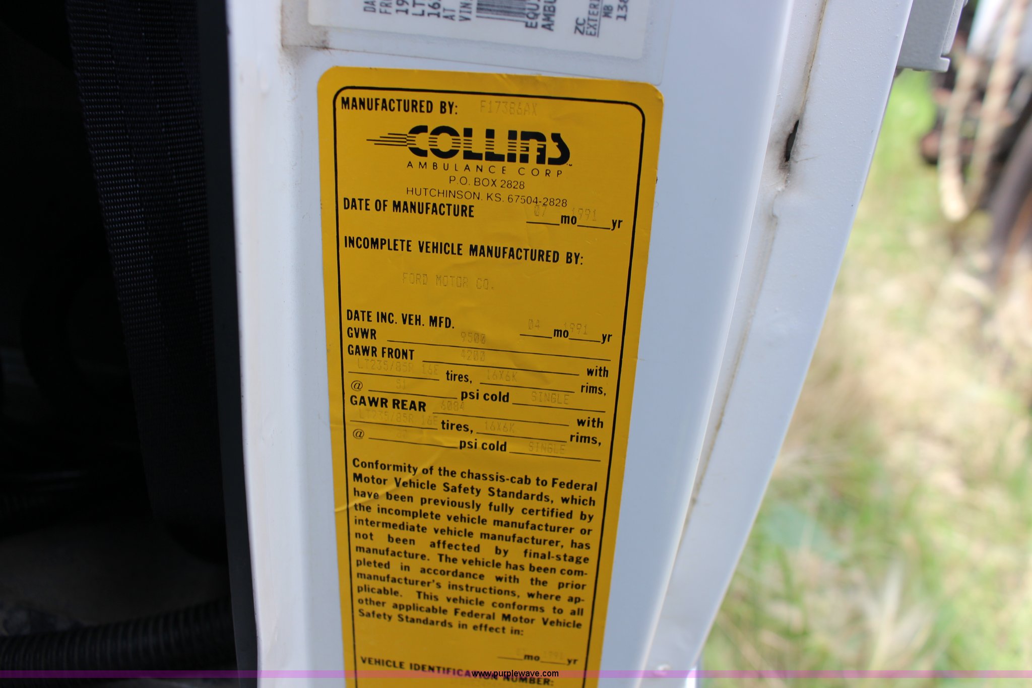 1991 Ford Econoline E350 ambulance. 73,754 miles on odometer, 7.3L V8 OHV 16V diesel engine, Automatic transmission, AC and heat, Tilt, Cruise, AM/FM/cassette, Manual windows and locks, Vinyl interior, Collins body, Lights and sirens, 245/75R16 tires, Interior/exterior cosmetic damage, Operational when parked one and a half years ago. 1FDJE34M4MHA79308. Morris County. Council Grove, KS 66846