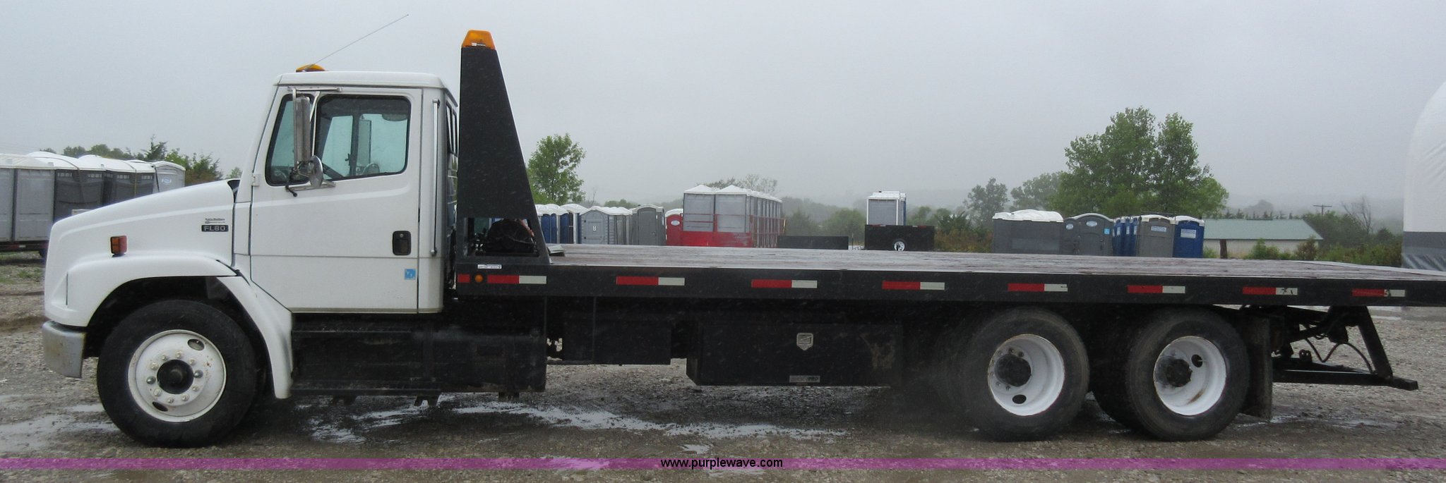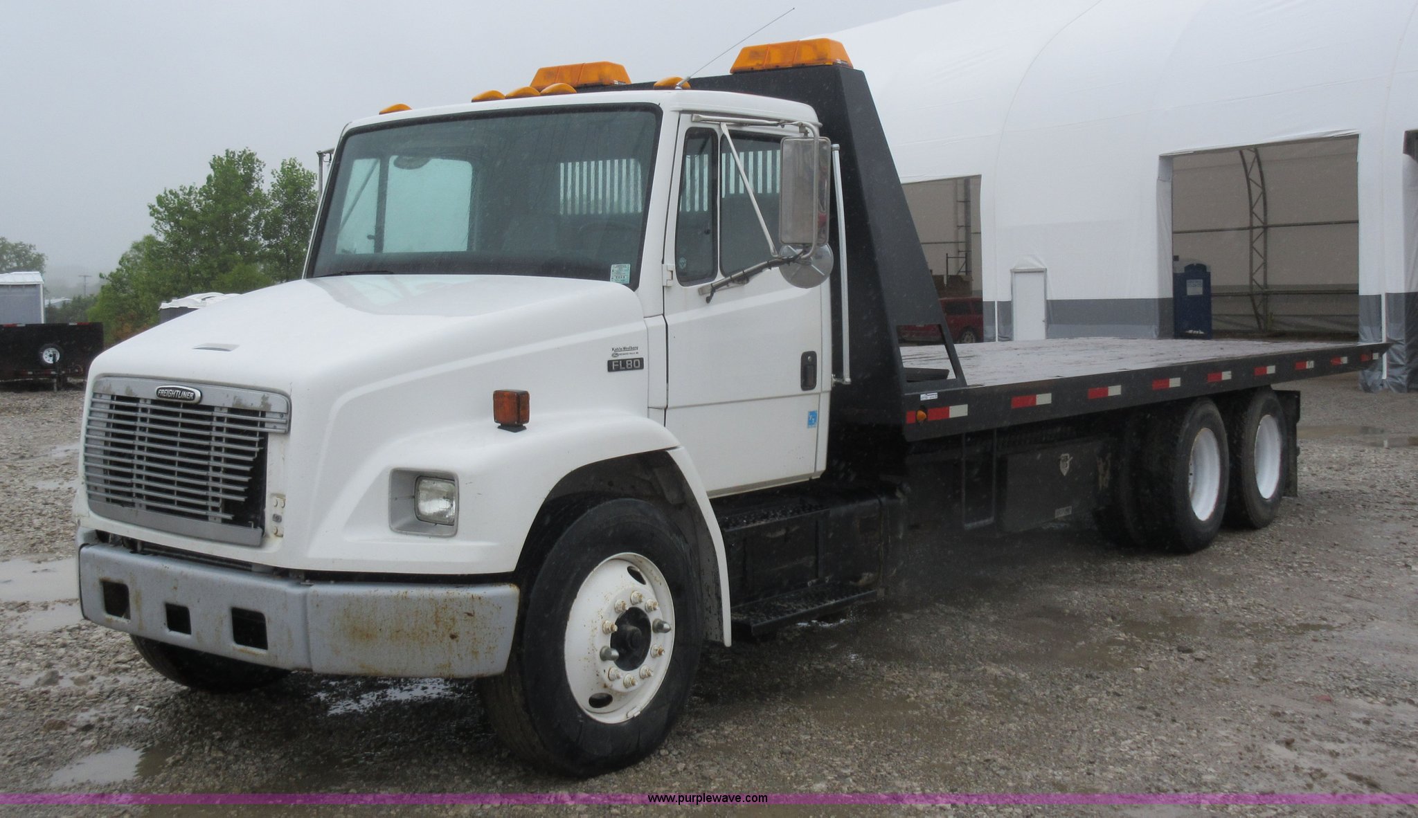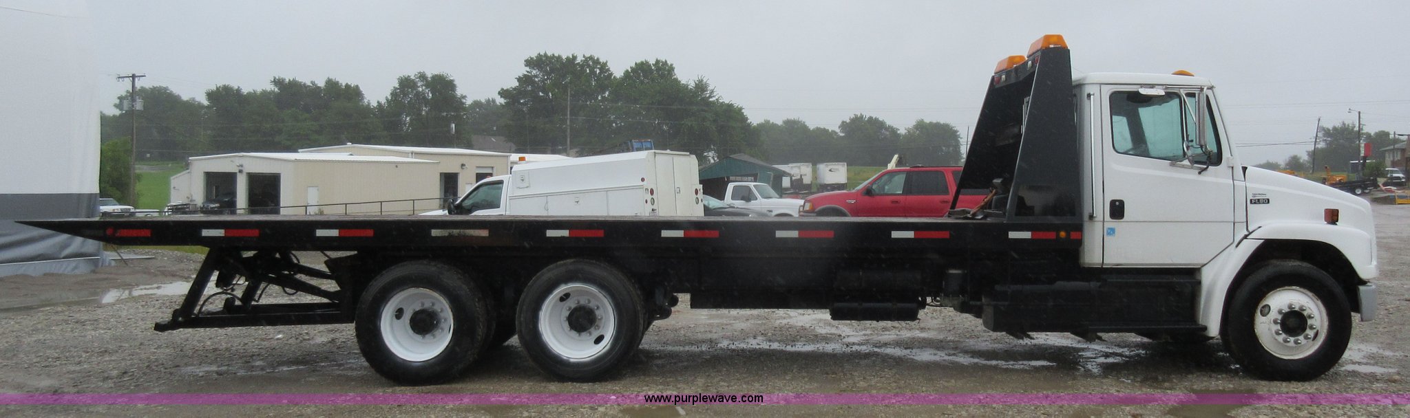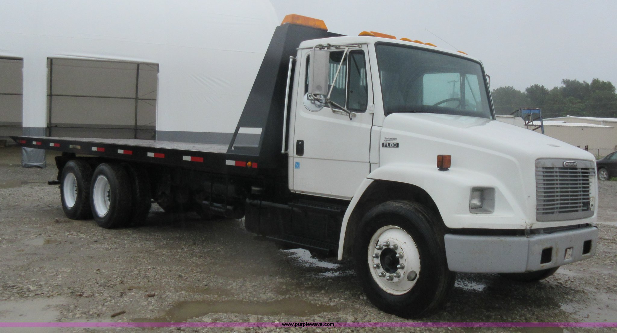 Purple Wave is selling a used Rollback or Tow Truck in Kansas. This item is a 2003 Freightliner FL80 roll back truck with the following: 290,741 miles on odometer, Caterpillar 3126 7.2L L6 diesel engine, Eaton Fuller nine speed manual transmission, AC and heat, Cruise, AM/FM/cassette, Power mirrors, Heated mirrors, PTO, 26'L x 102"W rollback bed, Winch, Dual fuel tanks, Air suspension, Air brakes, 295/75R22.5 tires, GVWR 53,880 lbs, FAWR 13,880 lbs, IAWR 20,000 lbs, RAWR 20,000 lbs