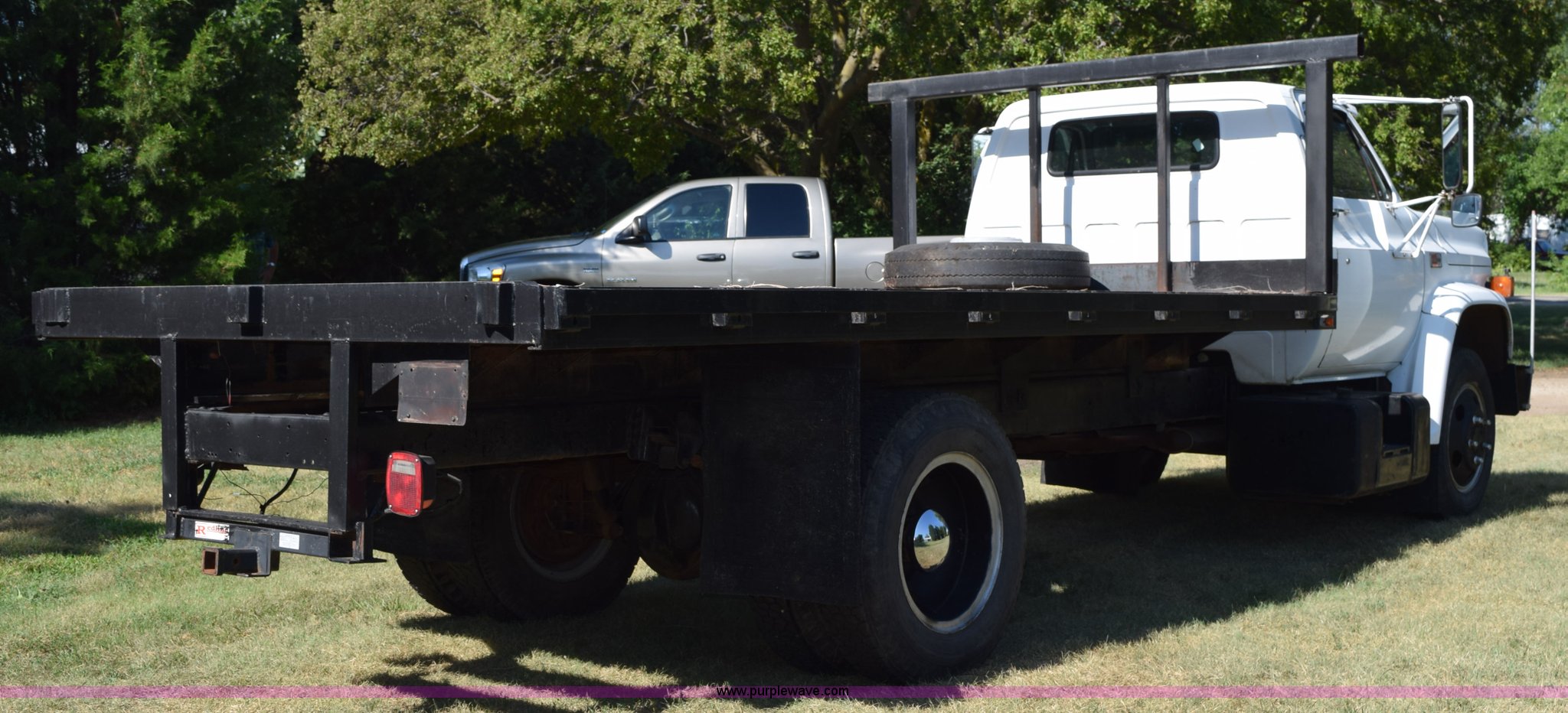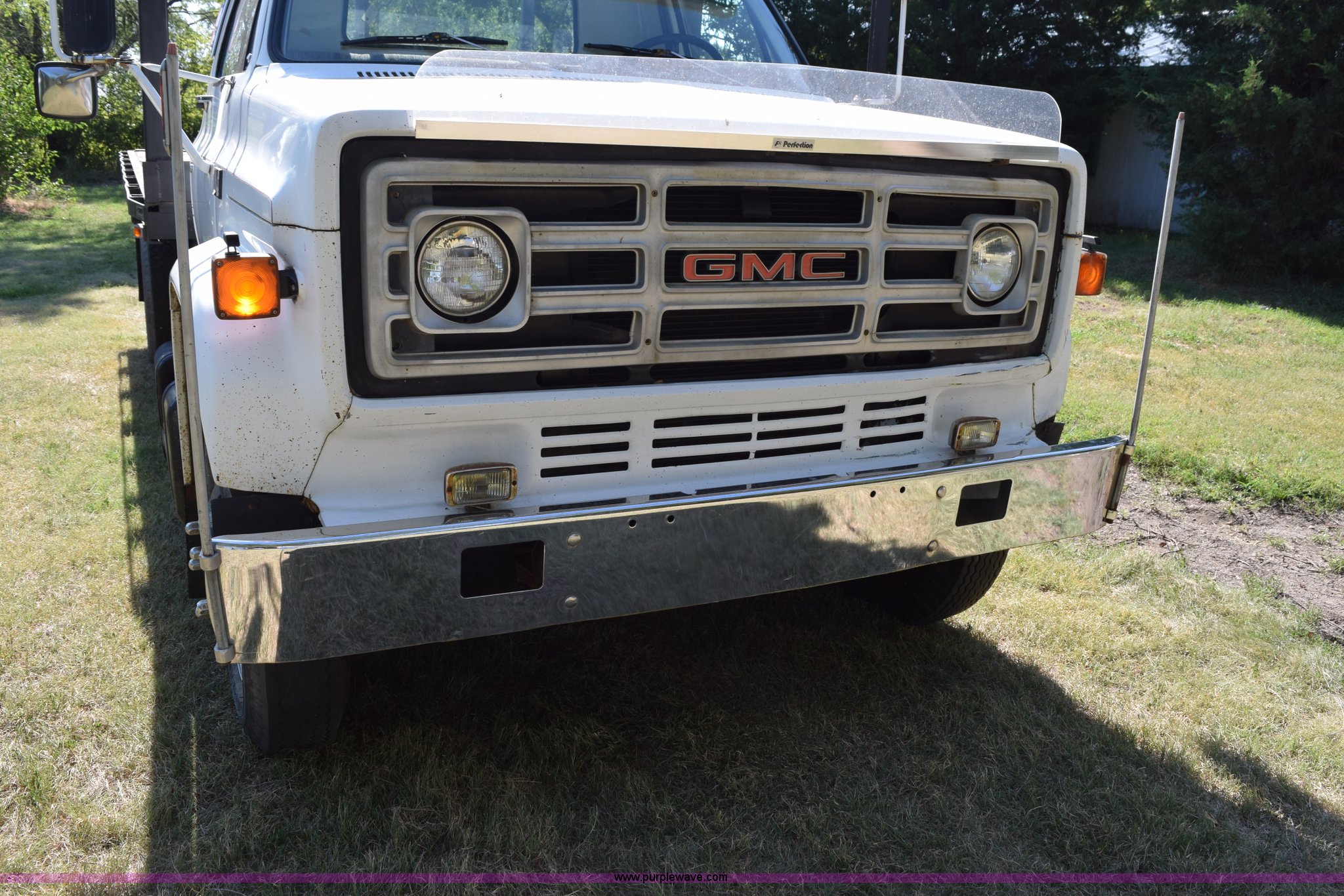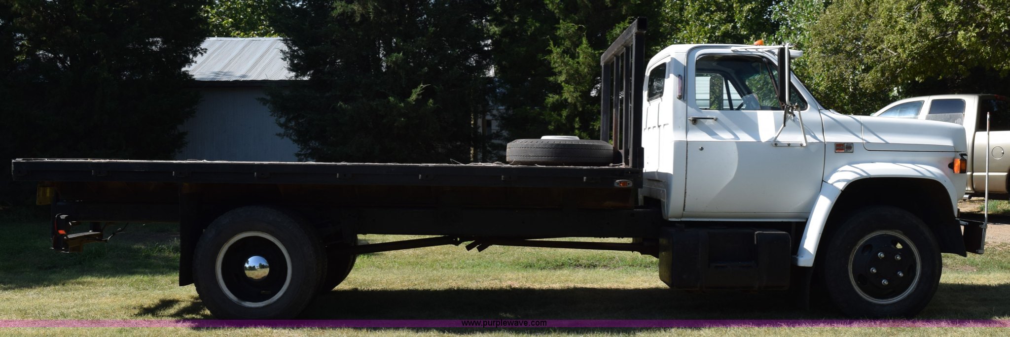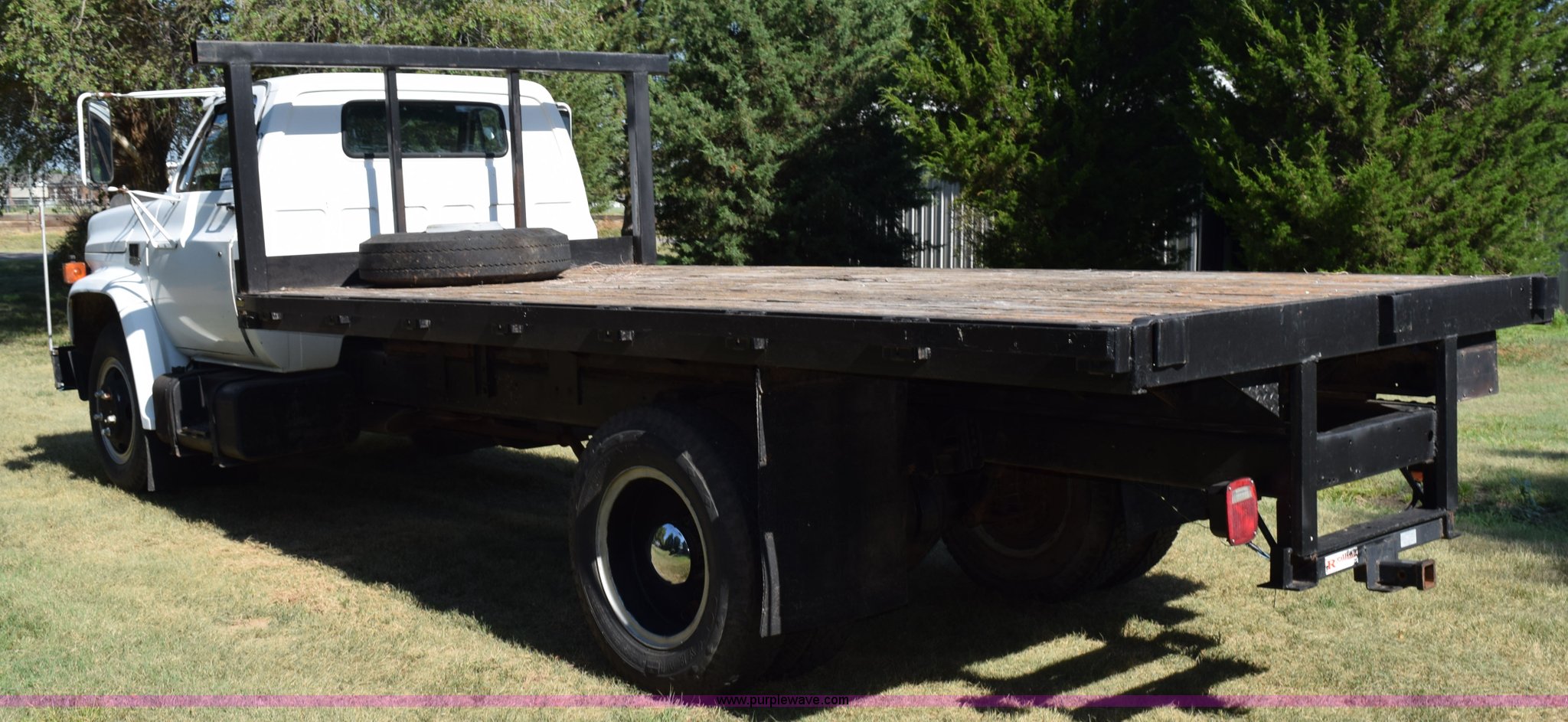 Purple Wave is selling a used Flat Bed Truck in Kansas. This item is a 1987 GMC 6000 flatbed truck with the following: 280,324 miles on odometer, Actual miles unknown, GMC eight cylinder gas engine, 4 speed manual transmission, 2 speed rear end, Single axle, AC and heat, AC disconnected, AM/FM, Spring suspension seat, 15"L x 8"W flatbed, Receiver hitch, Dual fuel tanks, Spring suspension, Hydraulic brakes, 8.25-20 front tires