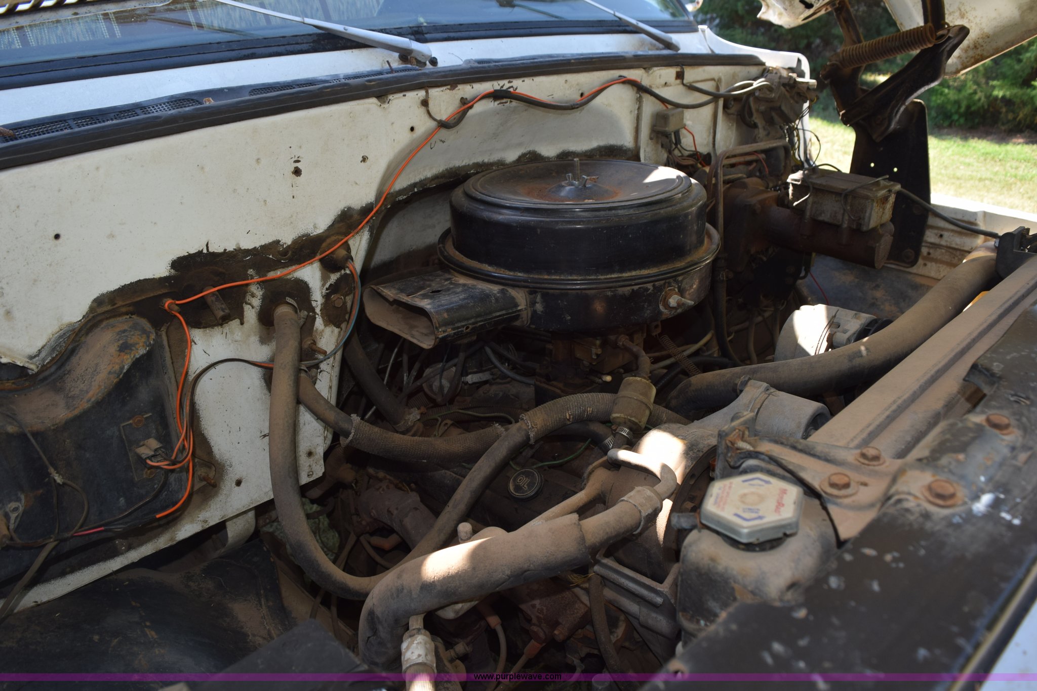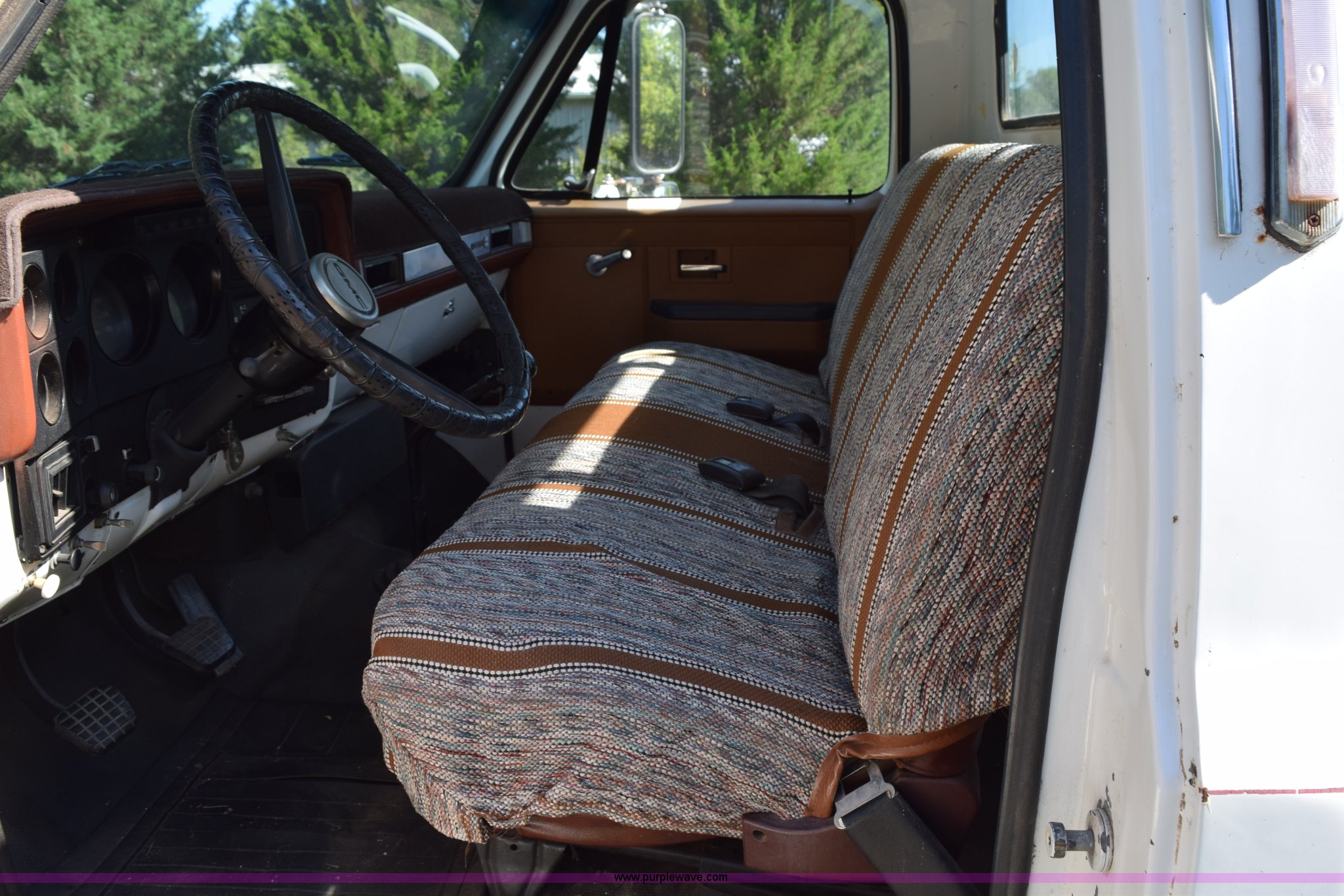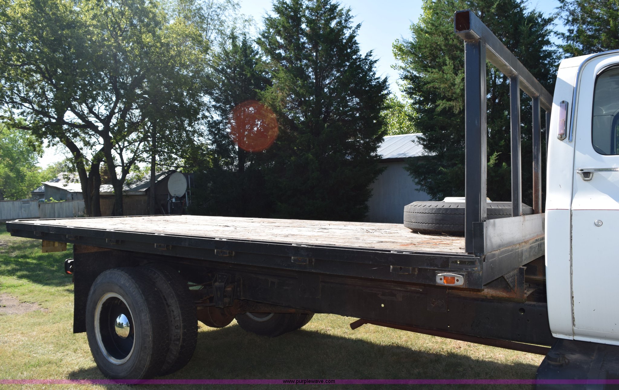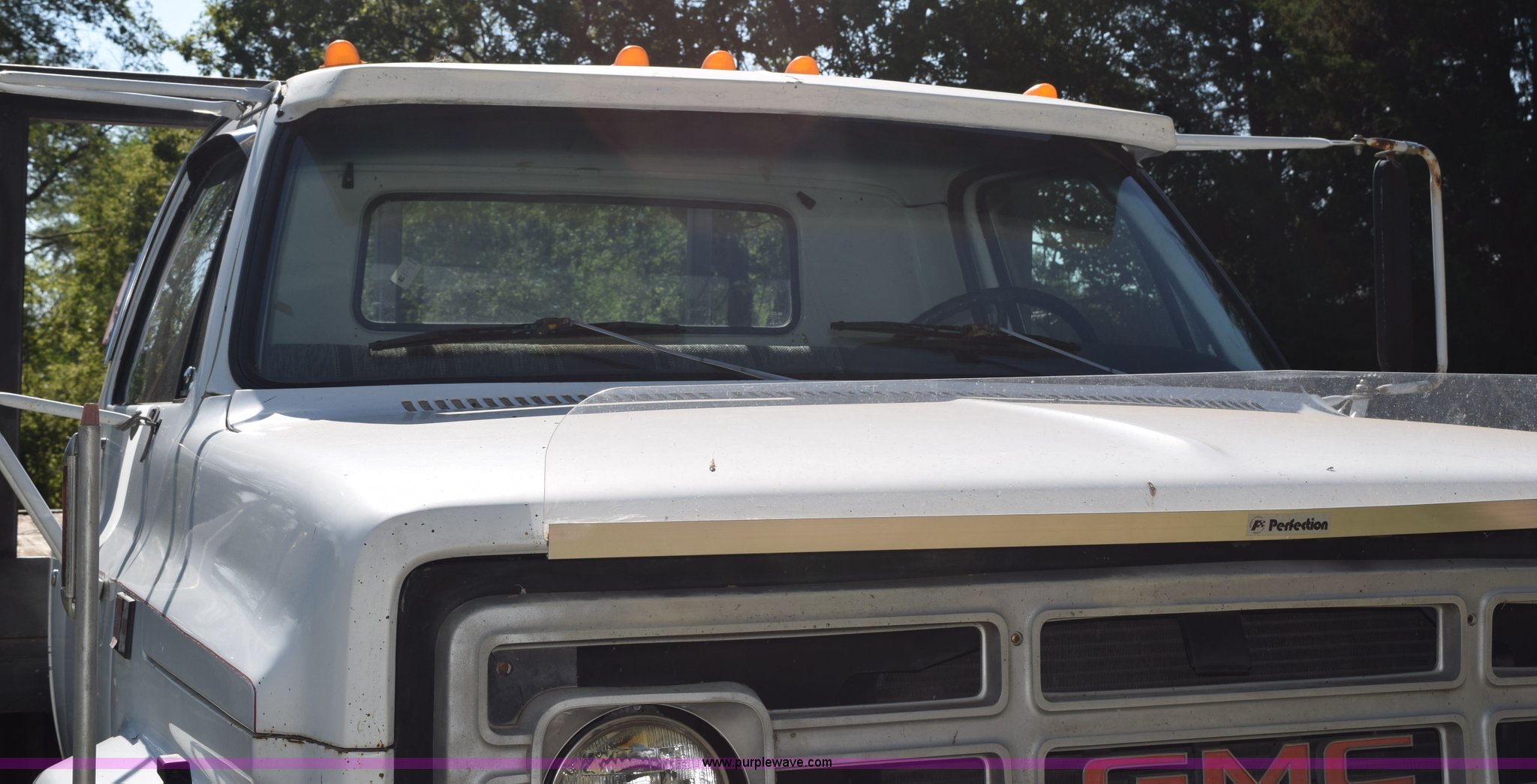 Purple Wave is selling a used Flat Bed Truck in Kansas. This item is a 1987 GMC 6000 flatbed truck with the following: 280,324 miles on odometer, Actual miles unknown, GMC eight cylinder gas engine, 4 speed manual transmission, 2 speed rear end, Single axle, AC and heat, AC disconnected, AM/FM, Spring suspension seat, 15"L x 8"W flatbed, Receiver hitch, Dual fuel tanks, Spring suspension, Hydraulic brakes, 8.25-20 front tires