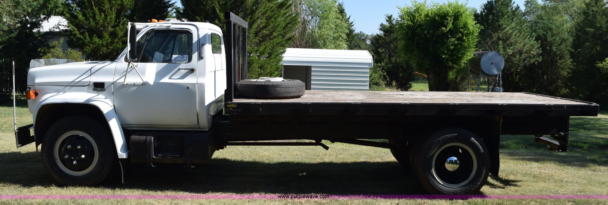 This 1987 GMC 6000 flatbed truck will sell to the highest bidder regardless of price.