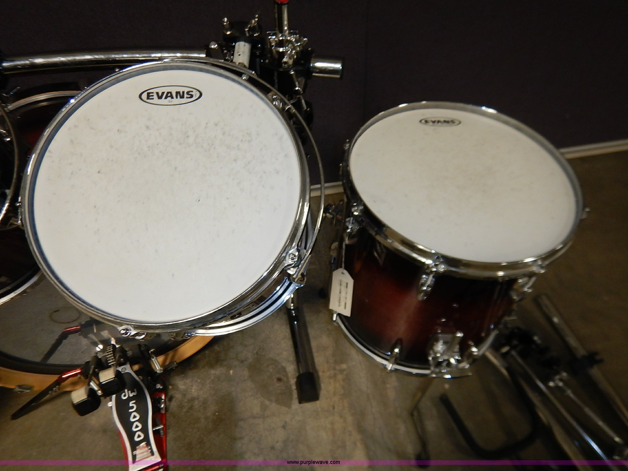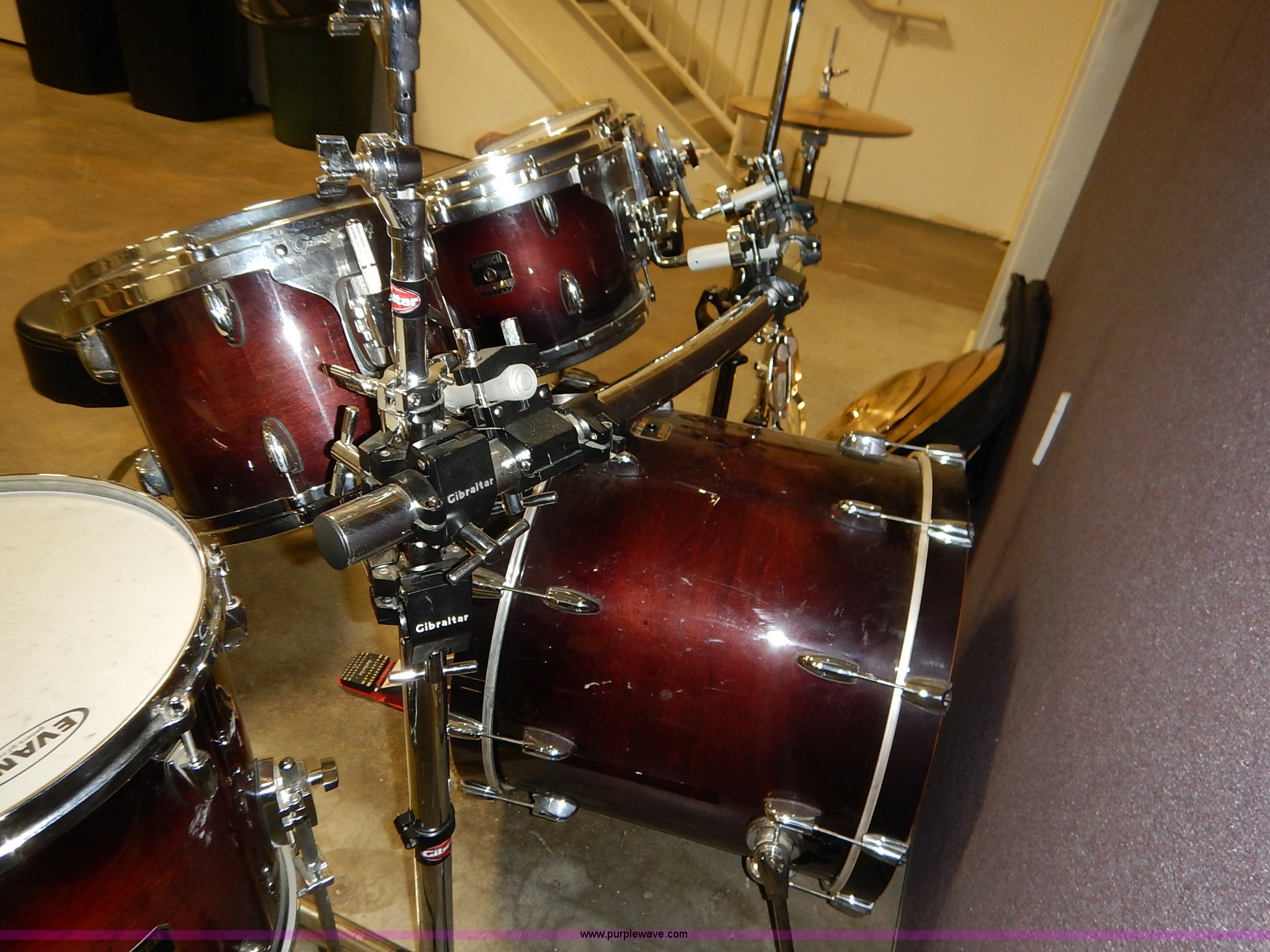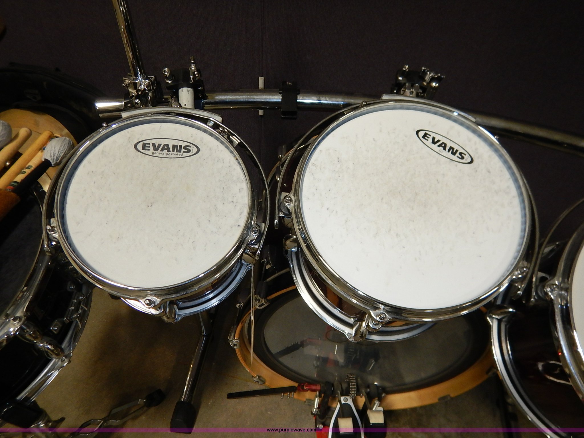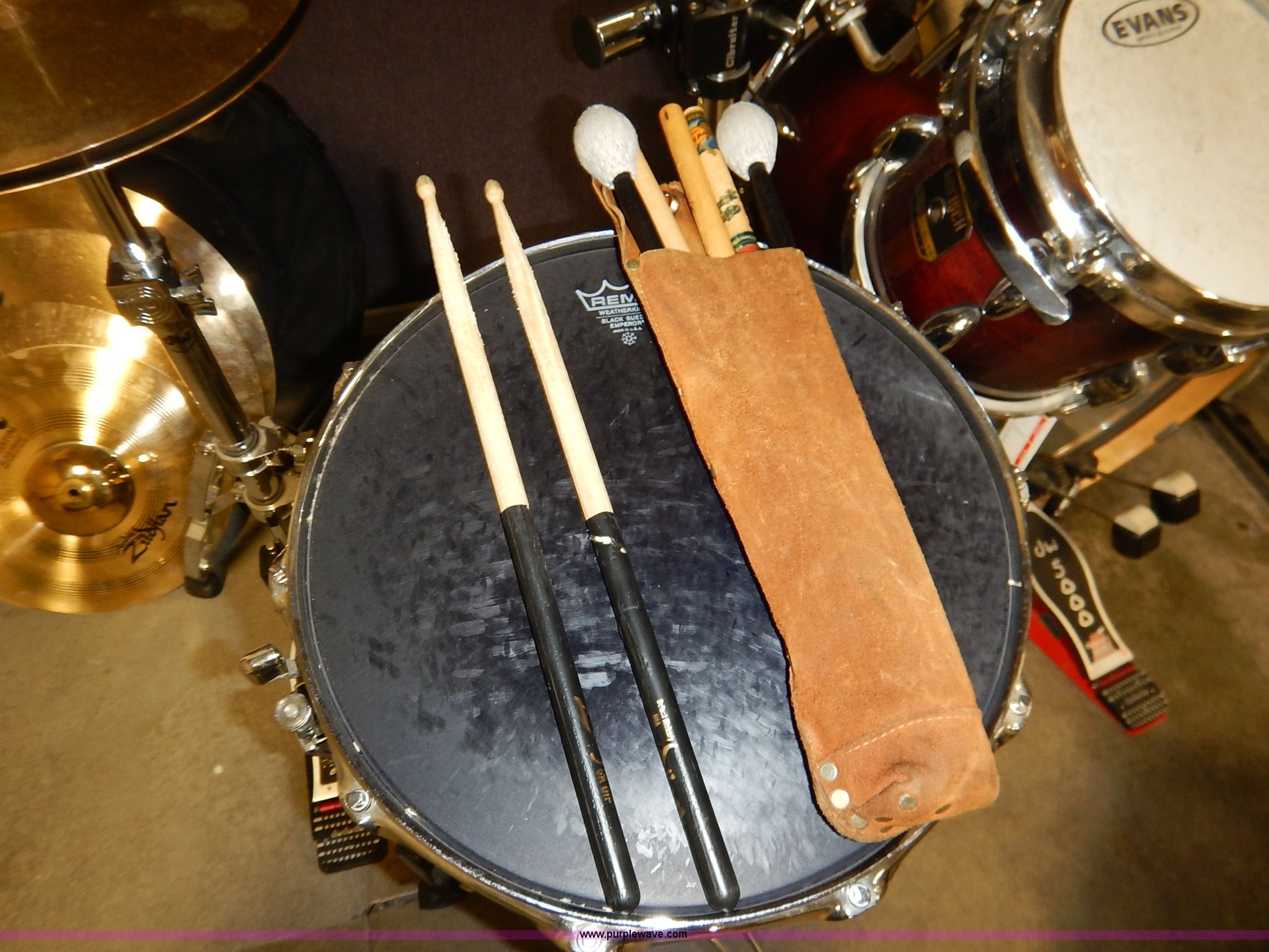 Purple Wave is selling a used Music Equip. in Kansas. This item is a Drum set with the following: (5) Evans drums, Remo drum, (7) drumsticks, First chair seat, (7) Zildjan cymbals, (4) 14", 16", 18", 22", Additional frame bars and accessories
