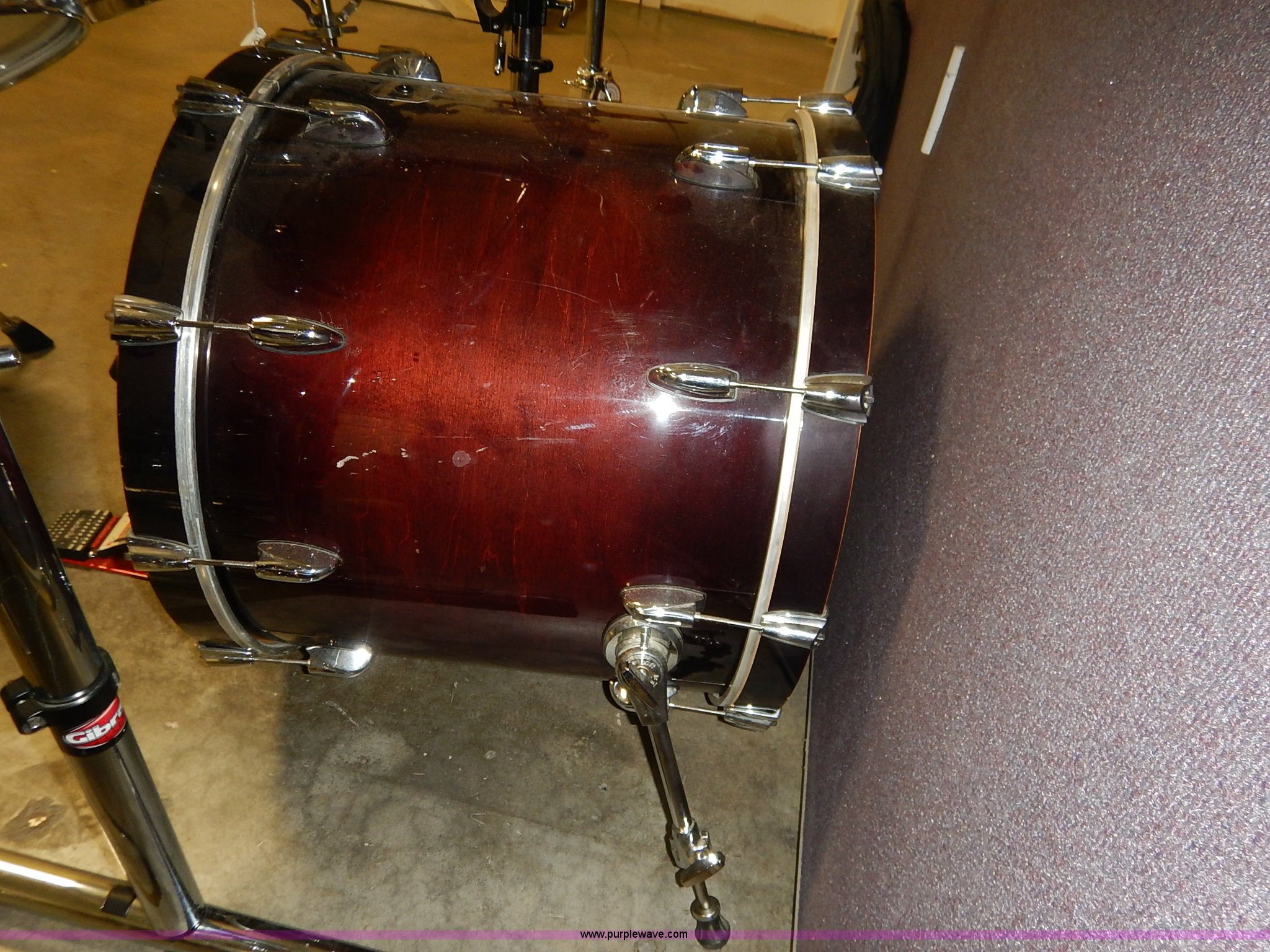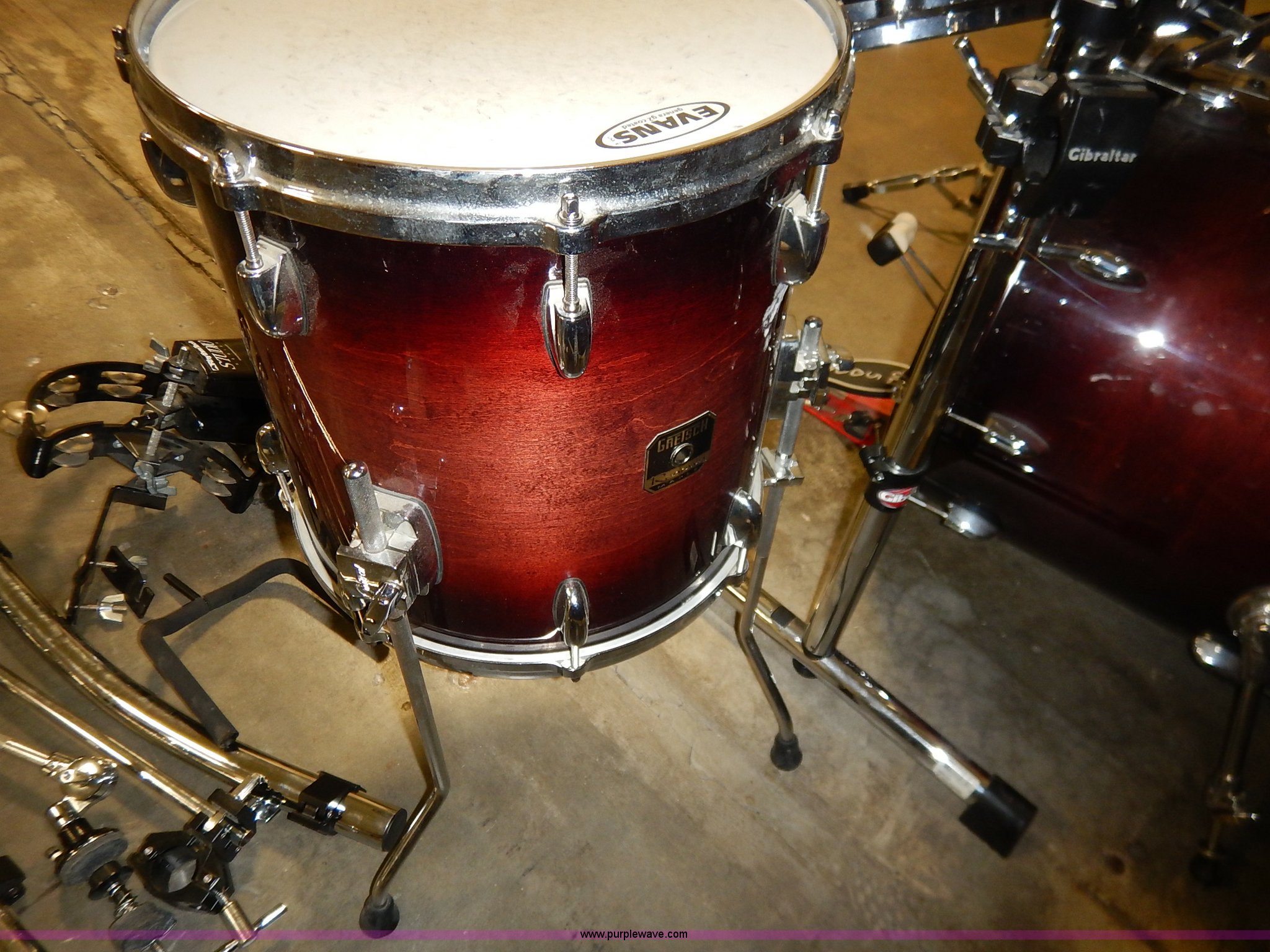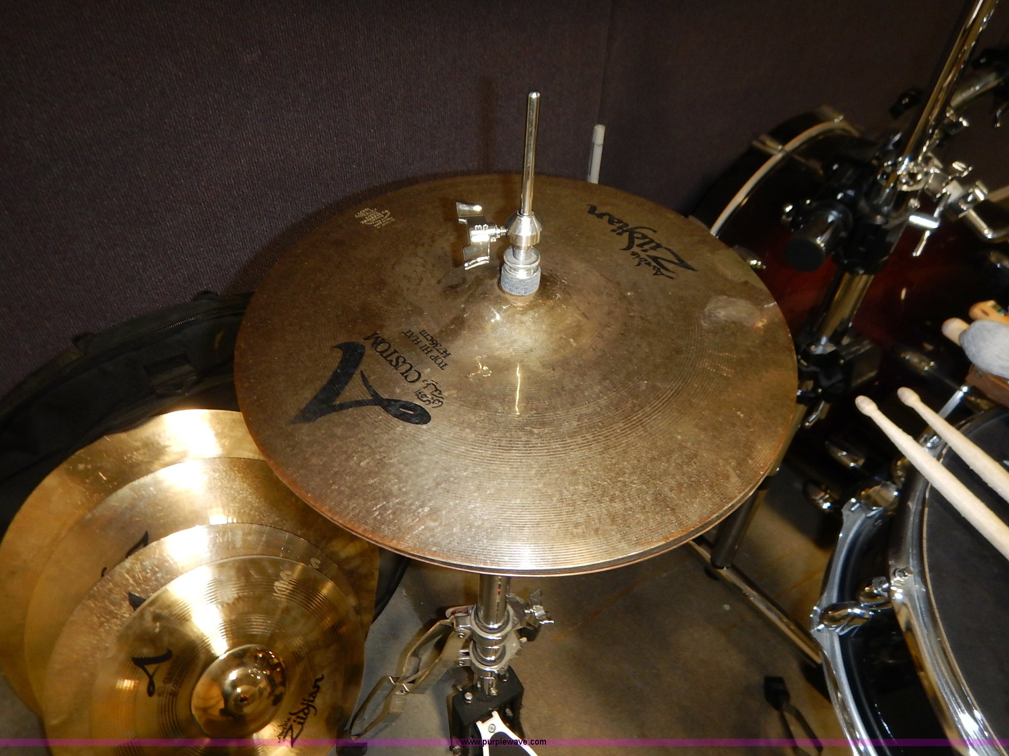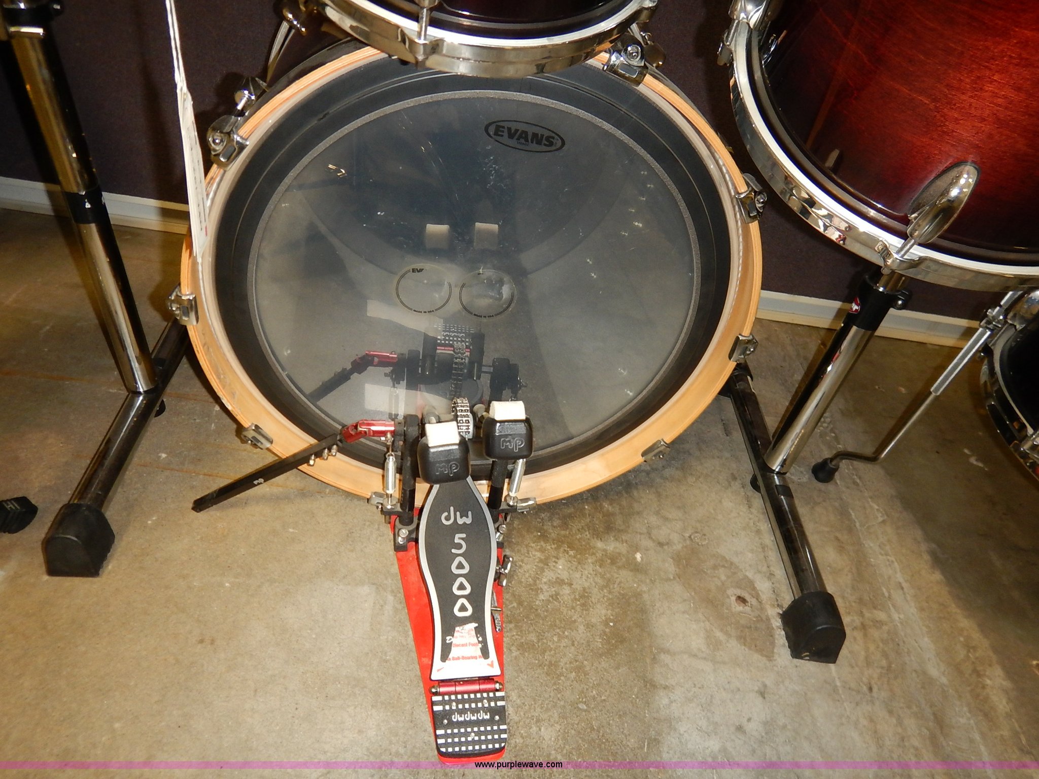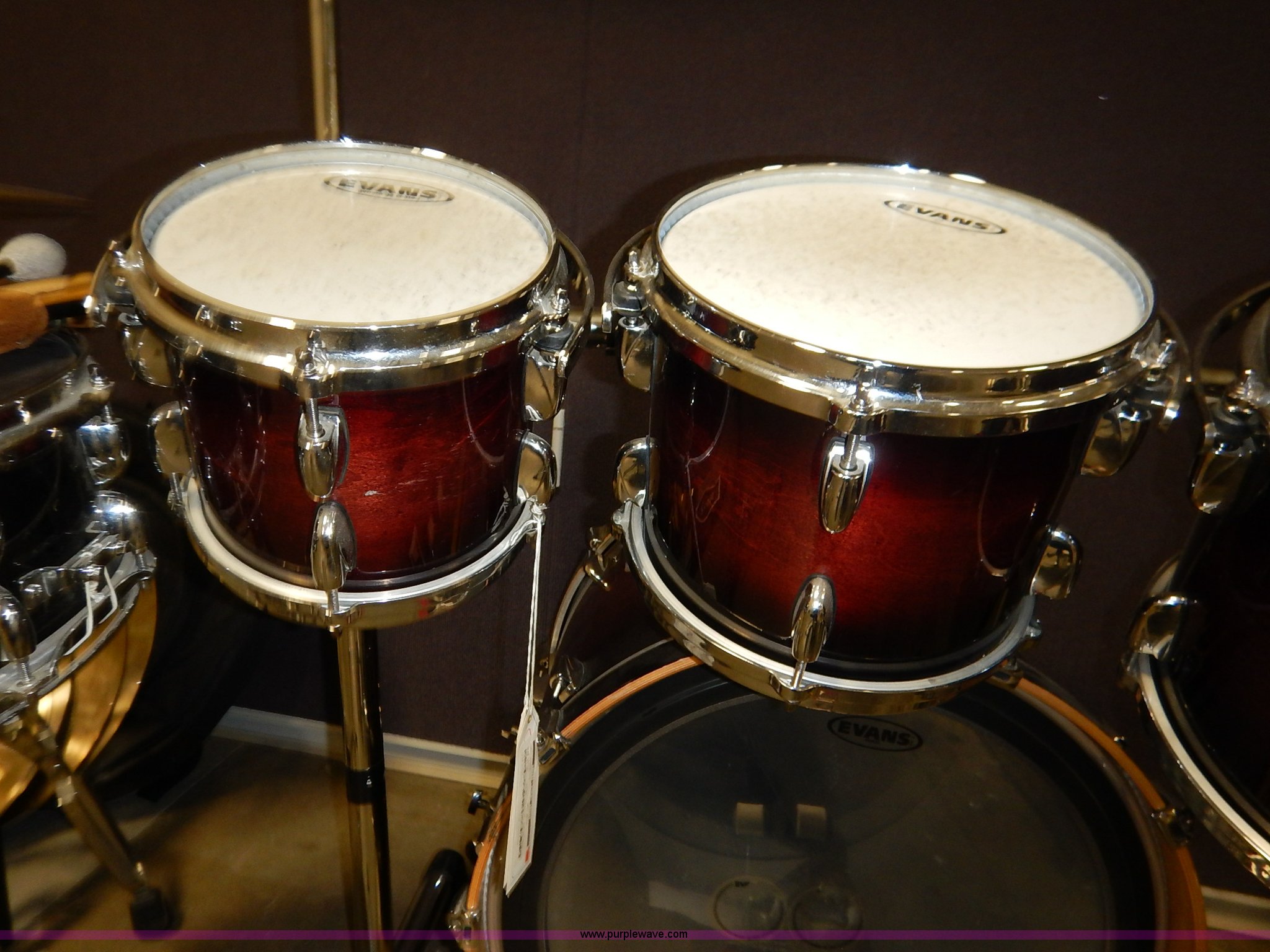 Purple Wave is selling a used Music Equip. in Kansas. This item is a Drum set with the following: (5) Evans drums, Remo drum, (7) drumsticks, First chair seat, (7) Zildjan cymbals, (4) 14", 16", 18", 22", Additional frame bars and accessories