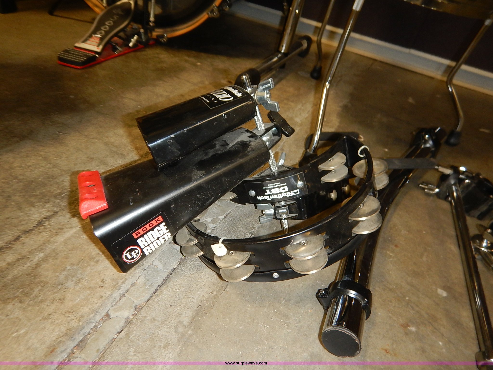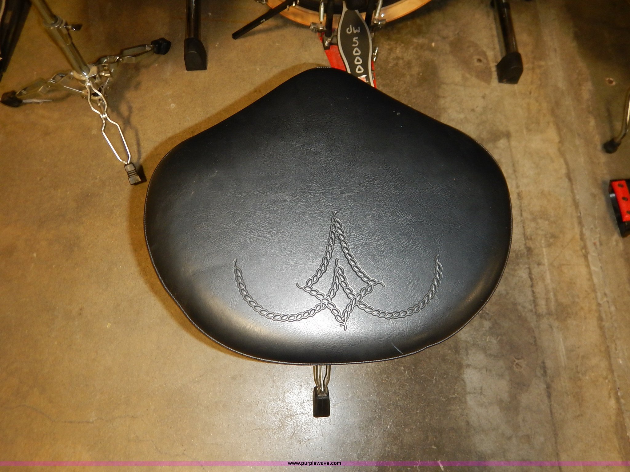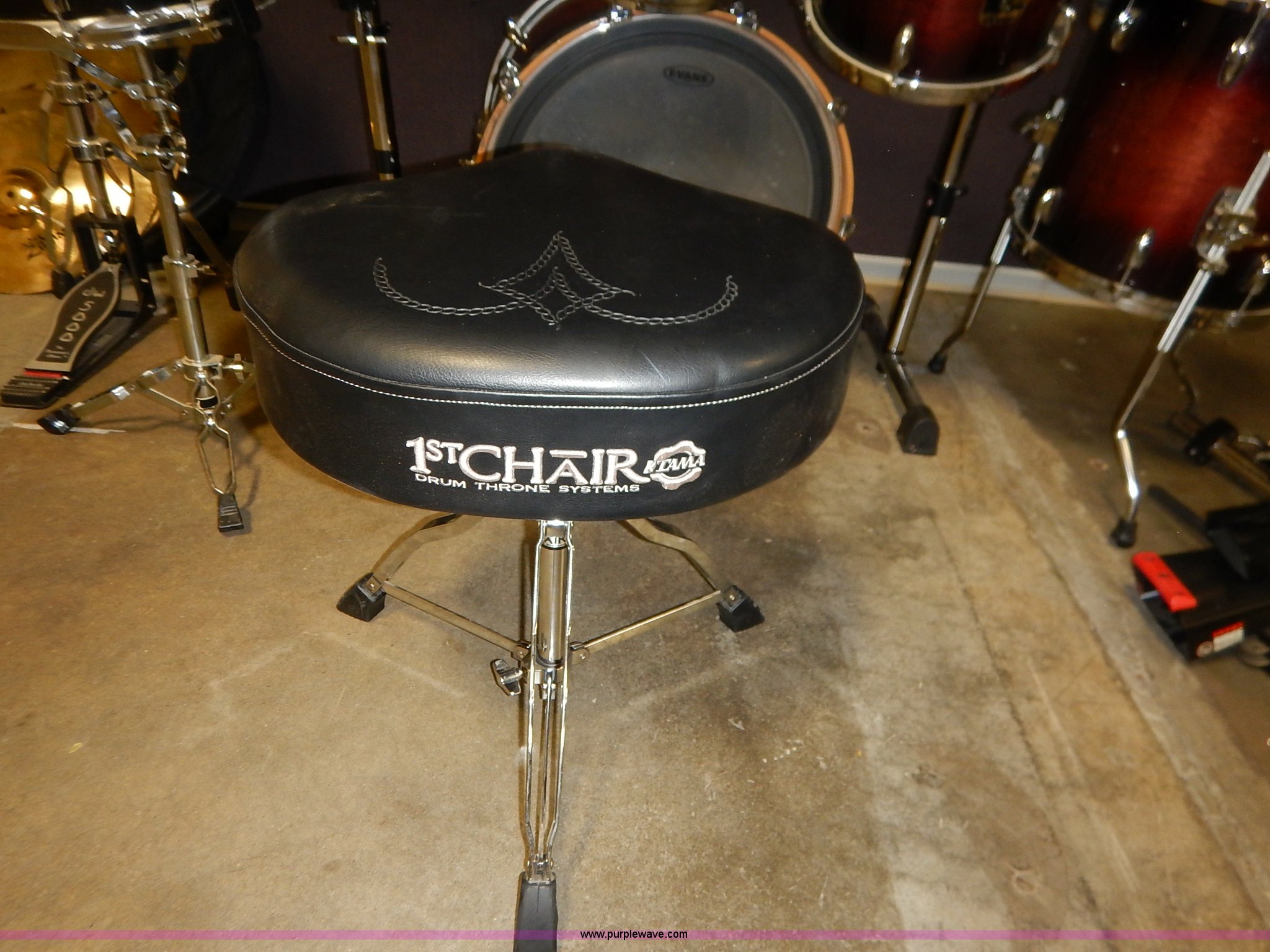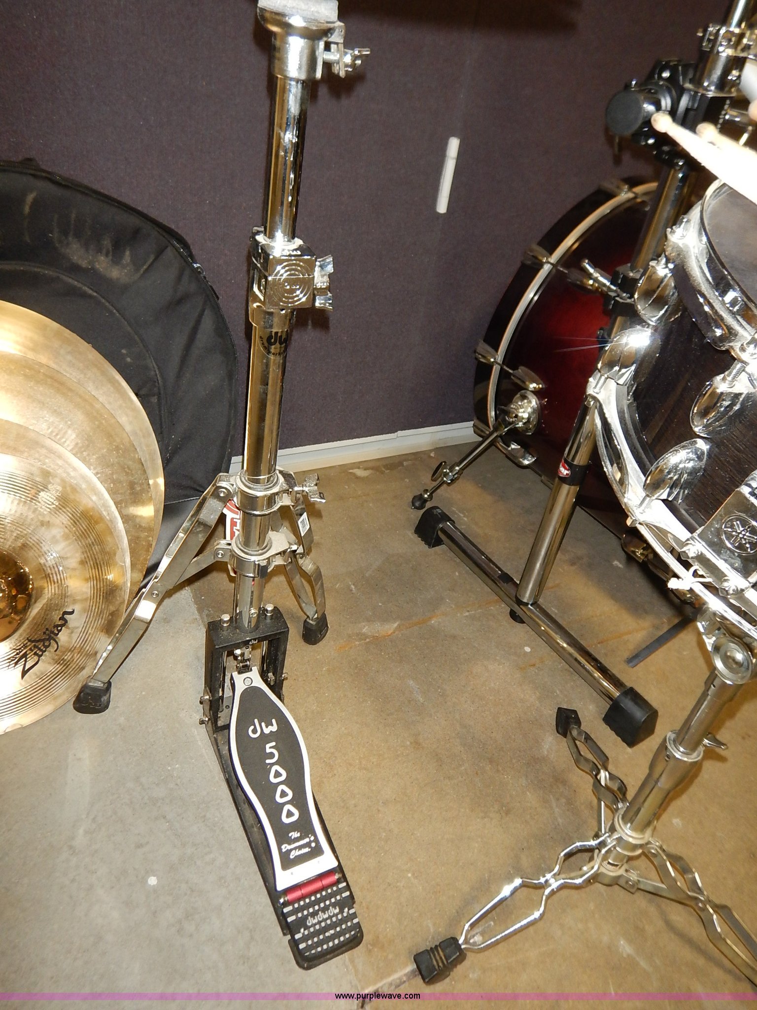 Purple Wave is selling a used Music Equip. in Kansas. This item is a Drum set with the following: (5) Evans drums, Remo drum, (7) drumsticks, First chair seat, (7) Zildjan cymbals, (4) 14", 16", 18", 22", Additional frame bars and accessories