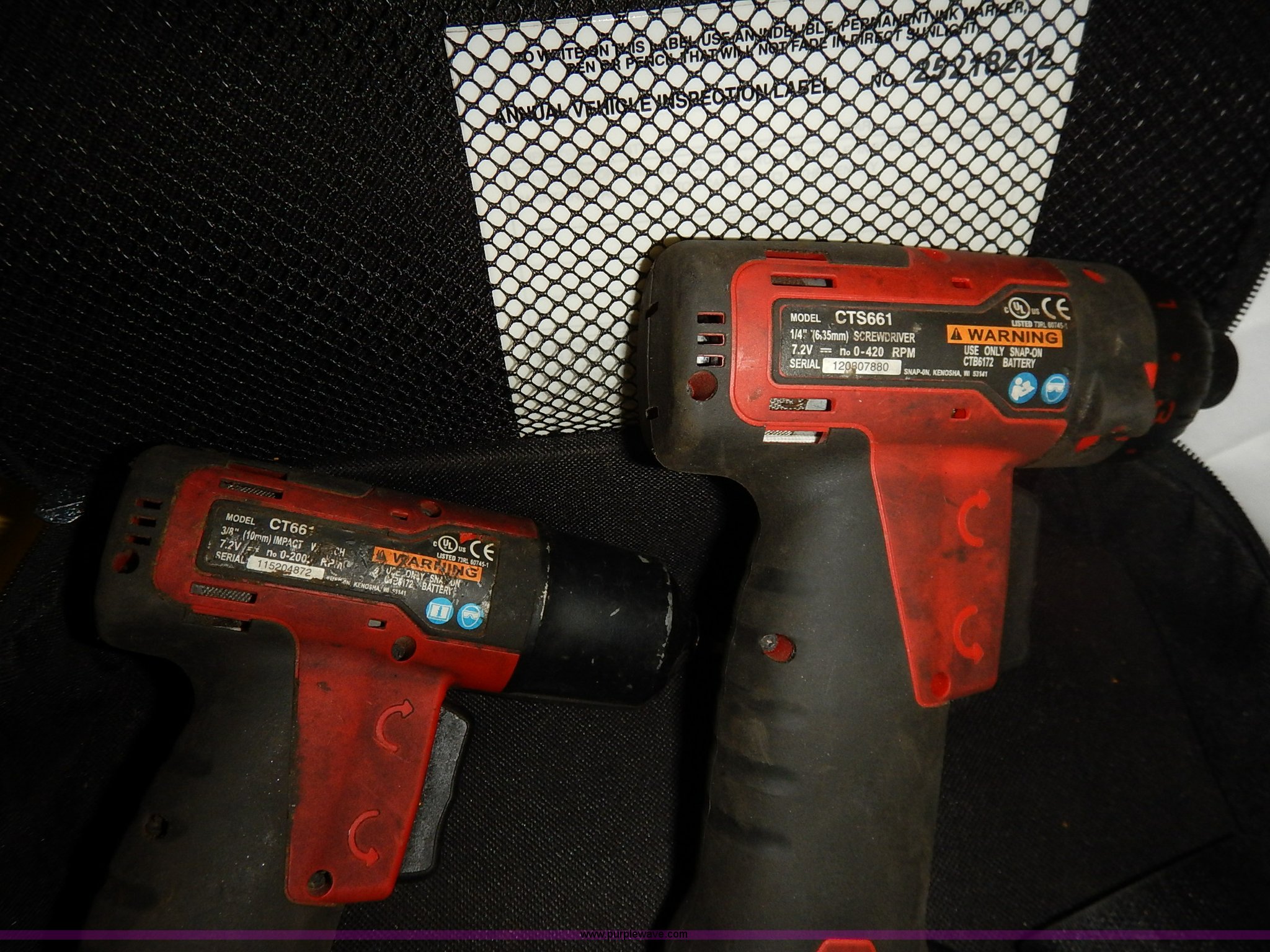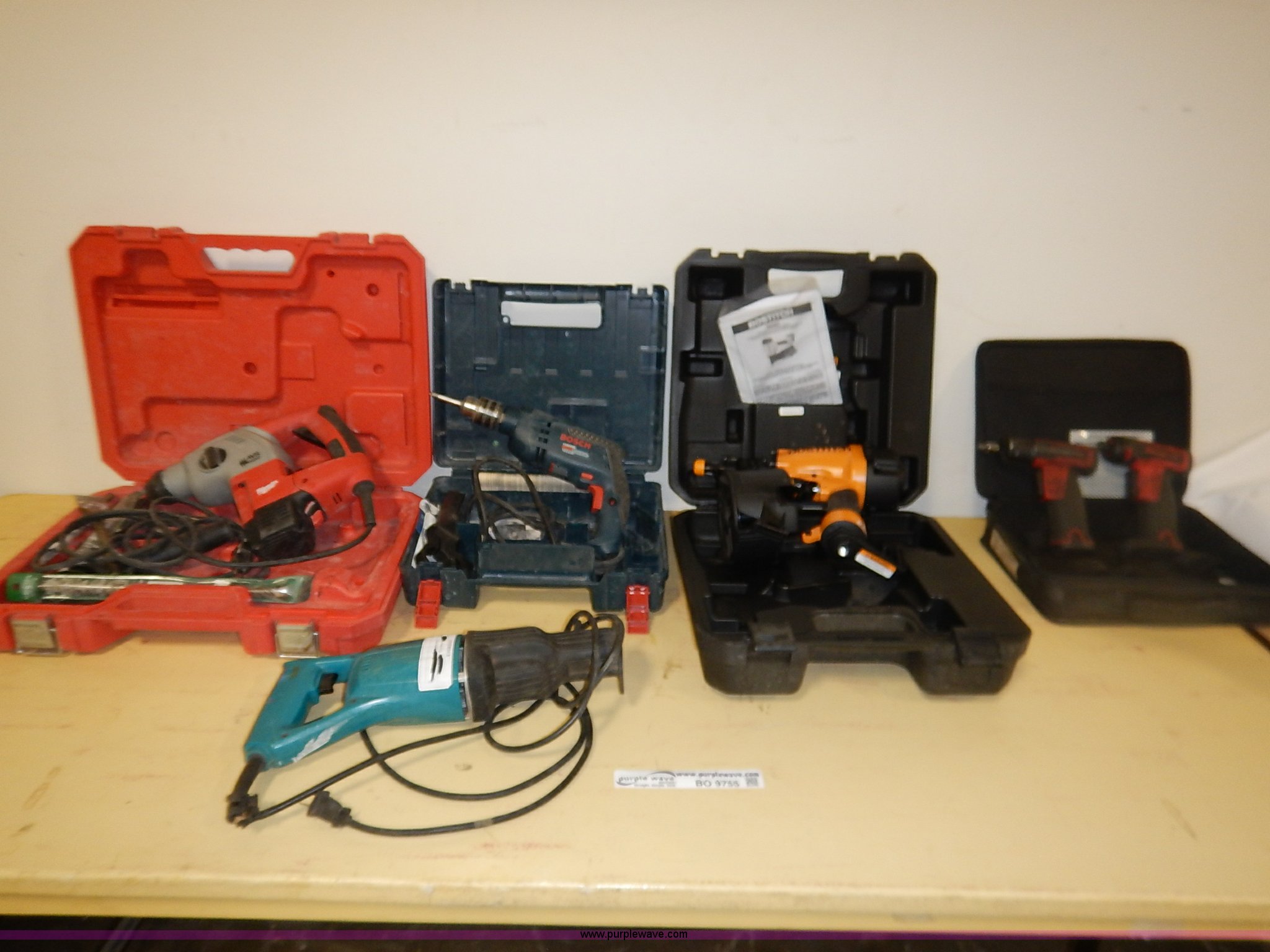 Purple Wave is selling a used Tools in Kansas. This item is a (6) assorted hand tools with the following: Milwaukee electric rotary hammer, (7) masonry bits, Bosch 1191VSR 1/2" electric drill, (9) bits, Bostitch coil fed pneumatic air nailer, Snap-On CTS661 1/4" screw driver, Battery operated, Snap-On CT661 3/8" impact wrench, Makita electric reciprocating saw