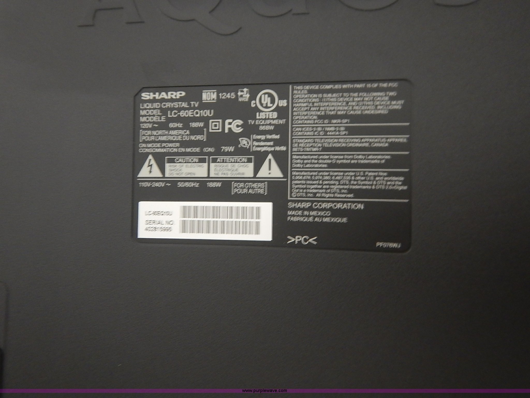 Purple Wave is selling a used Electronics in Kansas. This item is a Sharp 60" liquid crystal flatscreen television with the following: Model LC-60EQ10U, Stand, Power cord, Remote, Powers on