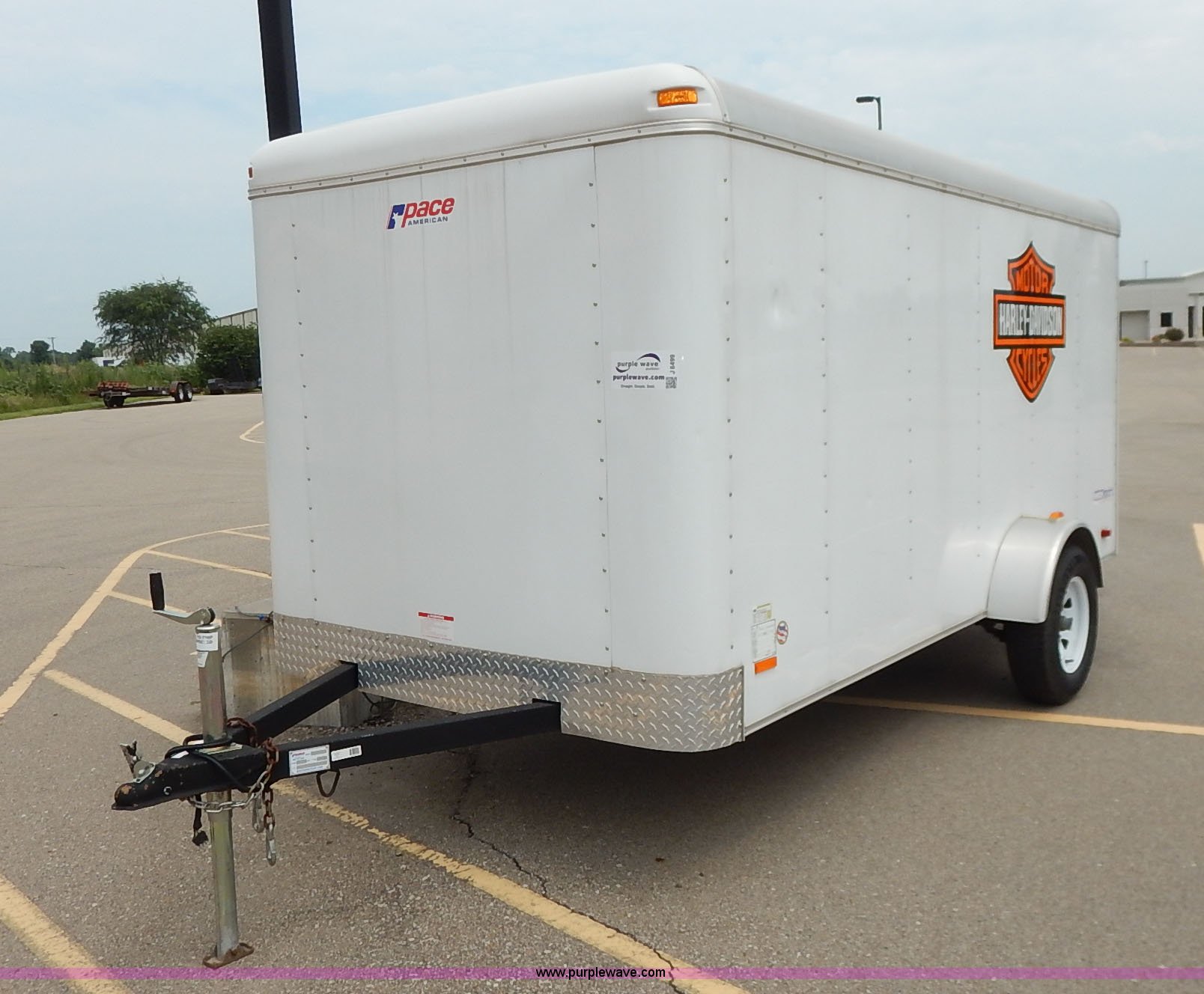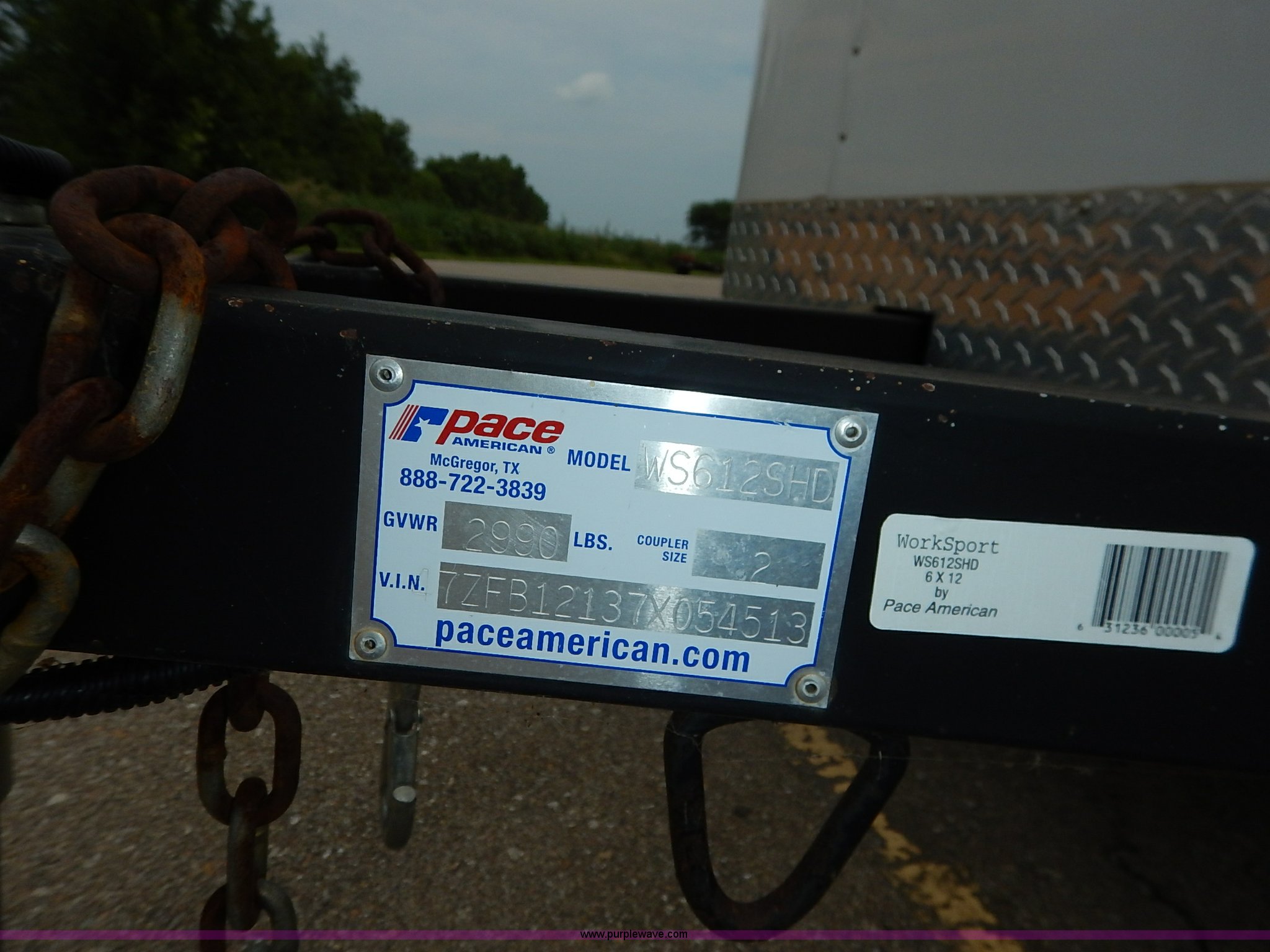 Purple Wave is selling a used Enclosed Cargo Trailer in Kansas. This item is a 2007 Pace WS612SHD enclosed cargo trailer with the following: 12'L x 6'W, 67"H interior, Wood floor, Side entry door, Fold down rear door, 2" ball hitch, Lights, Safety chains, 205/75D14 tires, GVWR 2,990 lbs