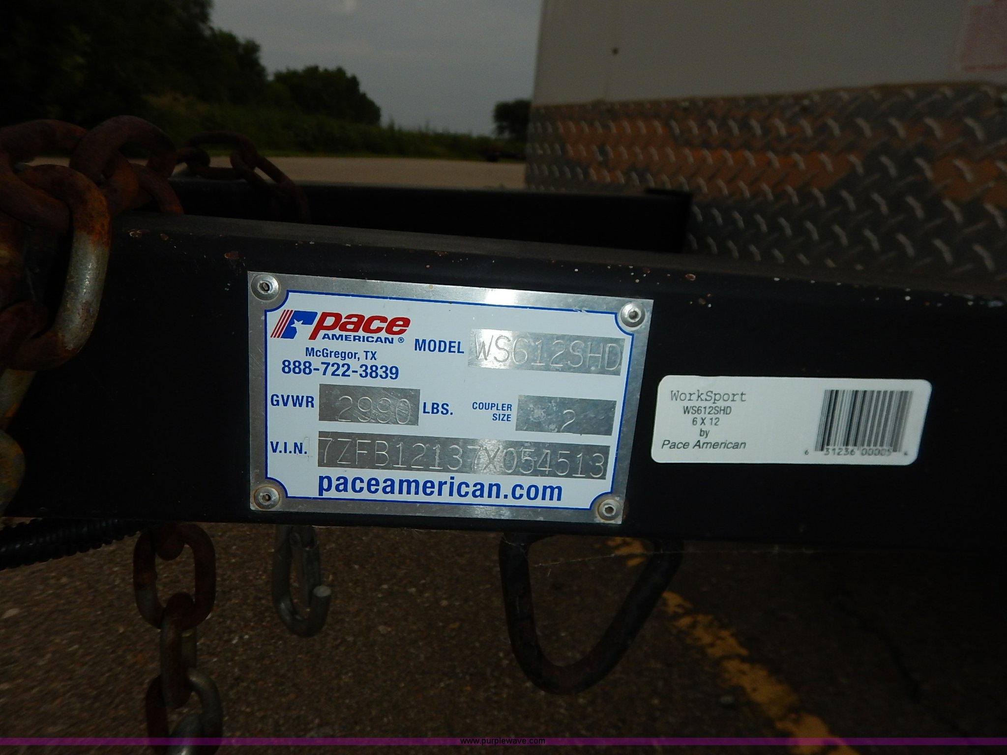 2007 Pace WS612SHD enclosed cargo trailer. 12'L x 6'W, 67"H interior, Wood floor, Side entry door, Fold down rear door, 2" ball hitch, Lights, Safety chains, 205/75D14 tires, GVWR 2,990 lbs. 47ZFB12137X054513. 825 Levee Dr.. Manhattan, KS 66502