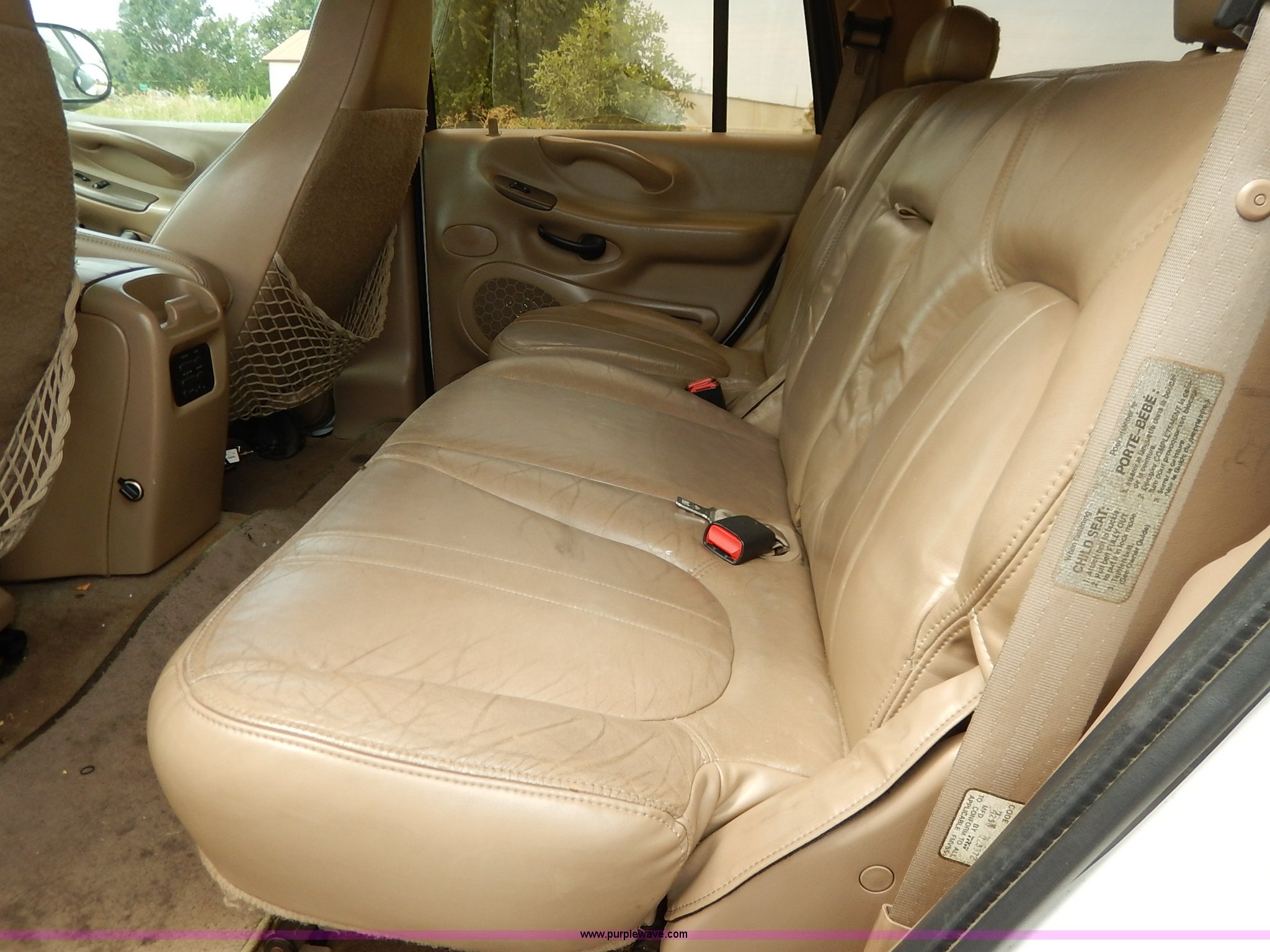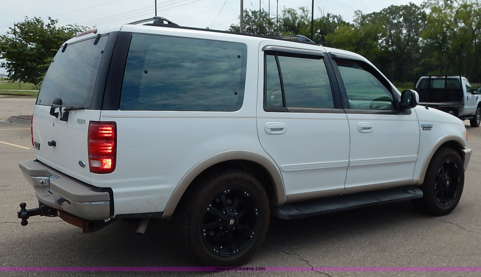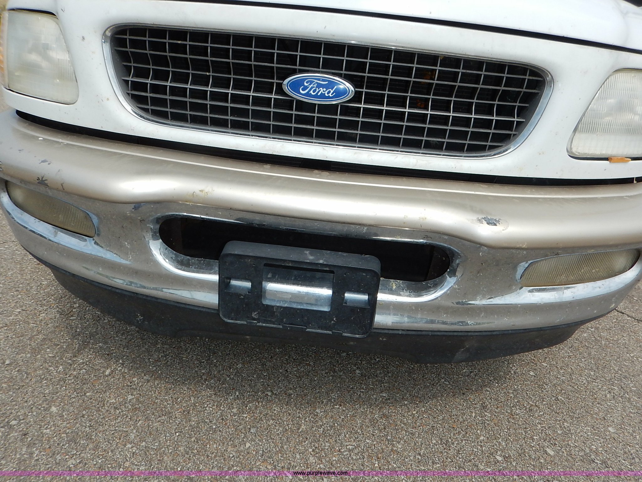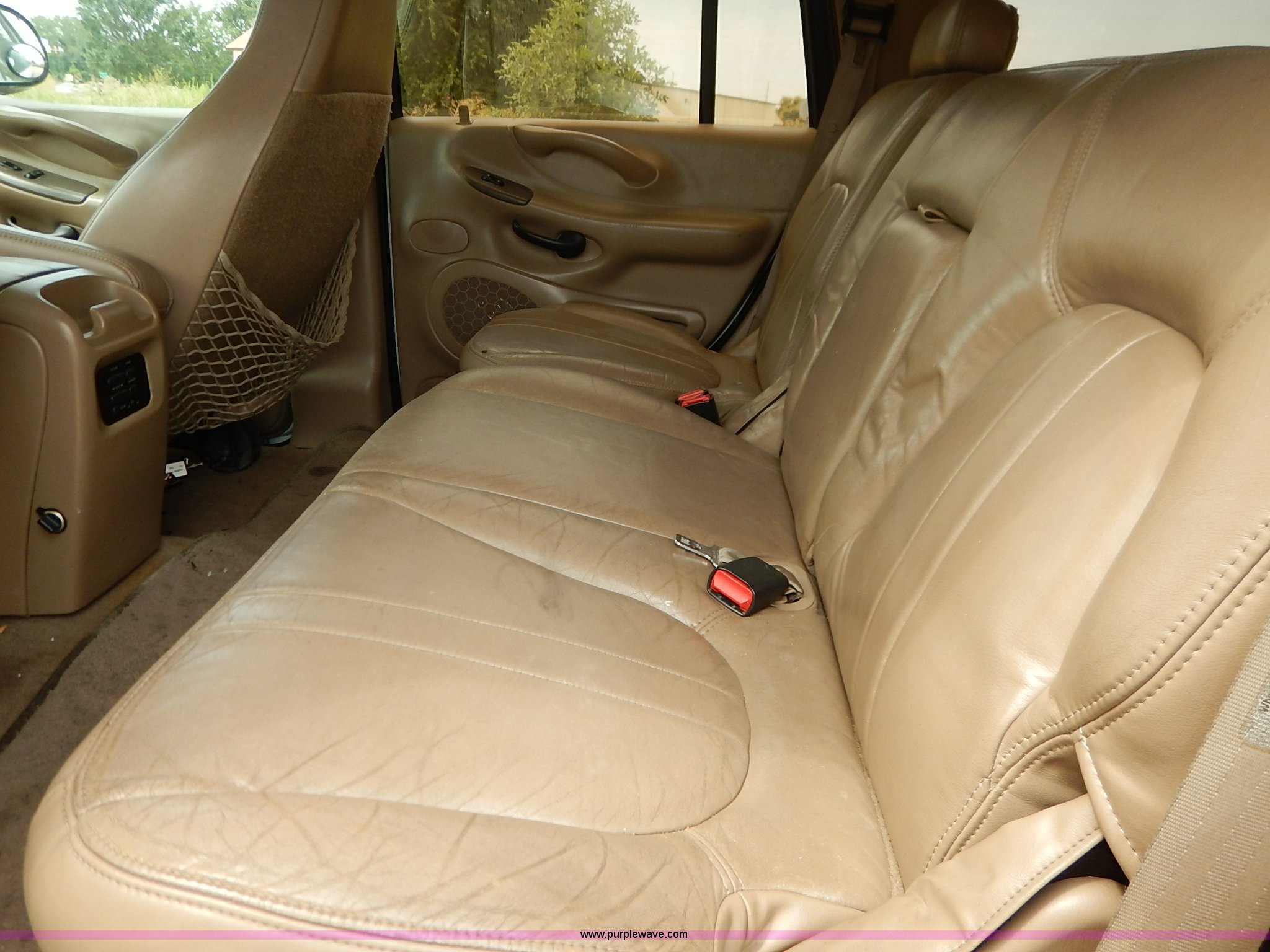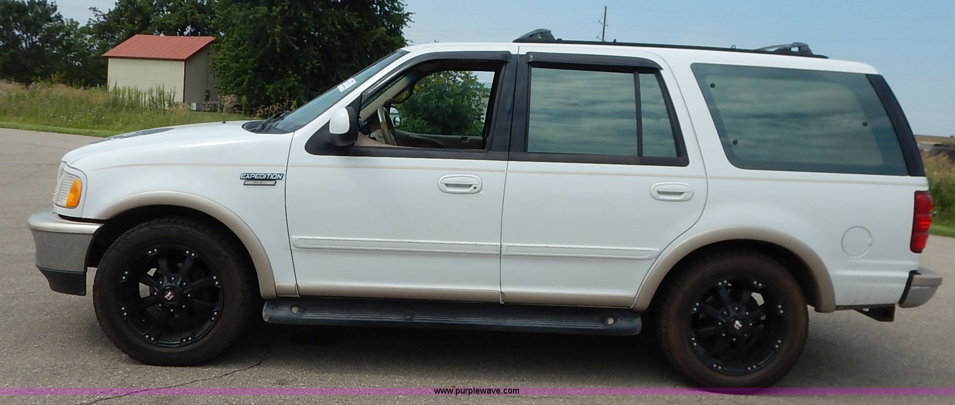 Purple Wave is selling a used Passenger Vehicle in Kansas. This item is a 1997 Ford Expedition Eddie Bauer SUV with the following: 140,914 miles on odometer, Non-operational odometer, 5.4L V8 SOHC 16V gas engine, Automatic transmission, AC and heat, Non-operational AC, Tilt, Cruise, AM/FM/CD, Power windows, locks, mirrors, and seats, Leather interior, Speaker box and amp, Rosen entertainment screen, Window vent visors, Luggage rack, Running boards, Hood decals, Three way ball hitch, No keys, Receiver hitch, Trailer wiring, 215/55R20 tires, Interior/exterior cosmetic damage, Check engine light on, Cracked windshield, Paint peeling, Dents, Scratches