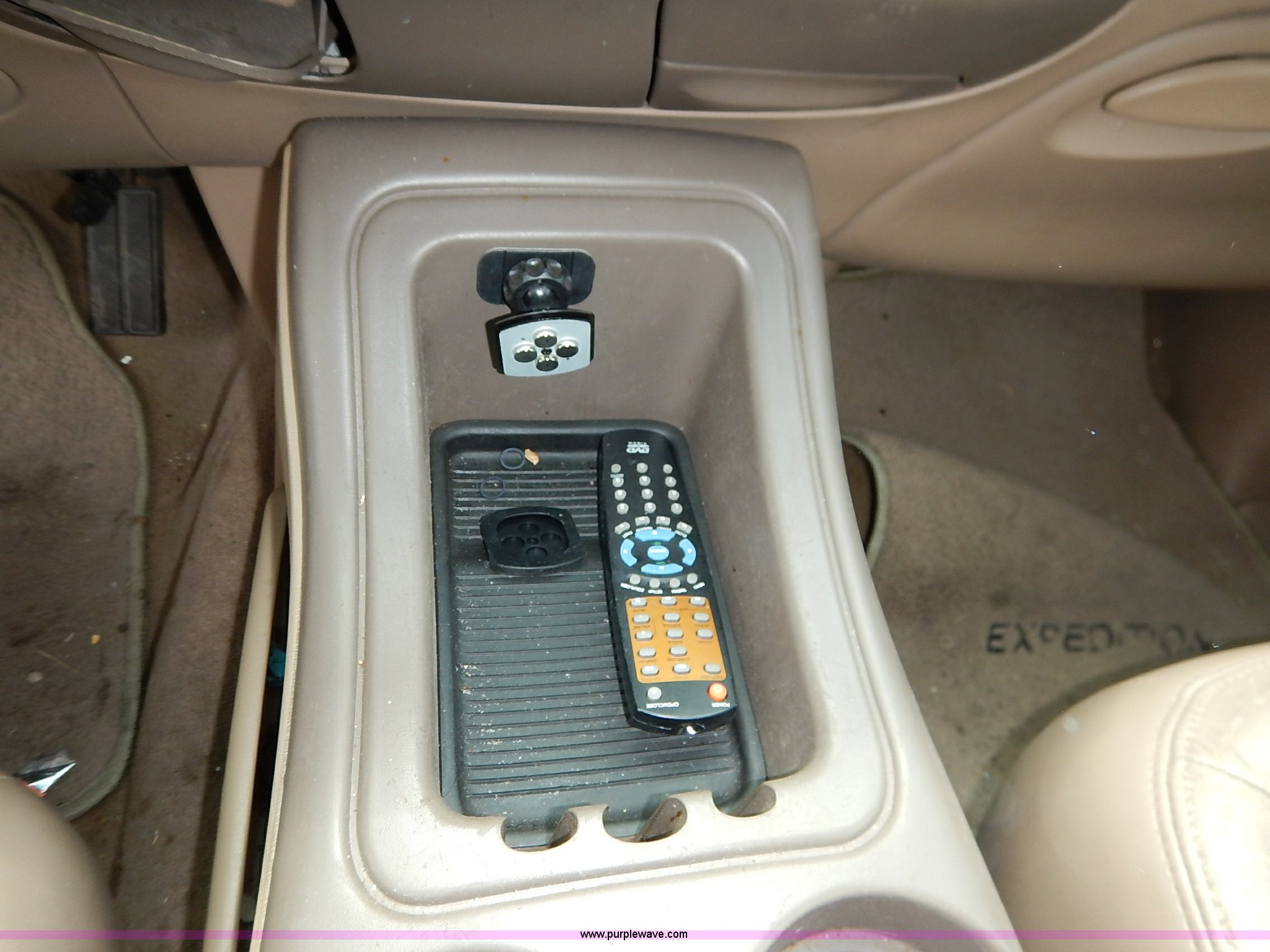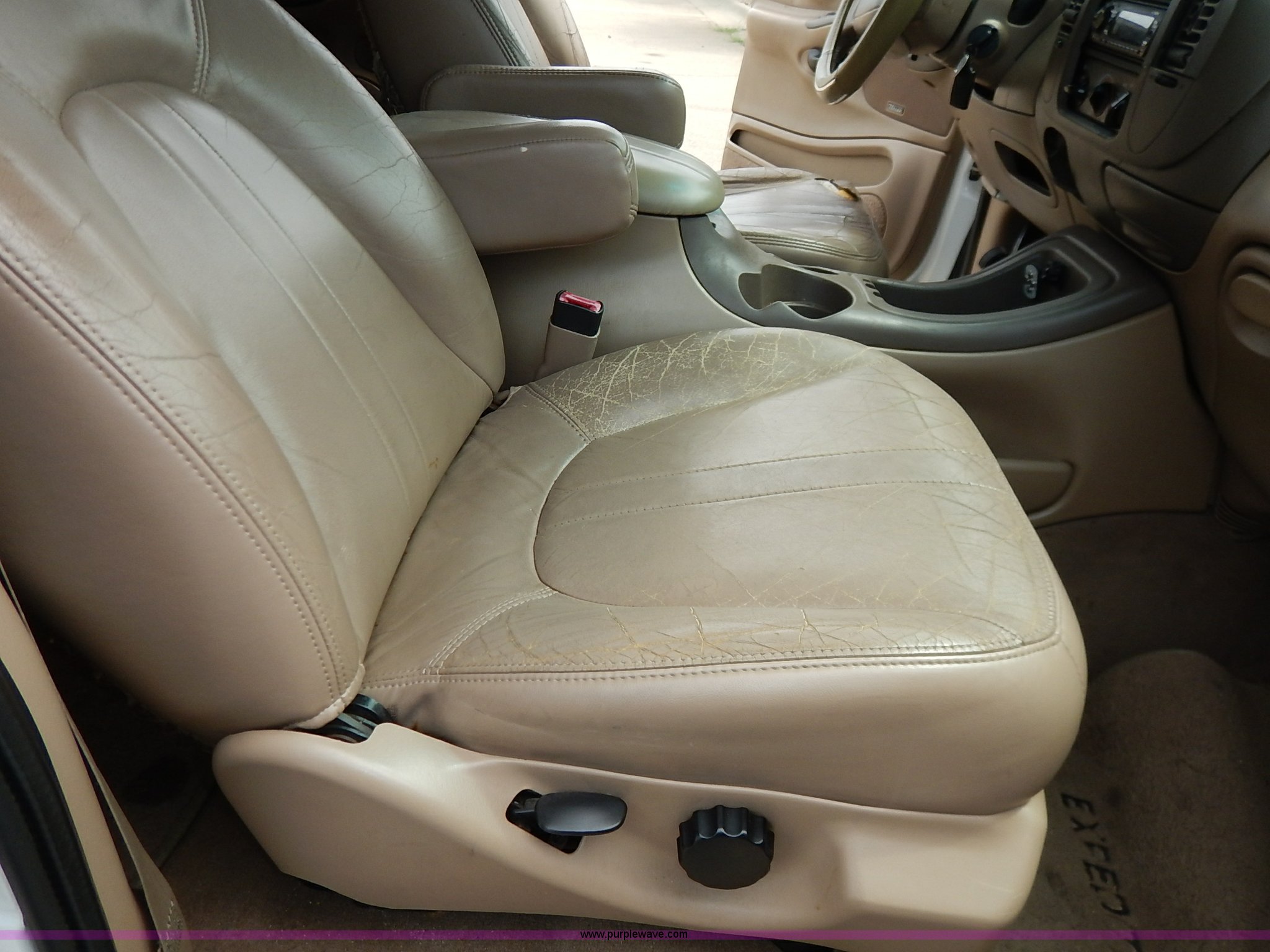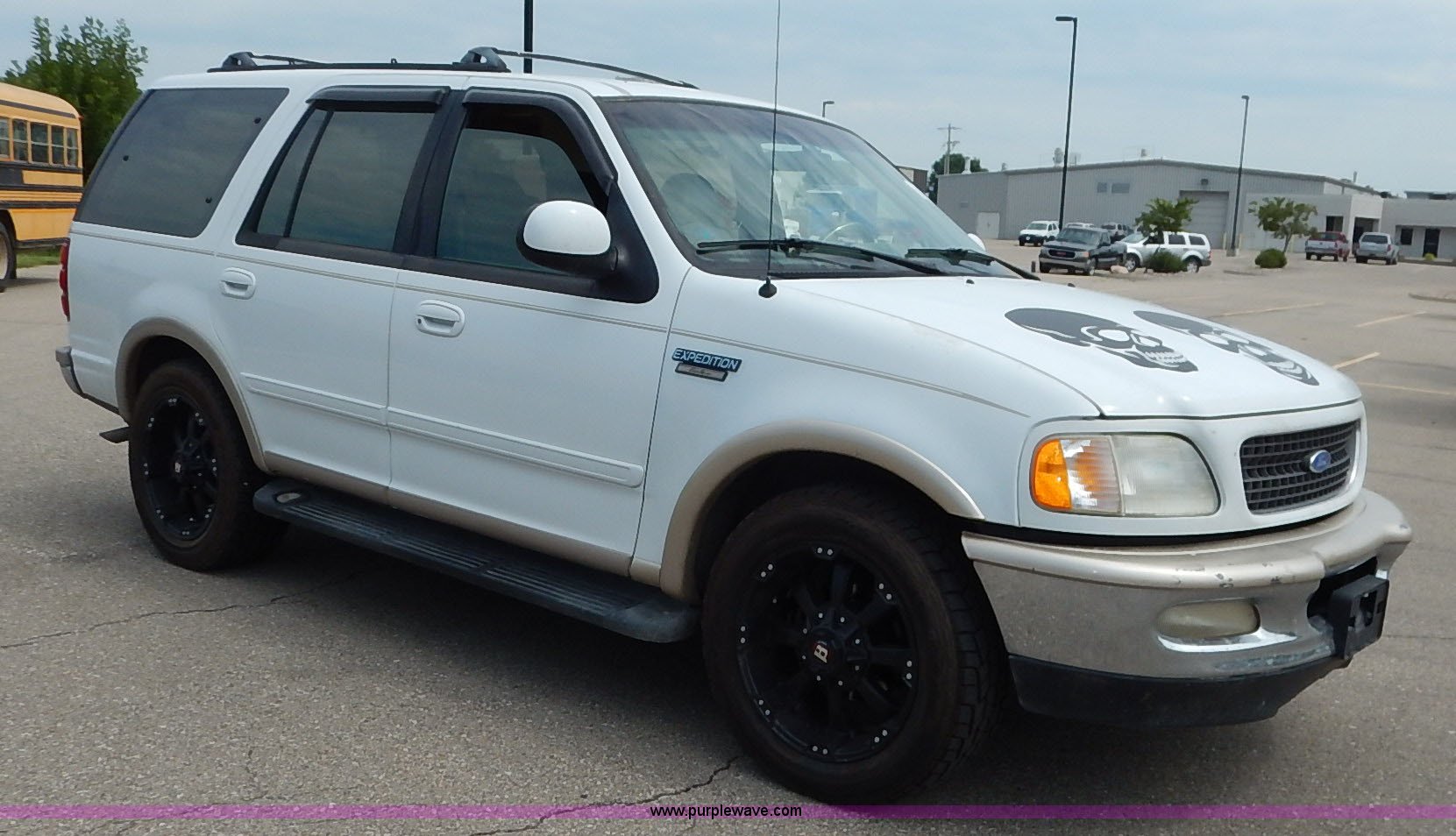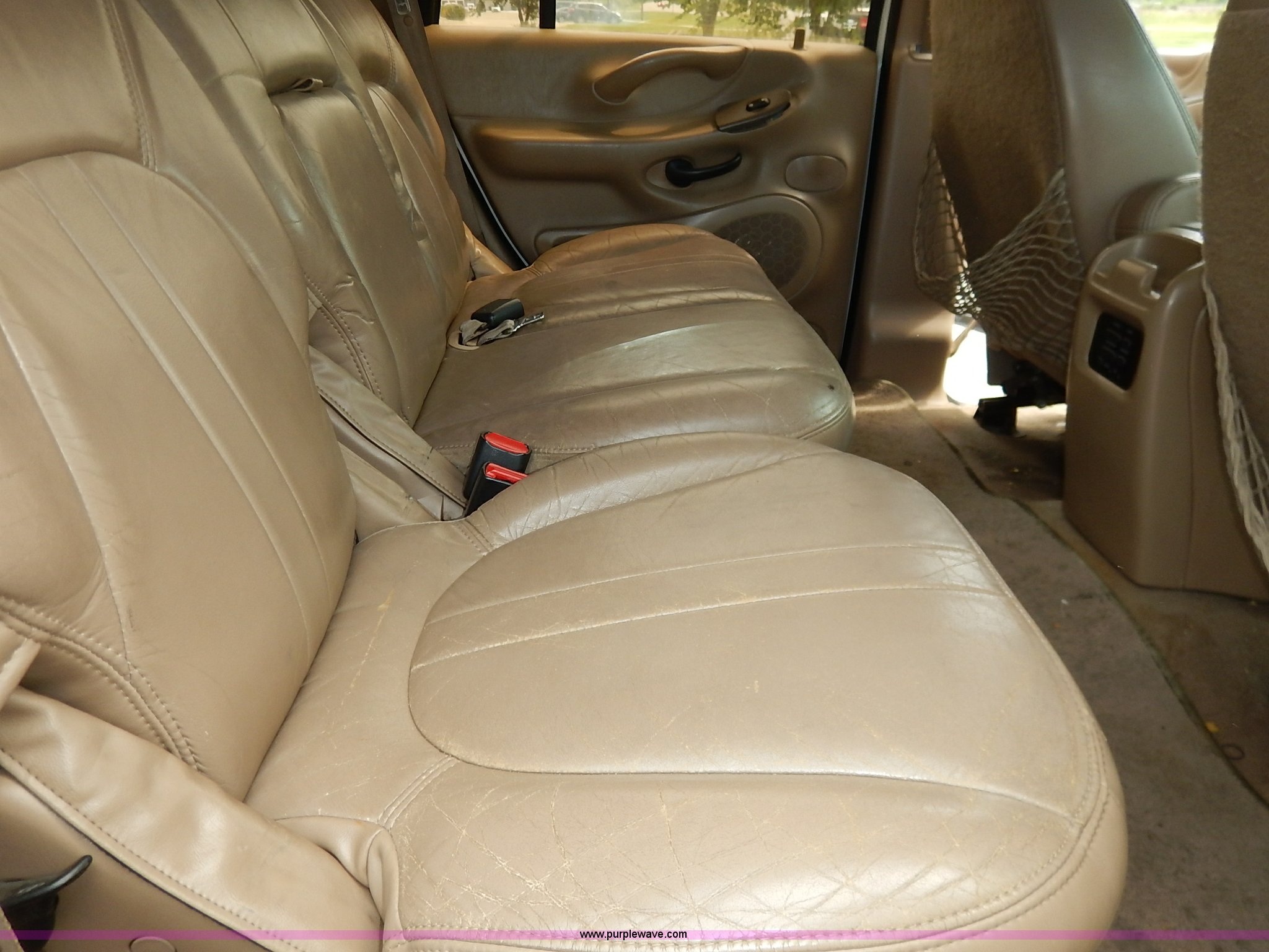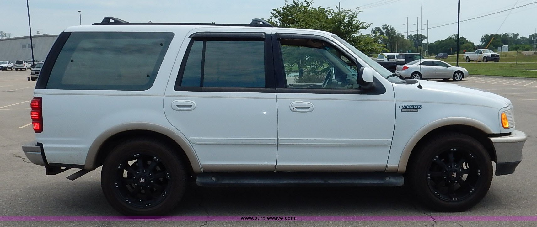 Purple Wave is selling a used Passenger Vehicle in Kansas. This item is a 1997 Ford Expedition Eddie Bauer SUV with the following: 140,914 miles on odometer, Non-operational odometer, 5.4L V8 SOHC 16V gas engine, Automatic transmission, AC and heat, Non-operational AC, Tilt, Cruise, AM/FM/CD, Power windows, locks, mirrors, and seats, Leather interior, Speaker box and amp, Rosen entertainment screen, Window vent visors, Luggage rack, Running boards, Hood decals, Three way ball hitch, No keys, Receiver hitch, Trailer wiring, 215/55R20 tires, Interior/exterior cosmetic damage, Check engine light on, Cracked windshield, Paint peeling, Dents, Scratches