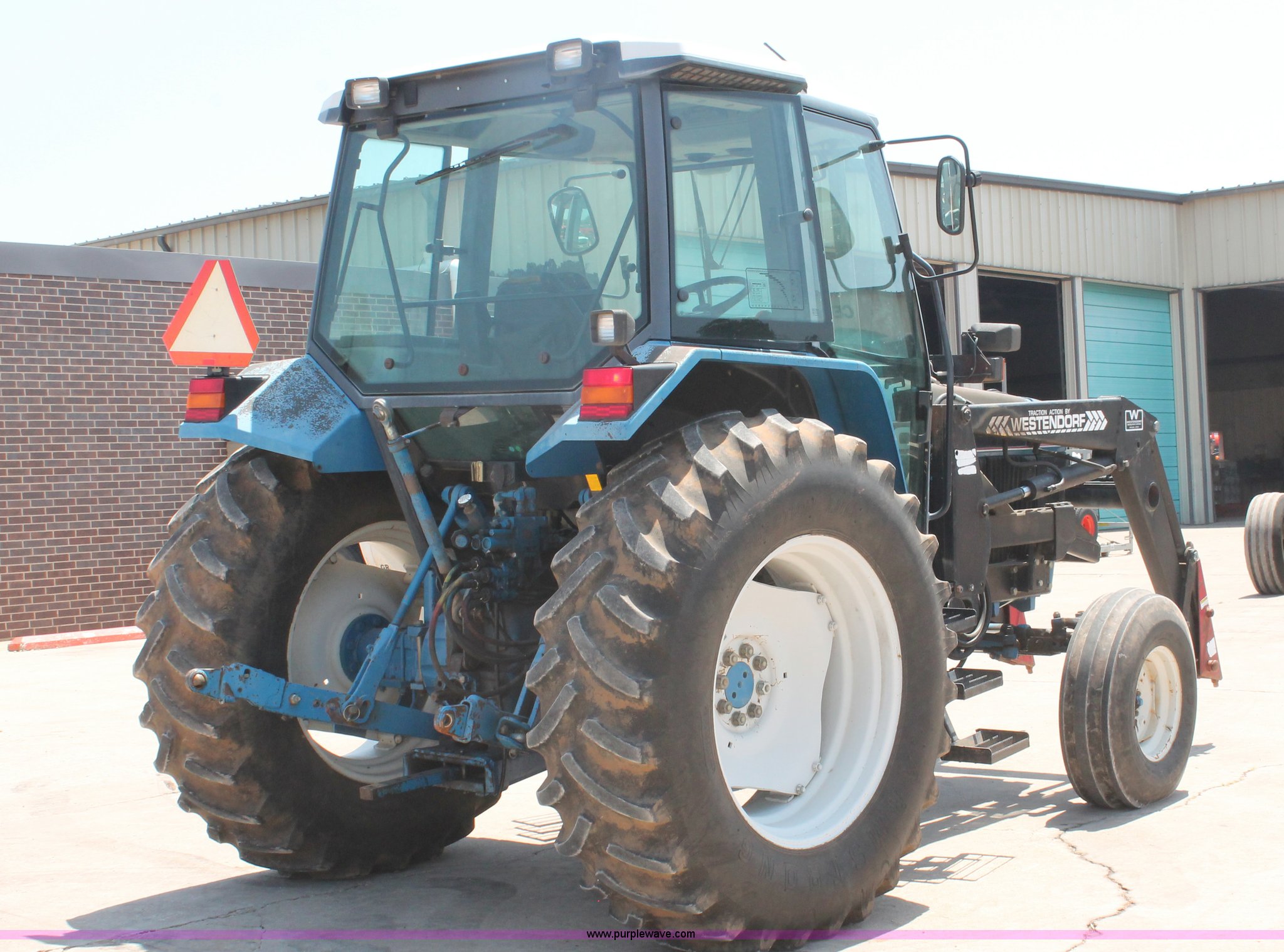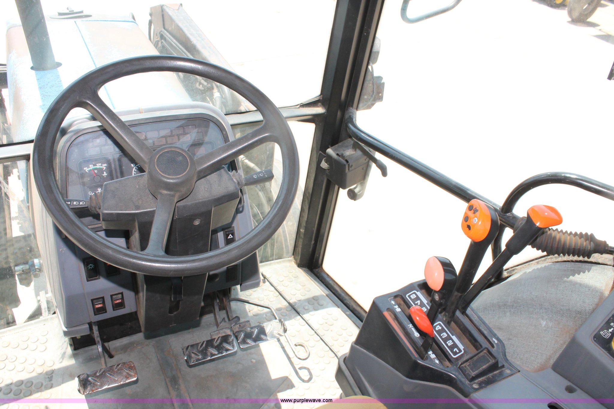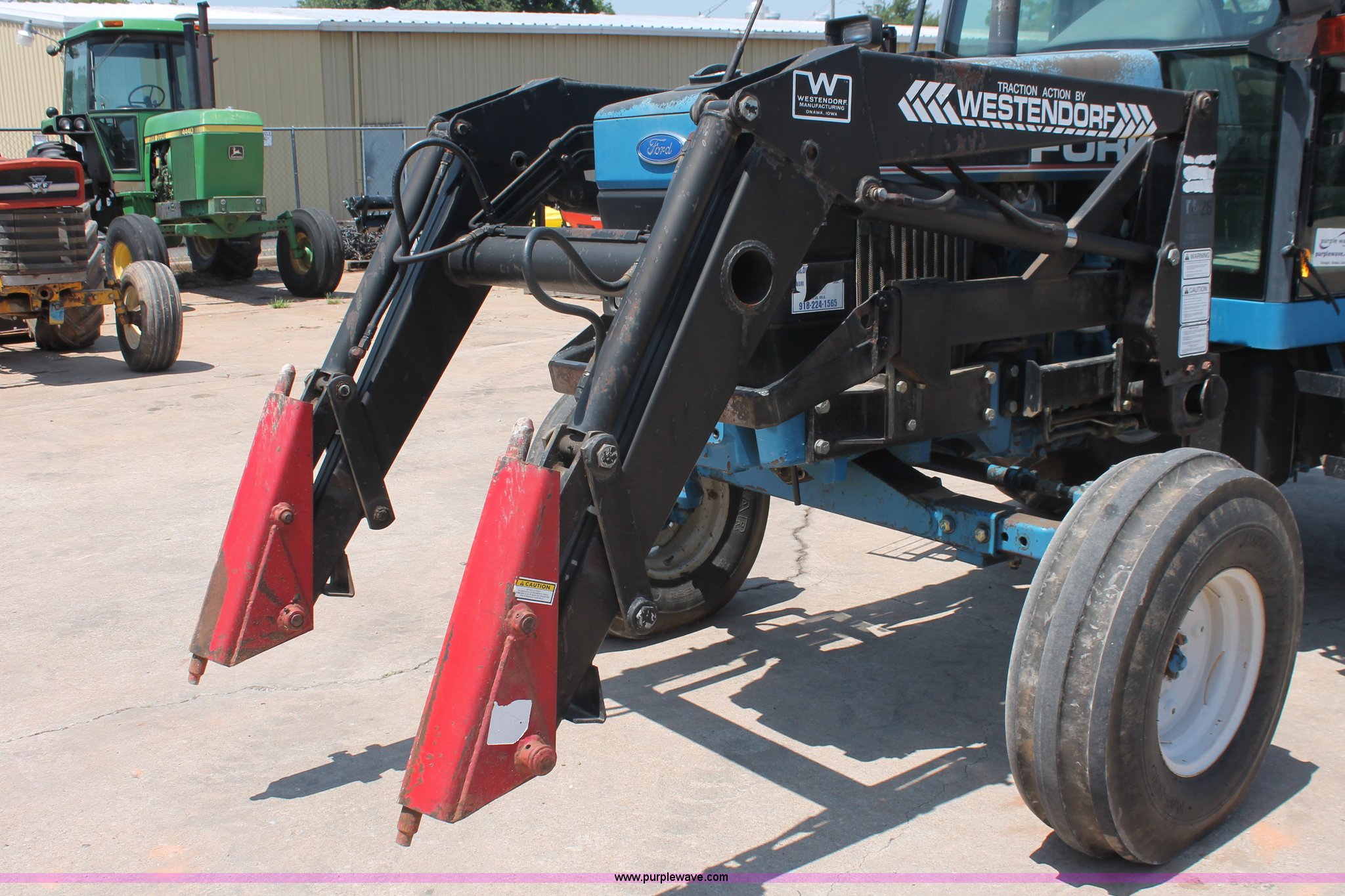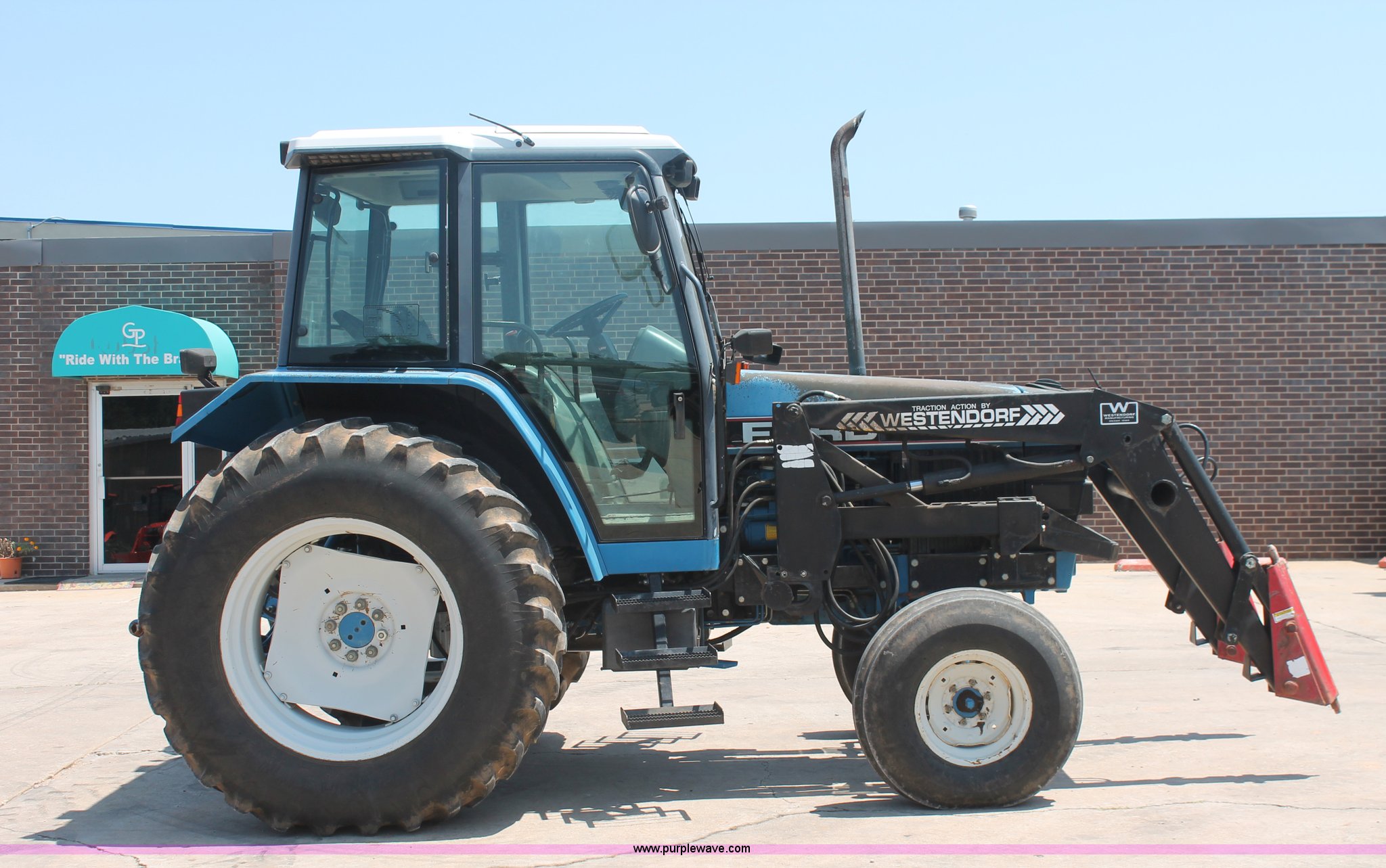 Purple Wave is selling a used Tractor in Oklahoma. This item is a 1994 Ford 6640 tractor with the following: 3,874 hours on meter, Ford 5.0L four cylinder diesel engine, Electroshift Pulse Command powershift transmission, 16F-16R gears, Differential lock, AC and heat, Non-operational AC, Tilt steering wheel, AM/FM/cassette, Suspension seat, Shades, Westendorf TA-26 loader, Two-lever controls, Three point, Top link, Seven pin outlet, 540/1000 PTO, Draw bar, (2) rear hydraulic remote sets, 93" wheelbase, 10.00-16SL front tires, 18.4-34 rear tires, Serial BD20436